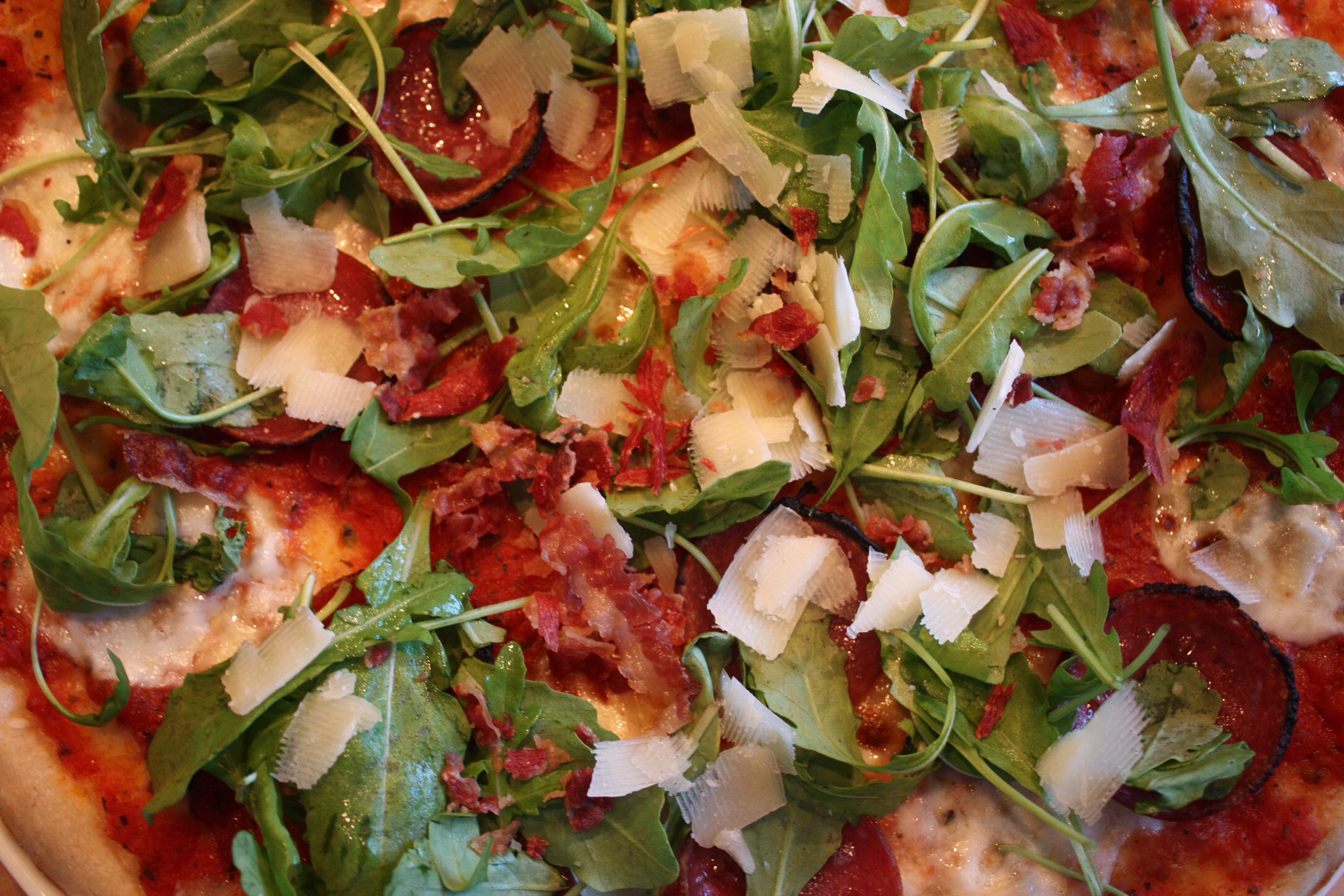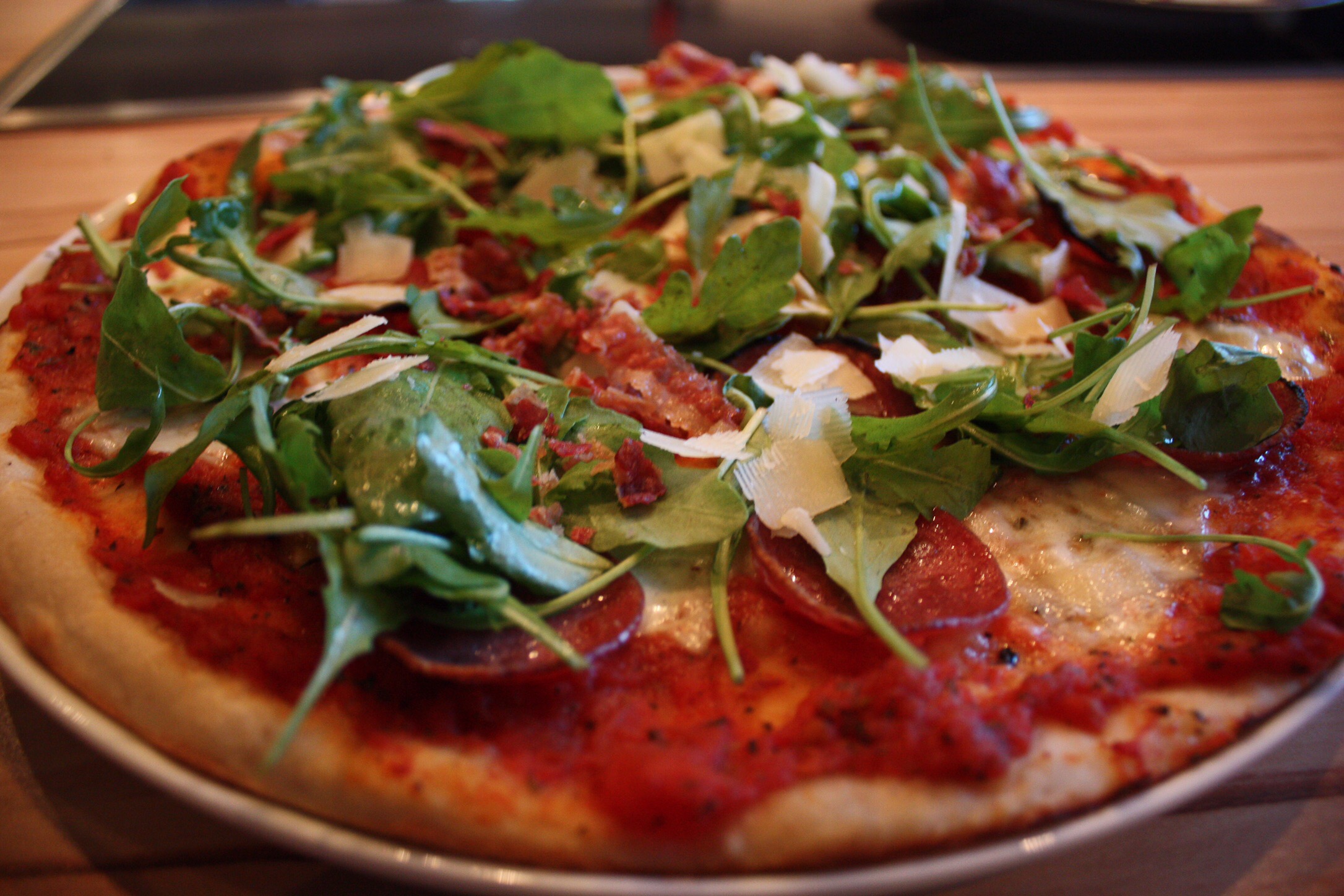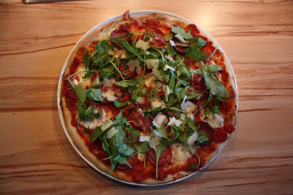 Belegt habe ich die Pizza neben der obligatorischen Tomatenssuce mit Mozzarella und etwas Salami. Nach dem Backen habe ich noch etwas Rucola, Parmesanspäne und krosse Baconchips hinzugefügt.