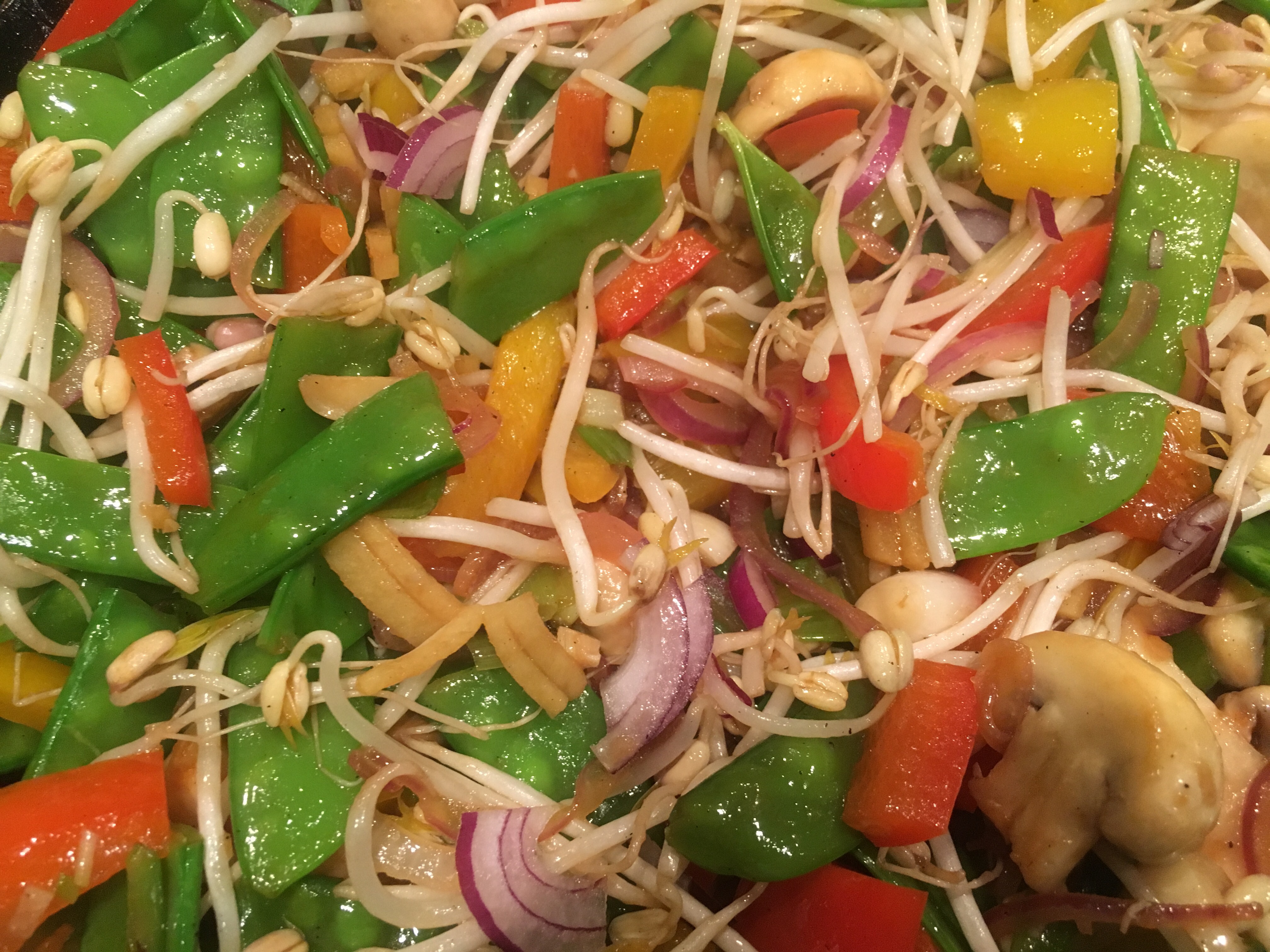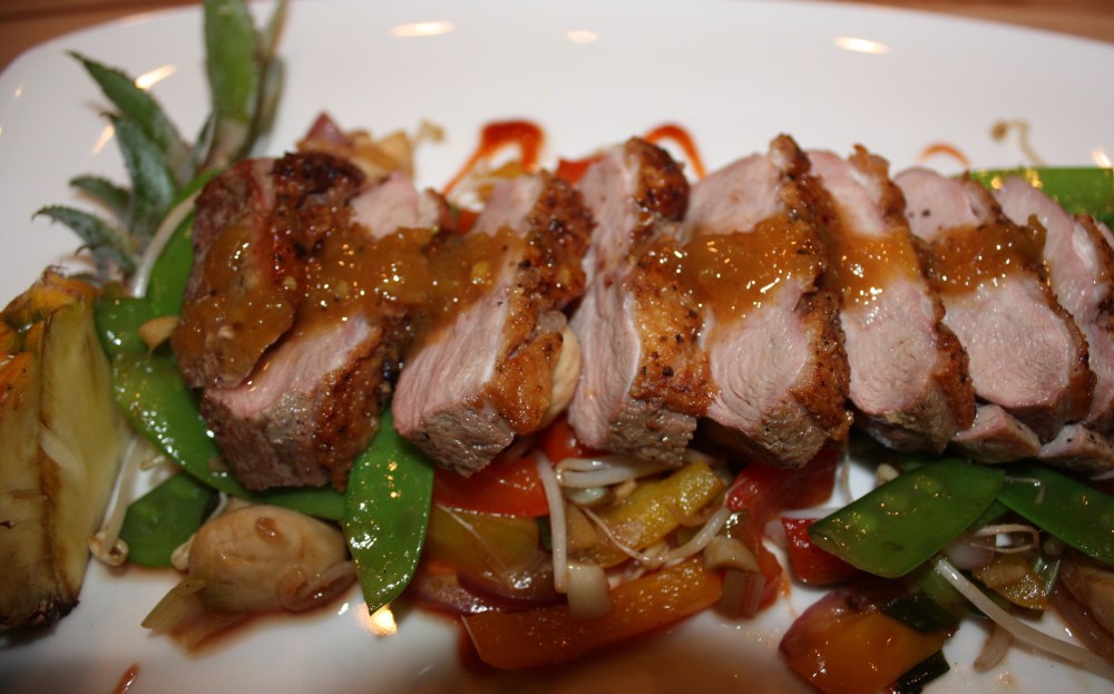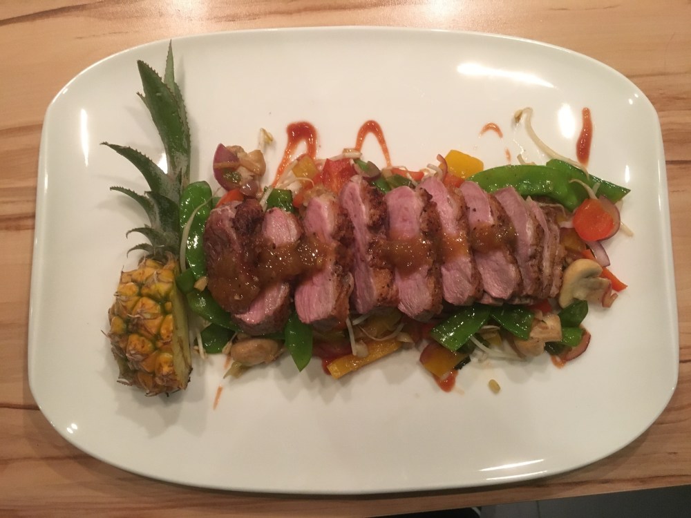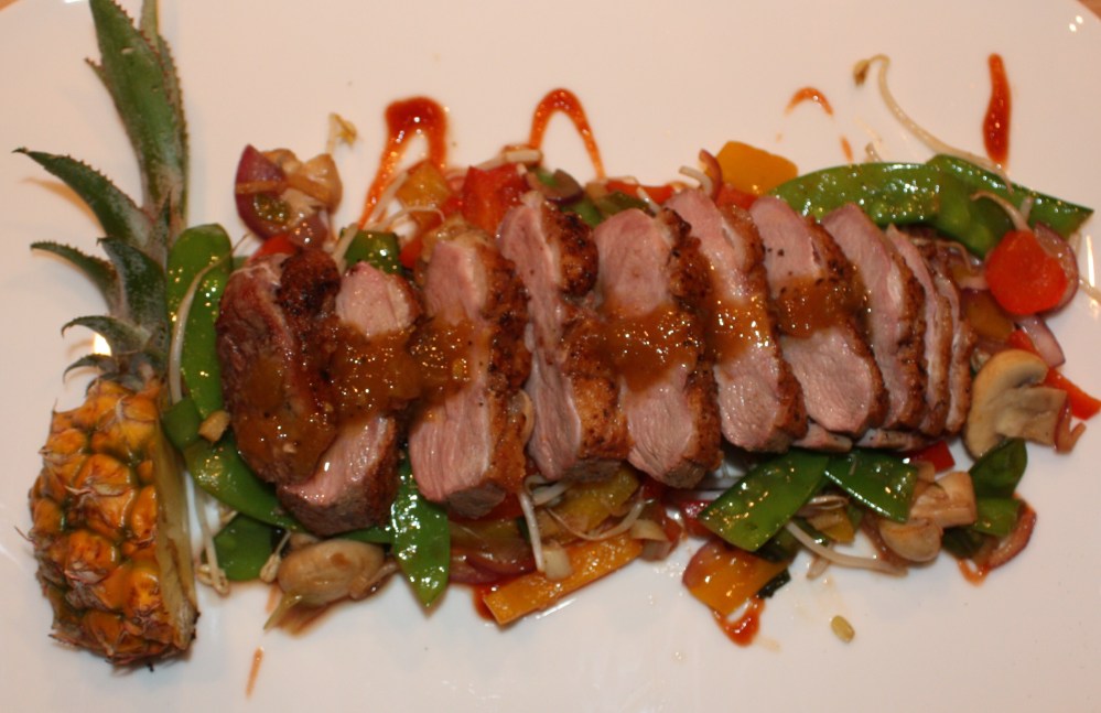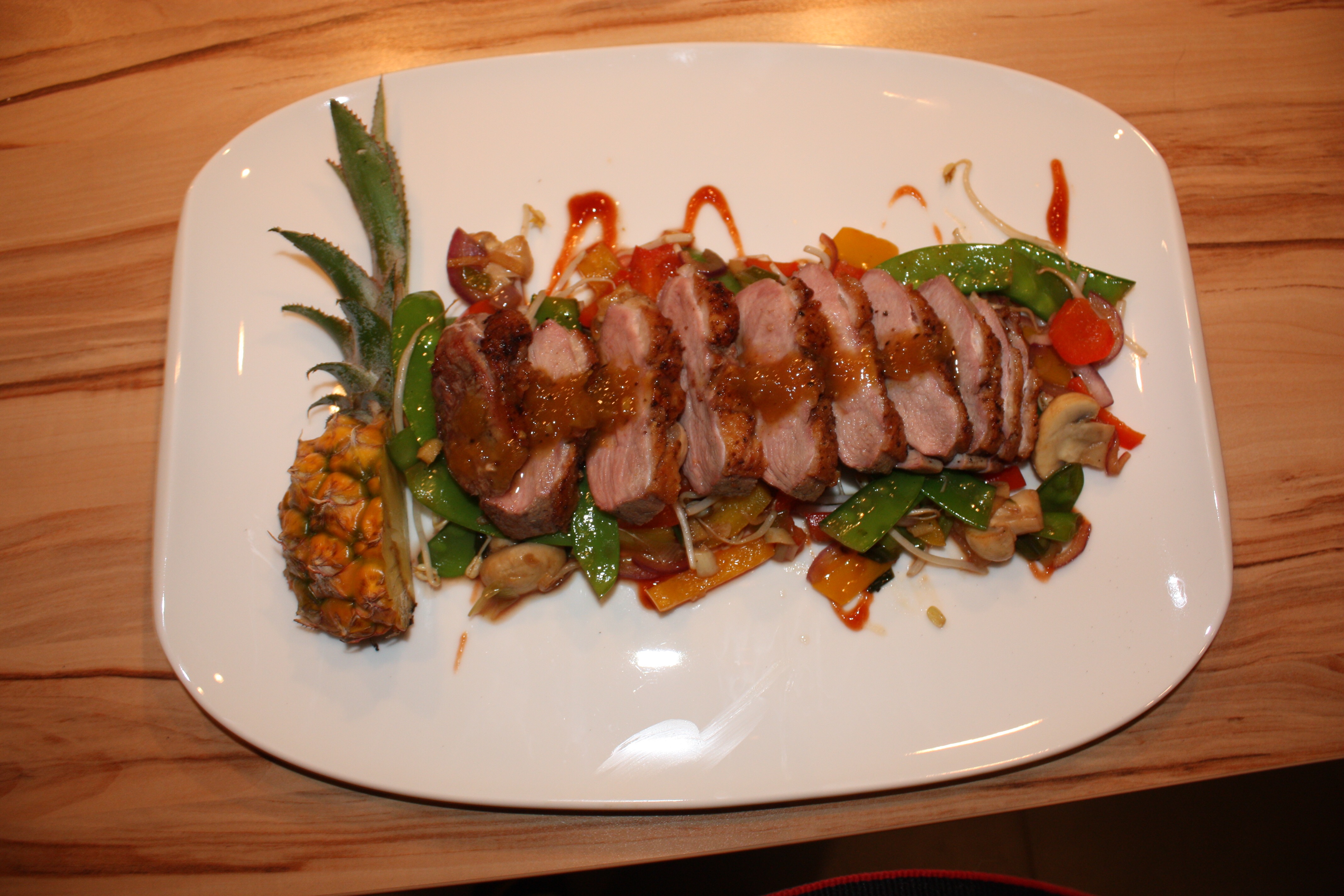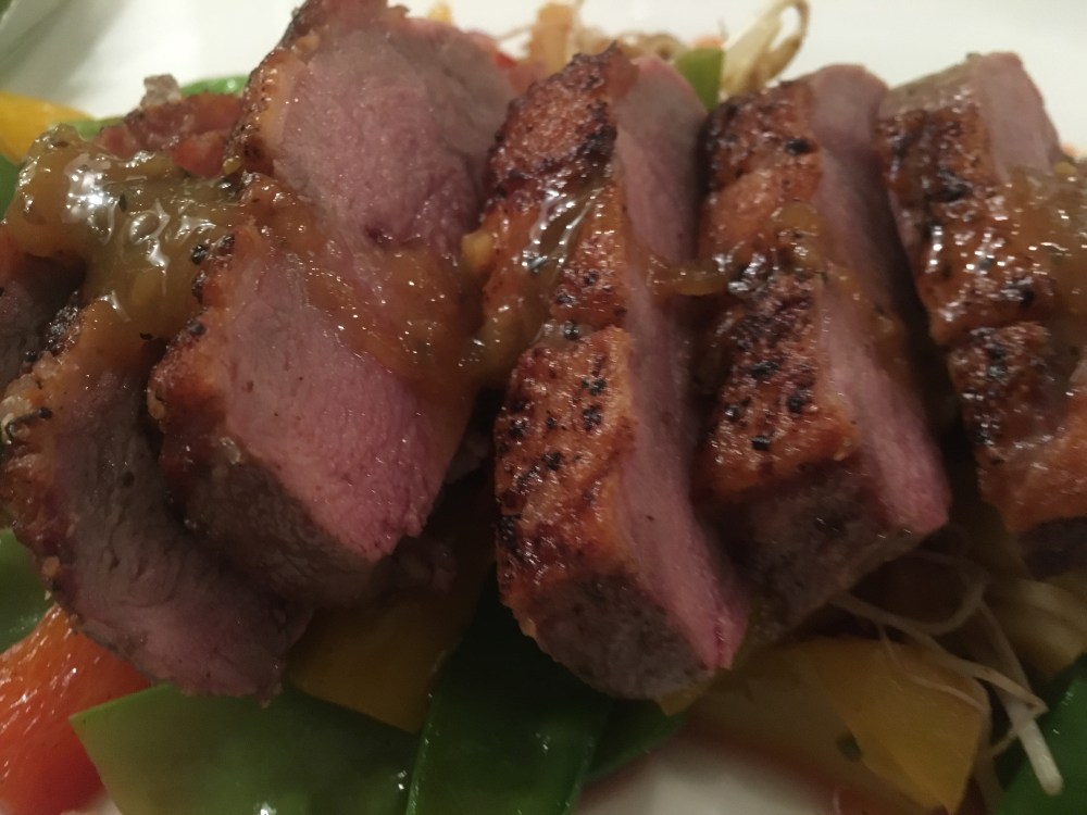 Gewürzt wurde es mit Teriyakisauce und Sesamöl.Die Entenbrüste habe ich in Trancen geschnitten, auf dem Wokgemüse angerichtet und mit der leckeren „Garlic Rosmary Citrus Sauce“ von Stonewall Kitchen garniert.Sehr lecker!Die Haut der Entenbrüste war richtig kross und das Fleisch sehr saftig und zart.zusammen mit dem knackigem Gemüse eine echte Delikatesse.