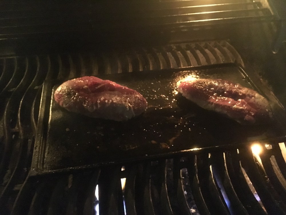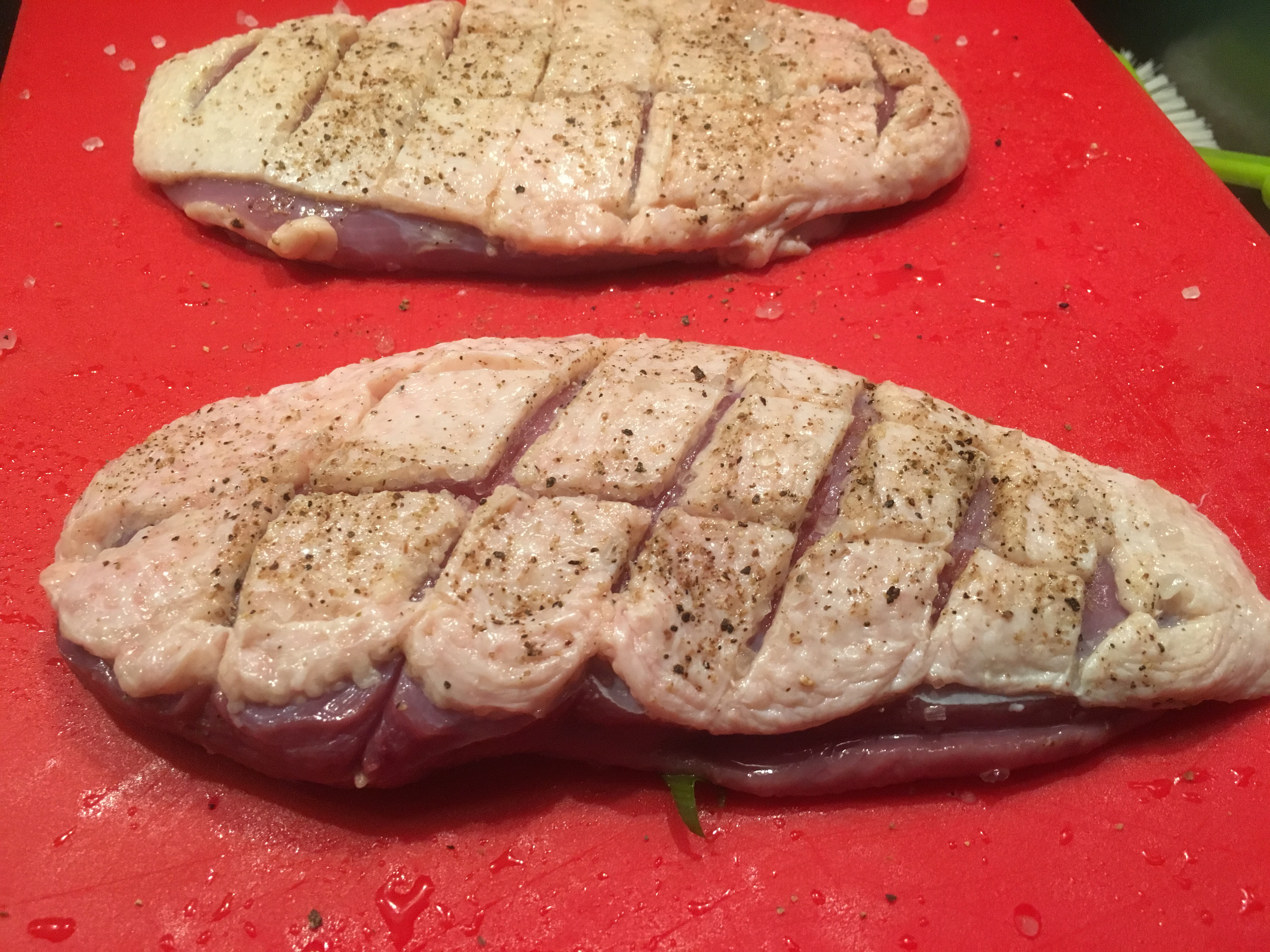 Eine knusprige Entenbrust auf knackigem Wokgemüse ist schon etwas Feines…Ich habe dazu zwei französische Barbarie Entenbrüste gewaschen, getrimmt und die Haut rautenförmig eingeschnitten.Nachdem sie mit Salz und Pfeffer gewürzt wurden, habe ich sie auf einer heißen Gussplatte im Napoleon Gasgrill zuerst auf der Hautseite ca.3 Minuten angebraten, bis diese Farbe angenommen hatte und kross war.