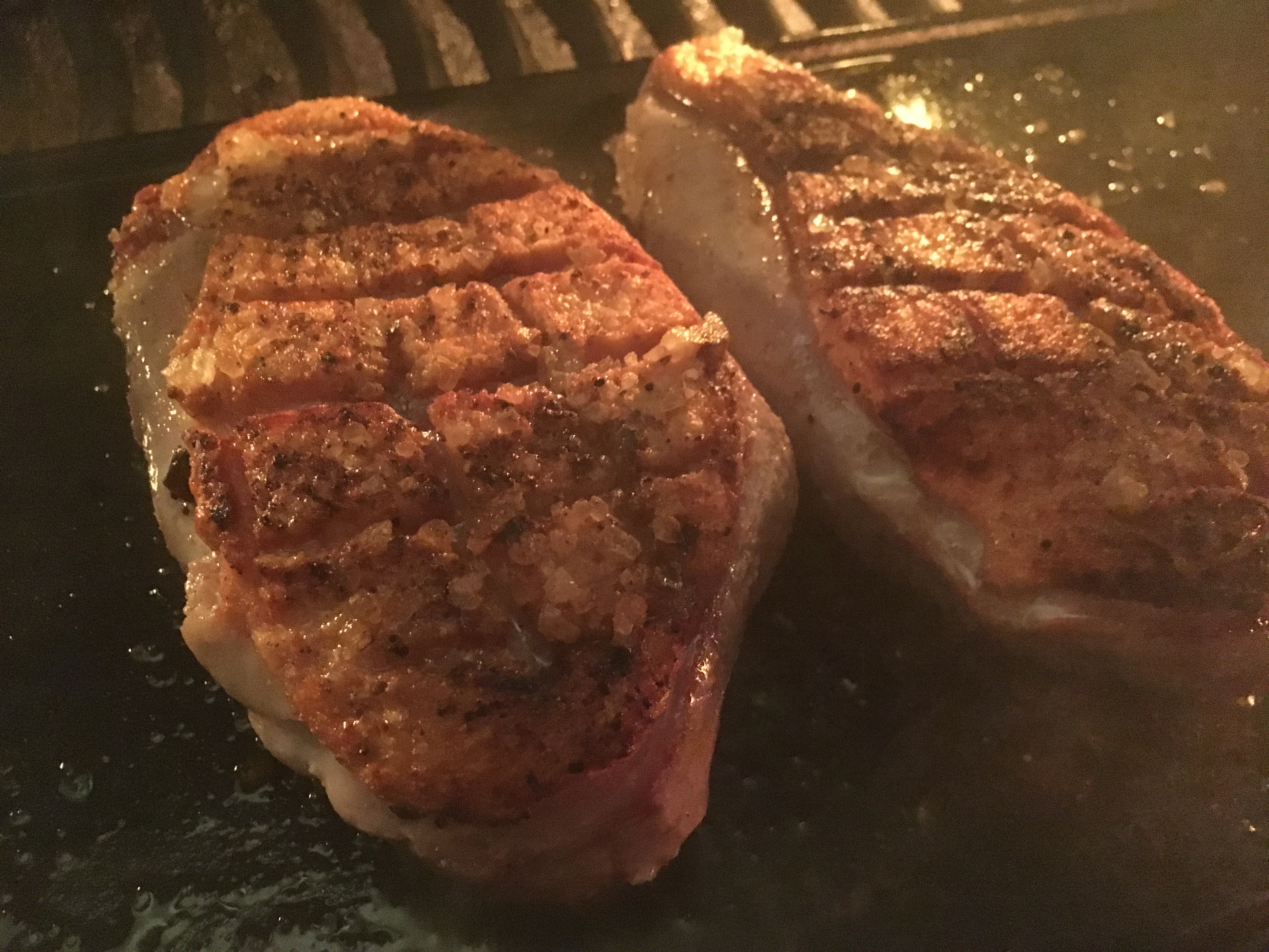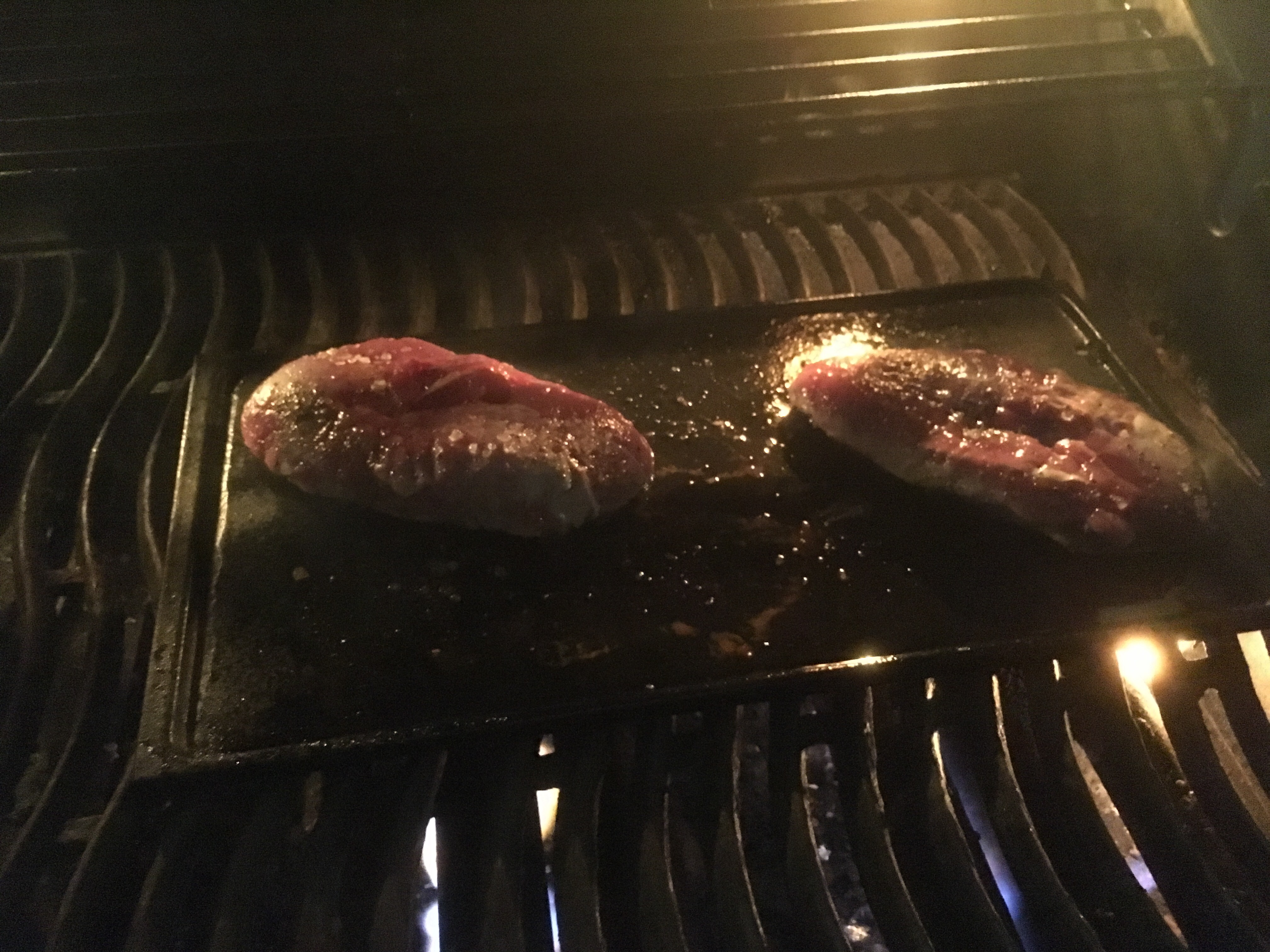 Danach wurden die guten Stücke gewendet und auf der anderen Seite ebenfalls 3 Minuten angebraten.Auf dem oberen Warmhalterost habe ich sie anschließend bis auf 63 Grad gezogen. Für das Wokgemüse wurden Paprika, Champignons, Zuckerschoten, Frühlingszwiebeln, Knoblauch und etwas Ingwer geputzt und in Stücke bzw. Würfel geschnitten und in einer heißen Eisenpfanne auf der Sizzle Zone knackig „gewokt“.