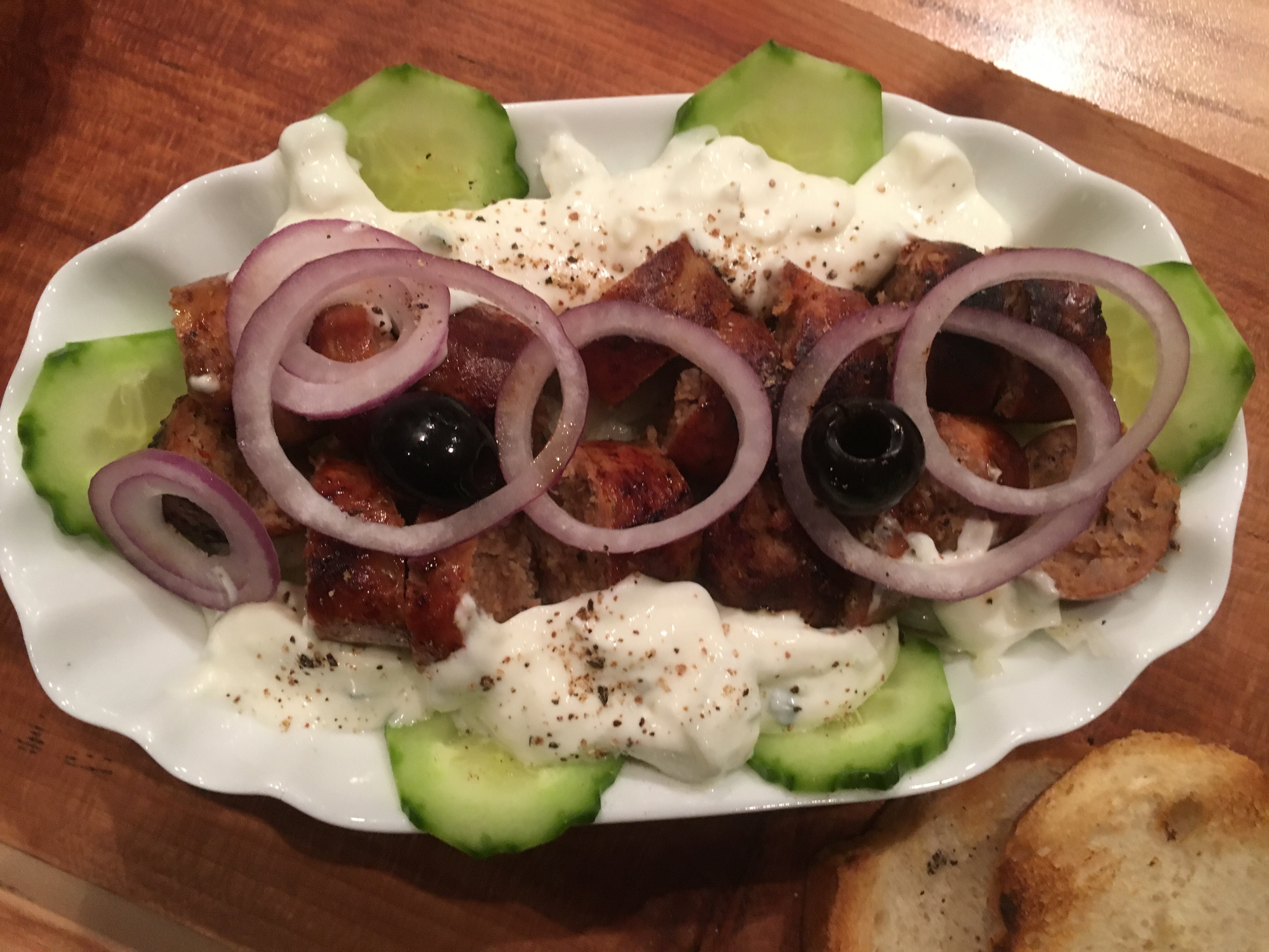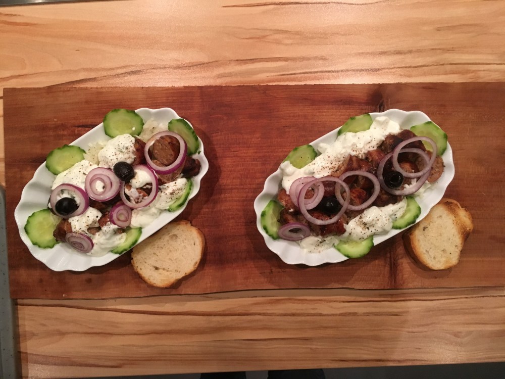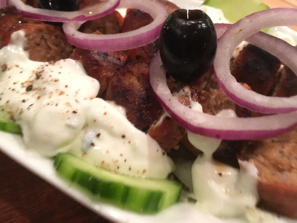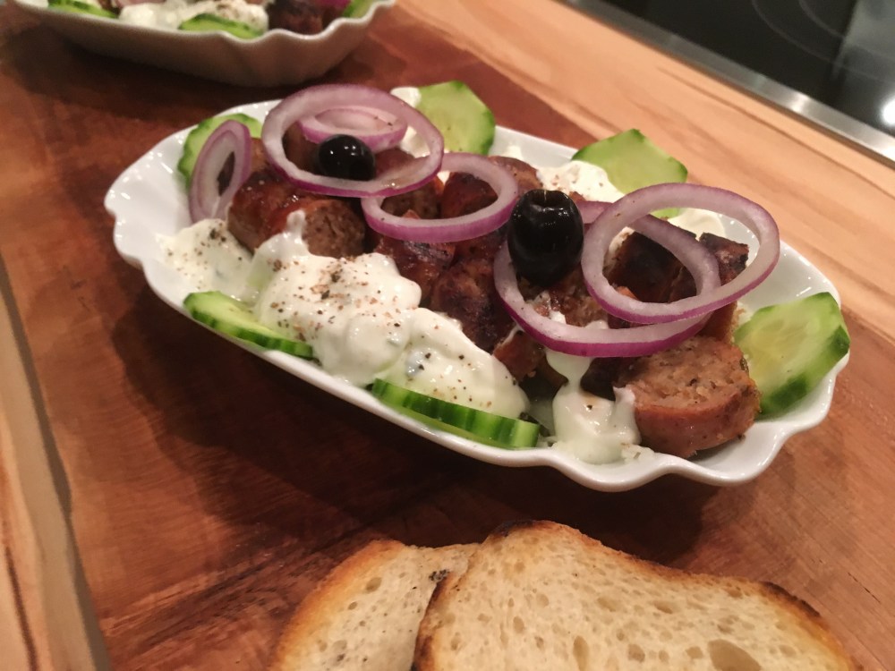 Die Gyros-Bratwurst vom Wurstetag wurde auf einem Bett aus Krautsalat mit Tzatziki, Zwiebelringen, Oliven und Gurkenscheiben garniert. Eine schöne „to go“ Variante der leckeren Wurst.