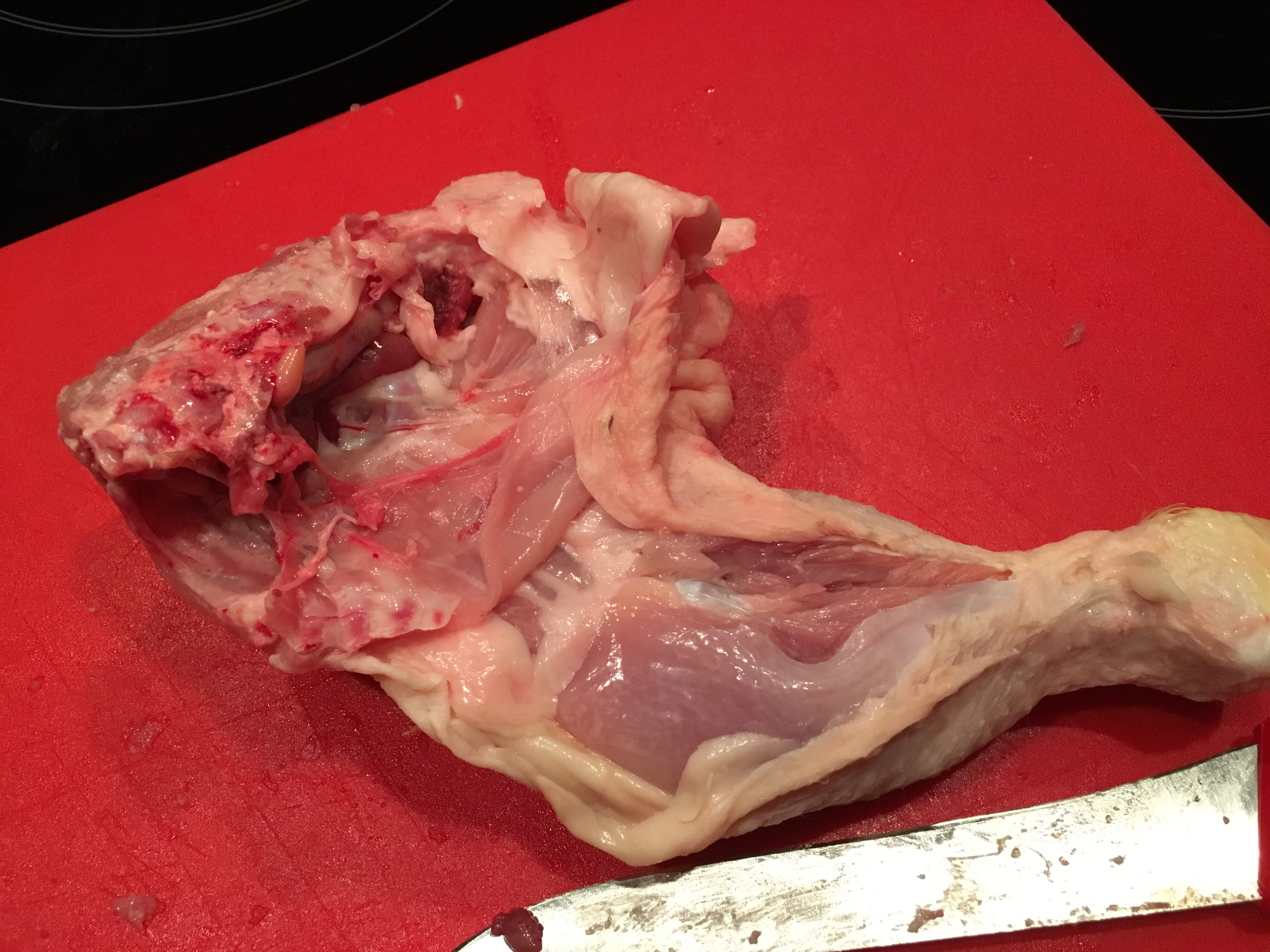 Dazu wurden 4 kg Hähnchenschenkel mit Rückenstück entbeint. Auf der Hautseite liegend wurde am Knochen entlang geschnitten und der Knochen Stück für Stück freigelegt.