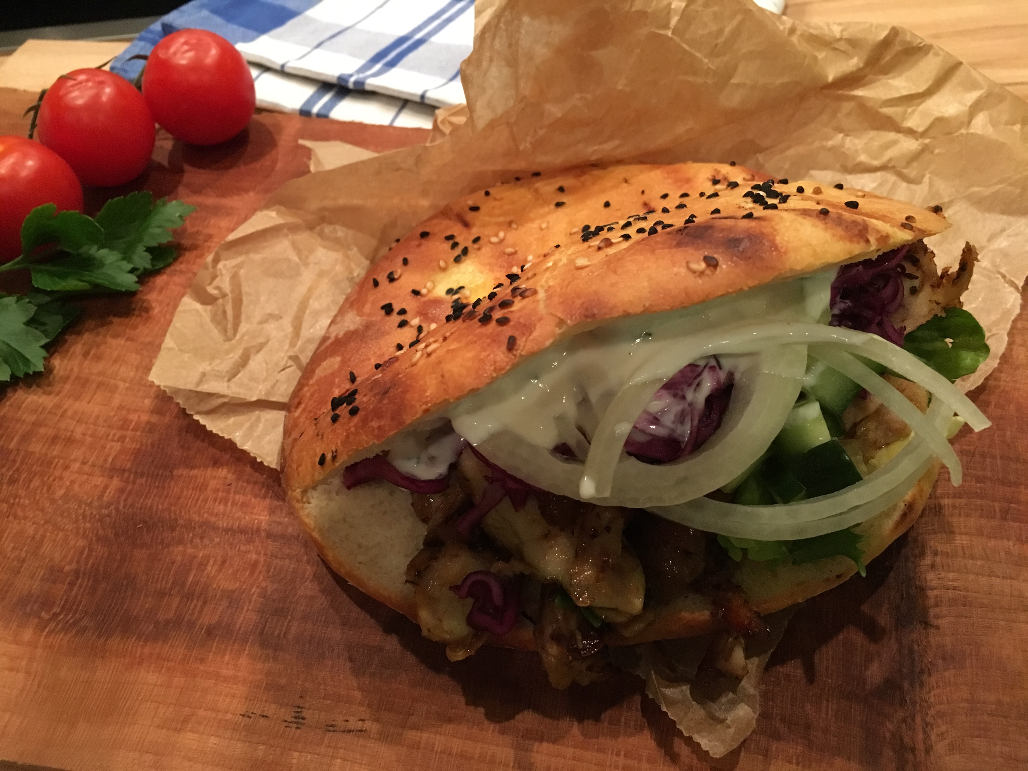 Serviert wurde das leckere Fleisch in einem megaleckerem, selbstebackenem Dönerbrot mit Knoblauch-Joghurtsauce, Salat, Gurkenwürfeln und einem Rotkrautsalat aus eigener Herstellung.