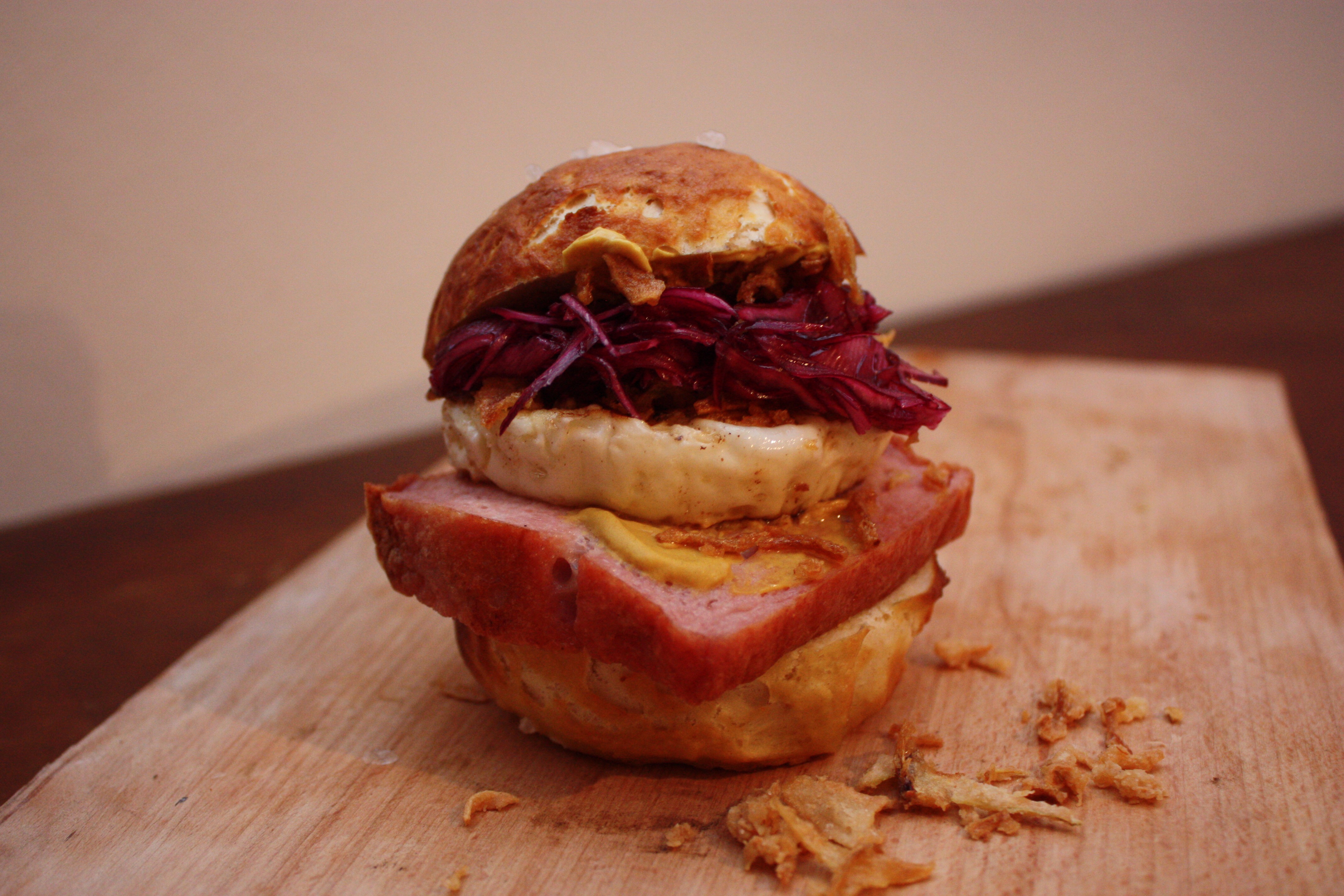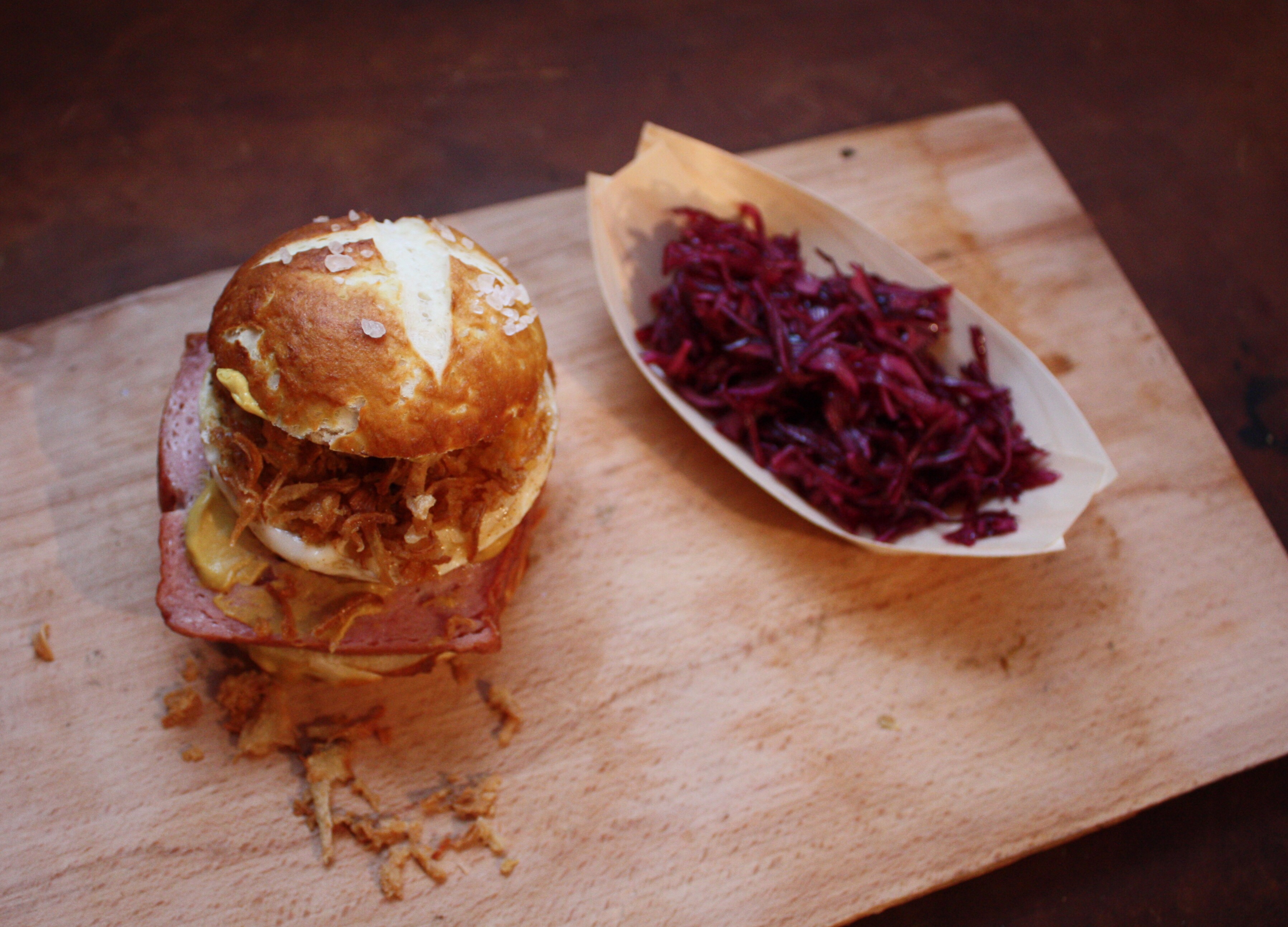 Was macht man, wenn man leckere Laugenbuns gebacken und selber Fleischkäse hergestellt hat? Richtig, man baut einen zünftigen Burger daraus!! Ich habe ihn „Tripel B“ Burger (Bübis-Bazi-Burger;-)) getauft. Dazu habe ich die Laugenbuns mit frischem Rotkrautsalat, Fleischkäse, einem Spiegelei, etwas Senf und Röstzwiebeln belegt. Sehr lecker und auch optisch macht er was her, oder?
