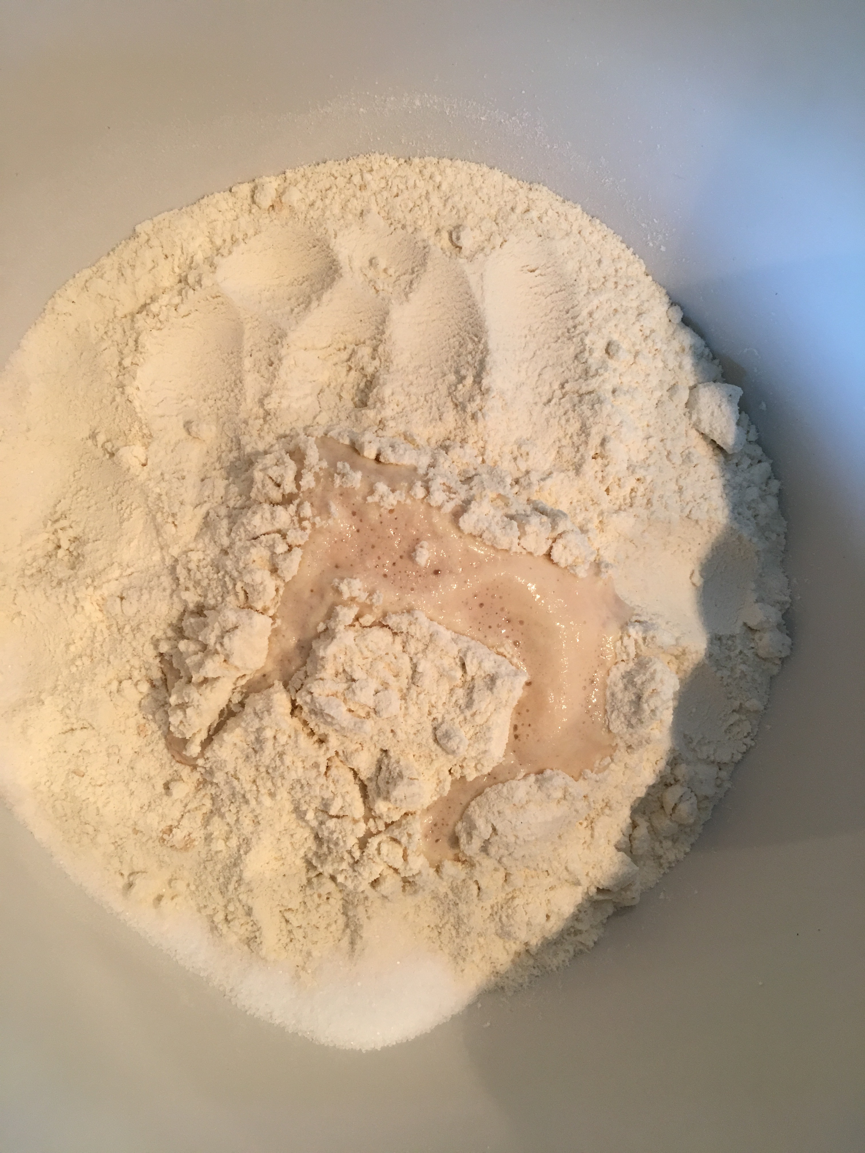 Das Mehl in eine Schüssel geben und in der Mitte eine Kuhle bilden. Die zerbröckelte Hefe in die Vertiefung geben, den Zucker darüber streuen und 75 ml handwarmes Wasser dazugießen. Das Hefe-Wasser-Zucker-Gemisch etwas miteinander verrühren. Diese Mischung circa 15 Minuten gehen lassen.