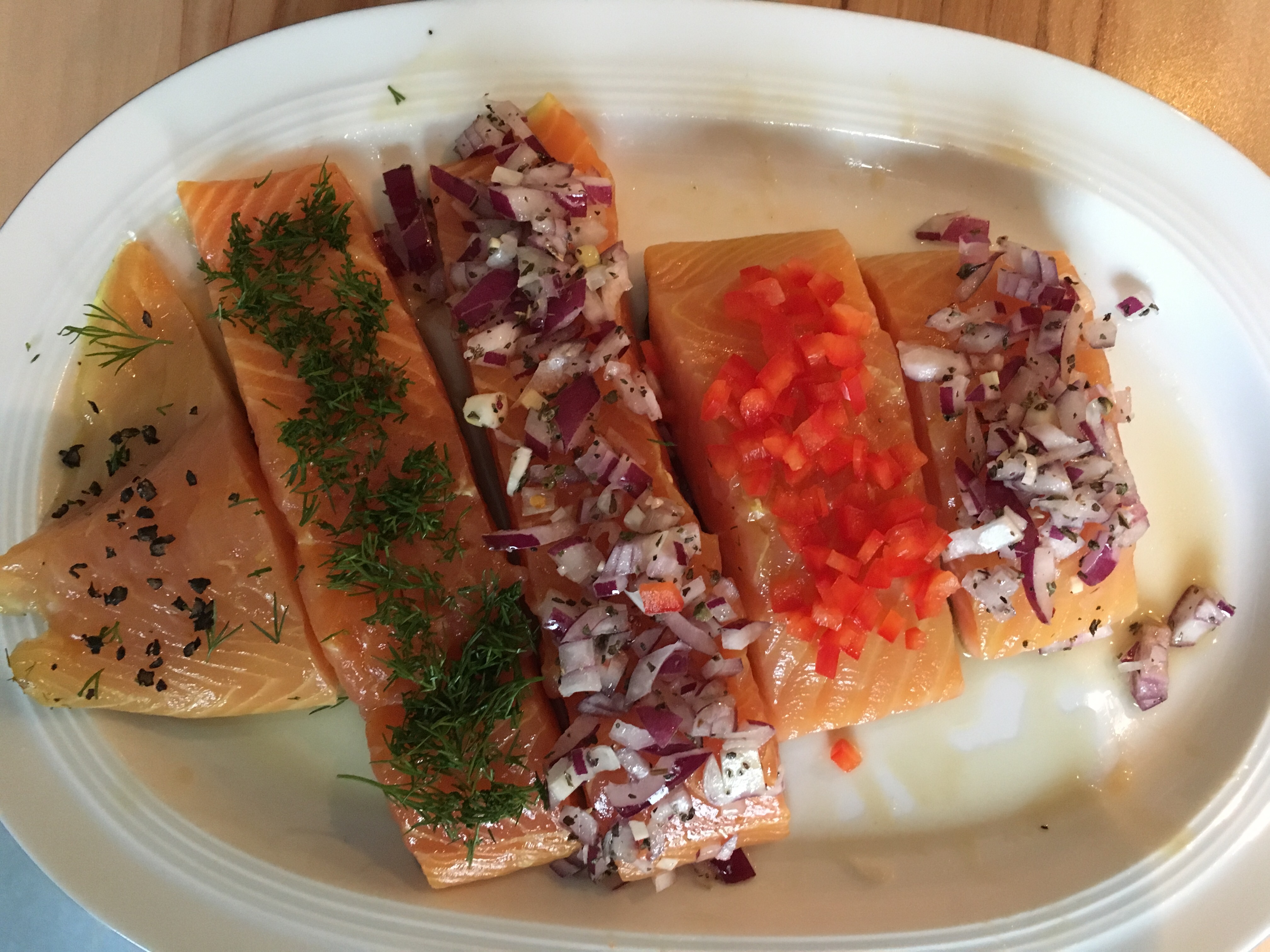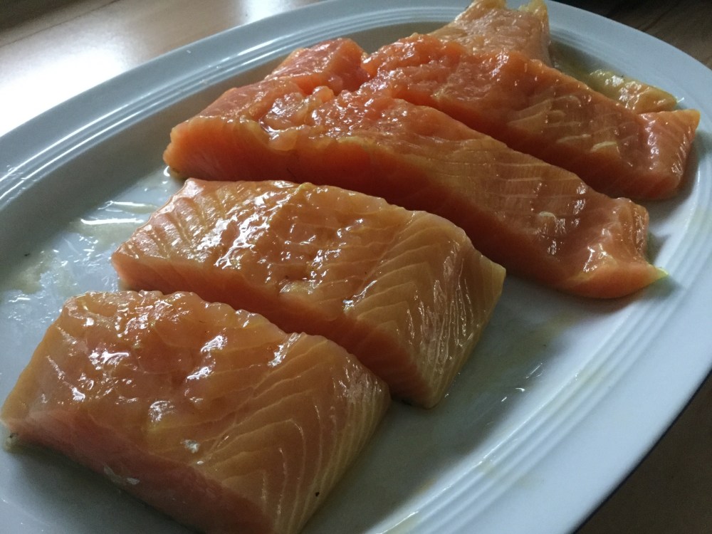 Zur Herstellung benötigt man grätenfreie Lachsfilets. Ich habe die frischen Lachsfilets von Lidl verwendet. Diese werden für 12 bis 14 Stunden in eine Salz-Gewürzlake eingelegt. Pro Liter Wasser gibt man 60g Salz, 2g Pfeffer, 1,5g Kurkuma und 1,5 Lorbeerblatt, eine Messerspitze geräuchertes Paprikapulver und einen Teelöffel Senfkörner bei.