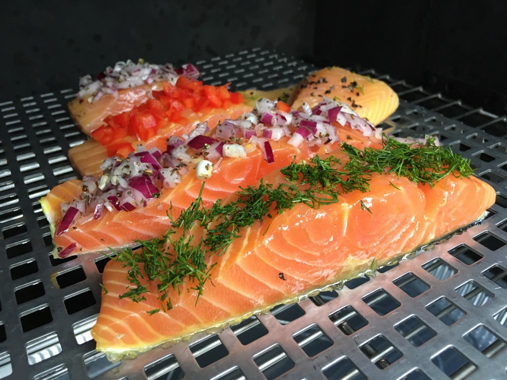 Hier darf gerne experimentiert werden und man kann die Lake nach seinen eigenen Vorlieben abwandeln. Die Filets müssen komplett mit der Lake bedeckt sein. Anschließend werden die Filets kurz unter kaltem Wasser abgespült, und dann mit Küchenkrepp gut trocken getupft. Jetzt werden sie dünn mit Ahornsirup eingepinselt. So sollten sie dann ca. 5 Stunden ruhen.