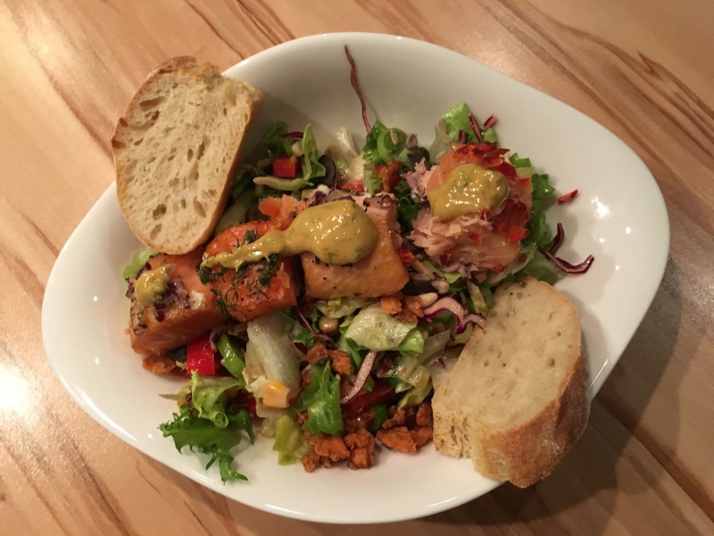 Wie haben die Stremel lauwarm auf einem frischen Salat genossen. Dazu gab es ein selbstgebackenes Baguette.