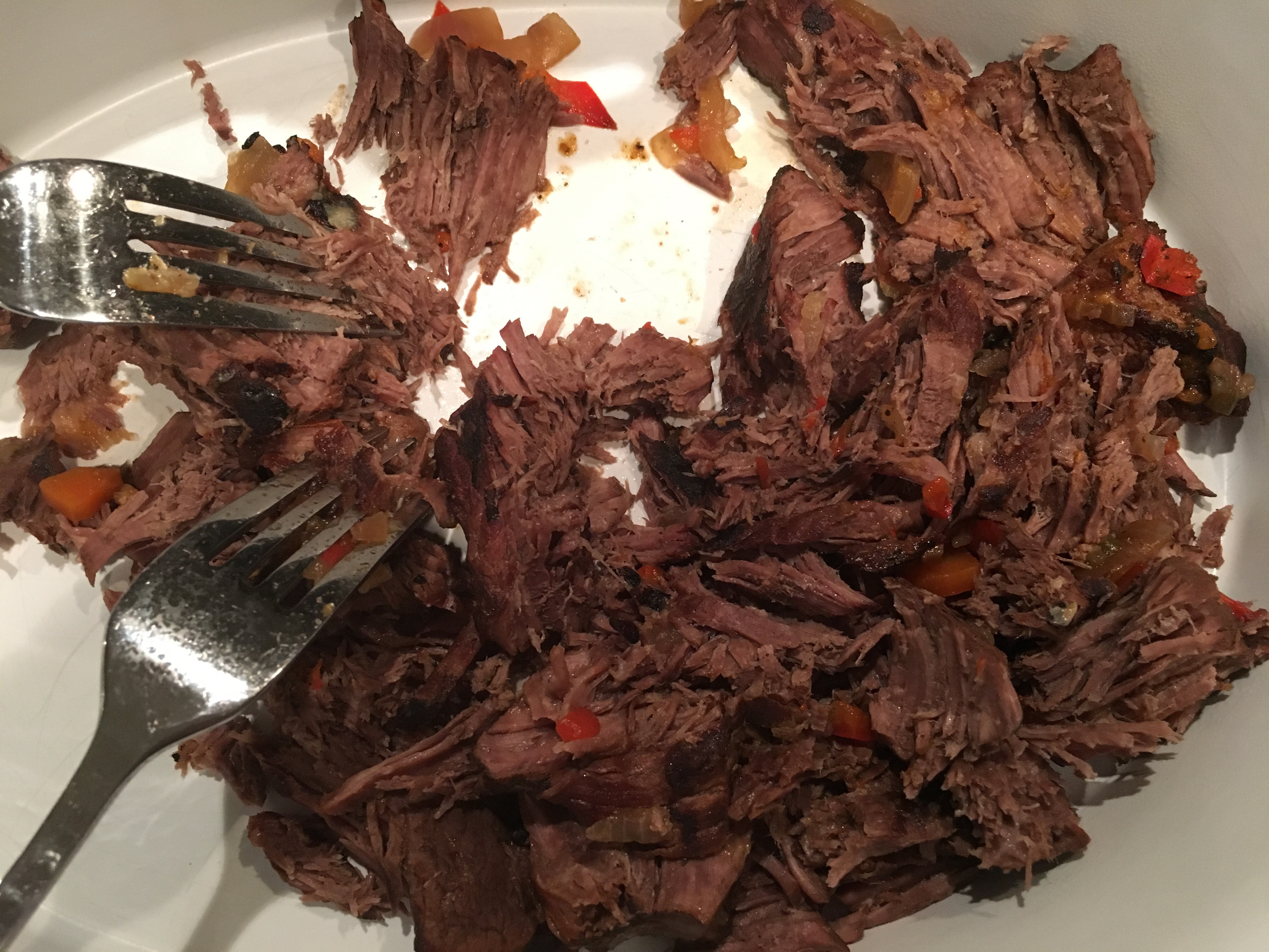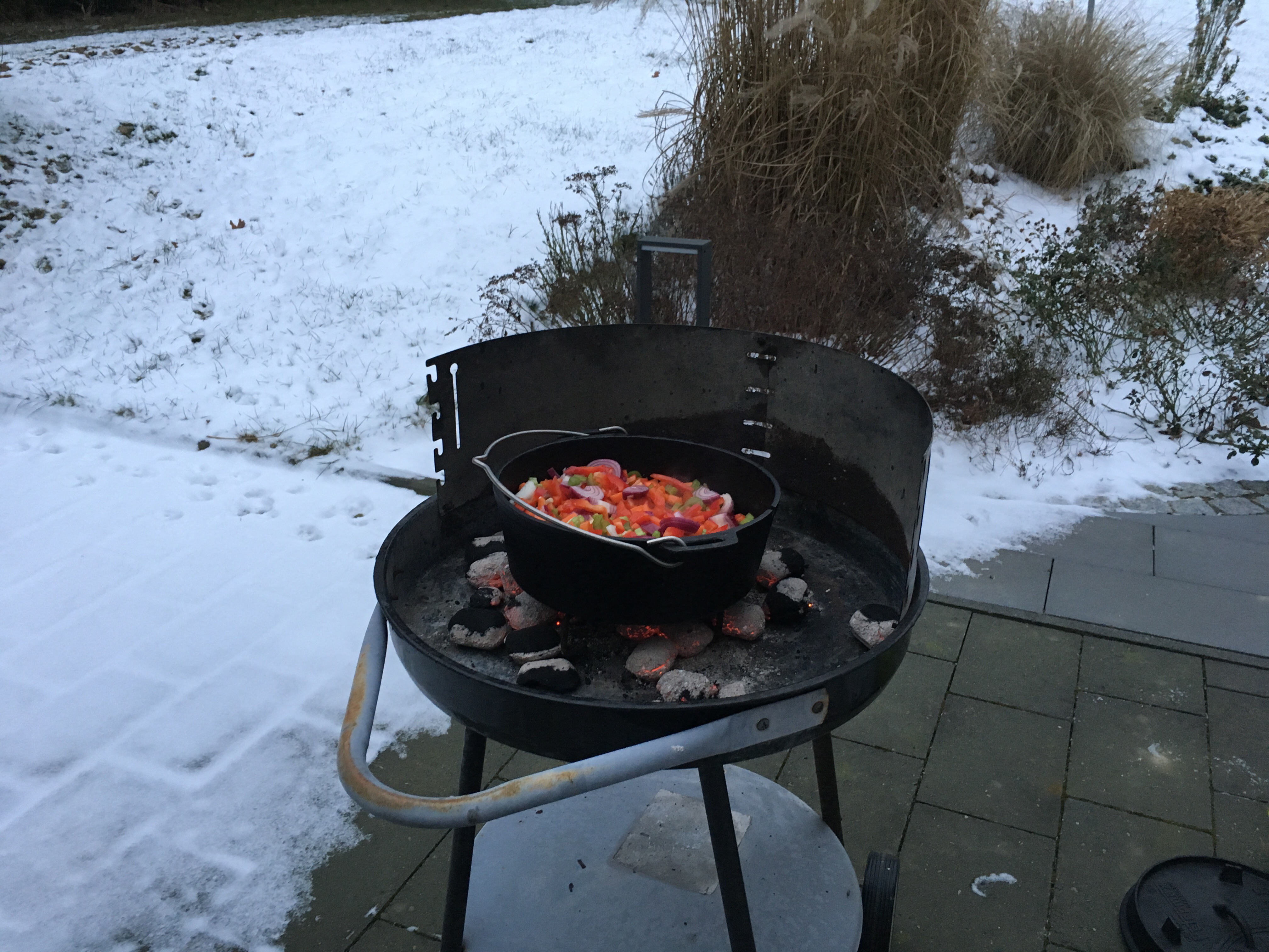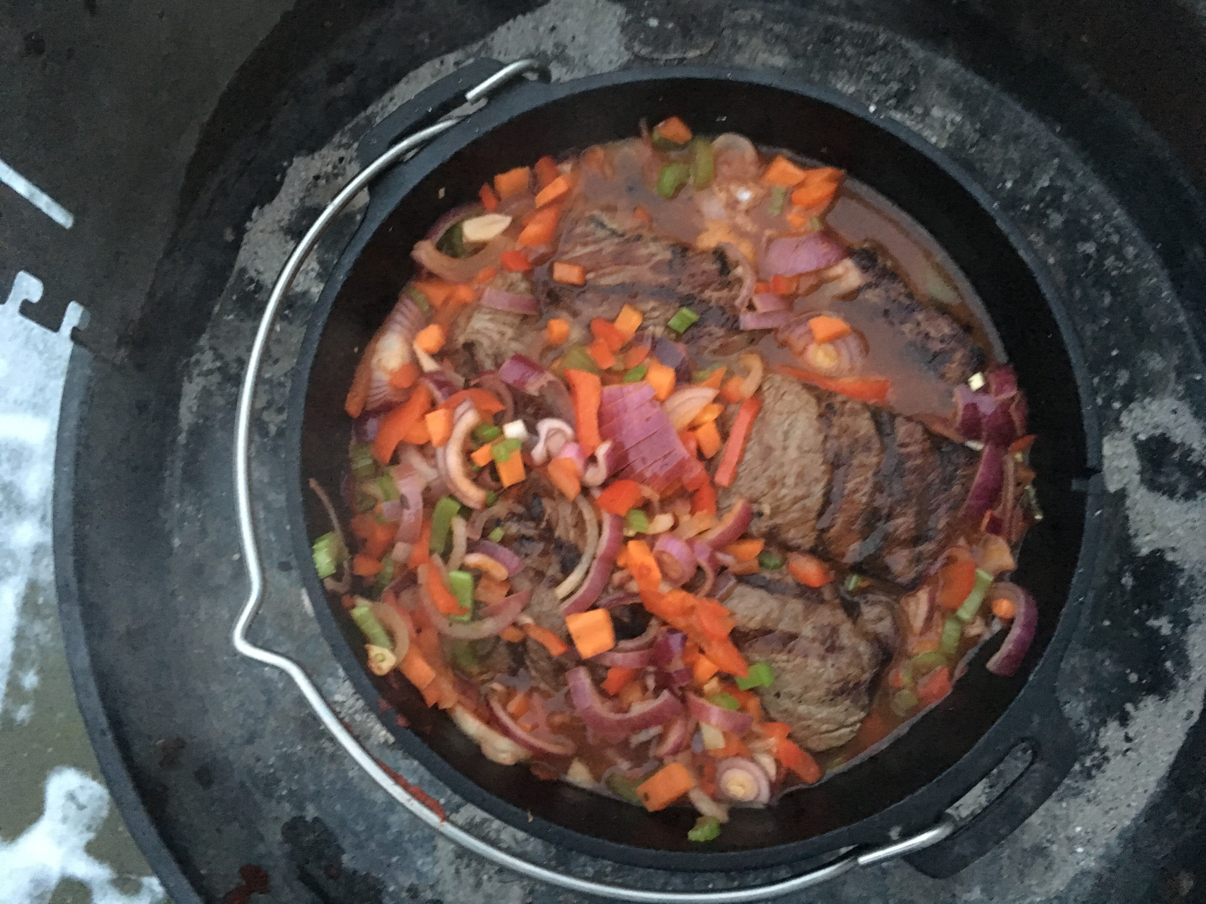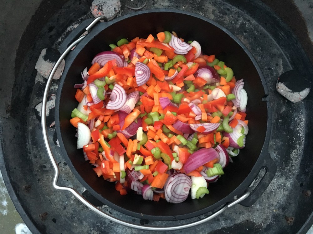 Gemüse klein würfeln und im heißen Dutch in etwas Öl anschwitzen. Tomatenmark hinzu geben und mit anrösten. Etwas Zucker hinzufügen. Rotwein angießen und einkochen lassen und anschließend die Brühe angießen. Jetzt das Fleisch in große Würfel schneiden, scharf angrillen und mit in den Dutch geben. 2 Sunden simmern lassen. Ich hatte dazu 6 Kohlen unter den Dutch Oven und 12 auf dem Deckel (am Rand). Nun das Fleisch herausnehmen und zerrupfen. Einen Großteil der Flüssigkeit abschöpfen, Fleisch wieder hineingeben und mit Pfeffer Salz und Worchestersauce abschmecken. Soweit die Vorbeteitung, jetzt kommen wir zum Anrichten….