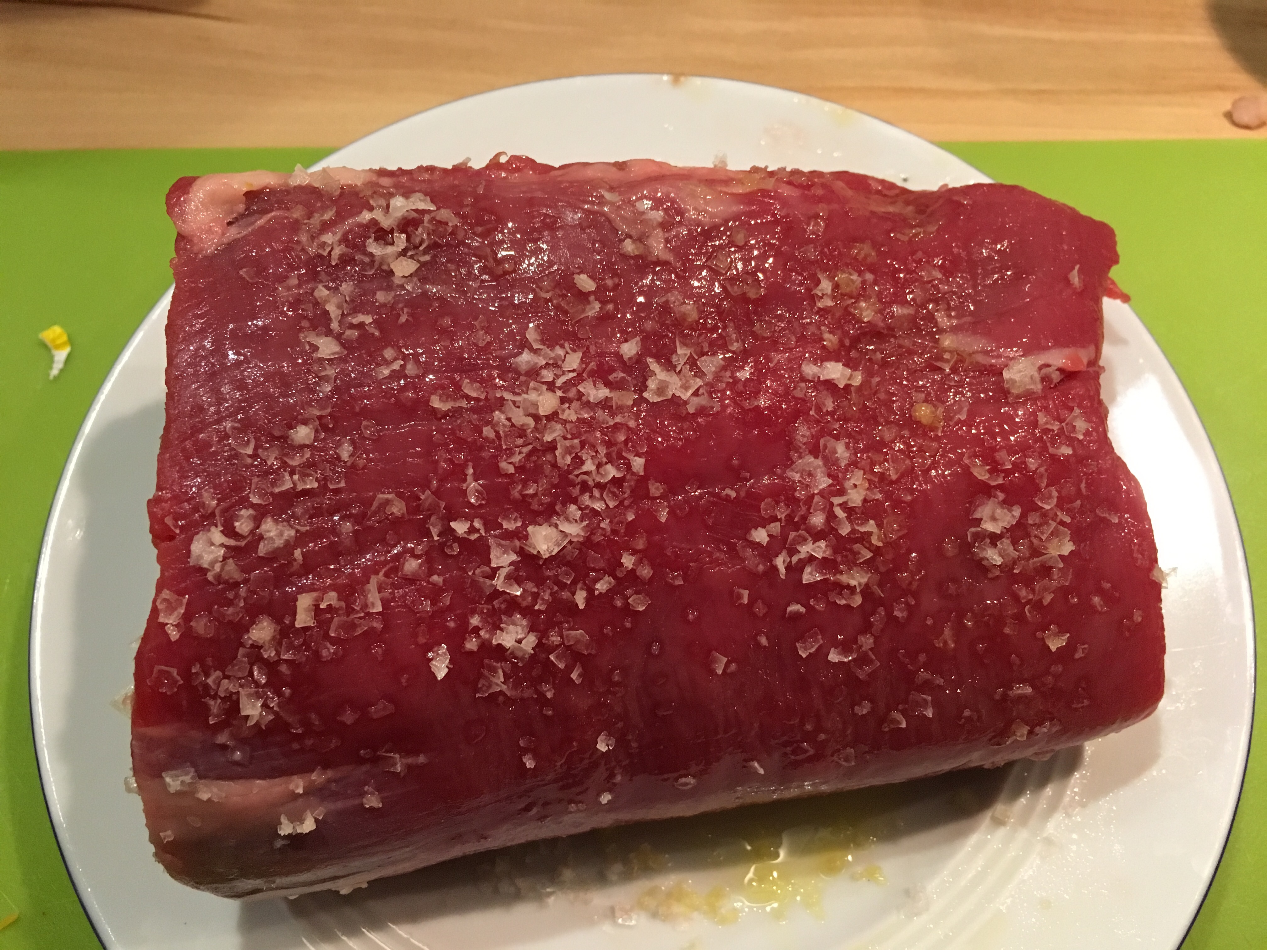 Das Filetstück habe ich dünn mit Olivenöl eingepinselt und 30 Minuten vor dem Grillen mit Salzflocken gesalzen. Auf der Sizzle Zone wurde das gute Stück 5 Minuten von allen Seiten angegrillt und mit Röstaromen versehen. Anschließend wurde es im Grill bei 180 Grad indirekt auf 54 Grad gezogen. Vor dem Anschnitt durfte das Fleisch noch etwas ruhen und wurde dann in der Gremolata gewälzt.