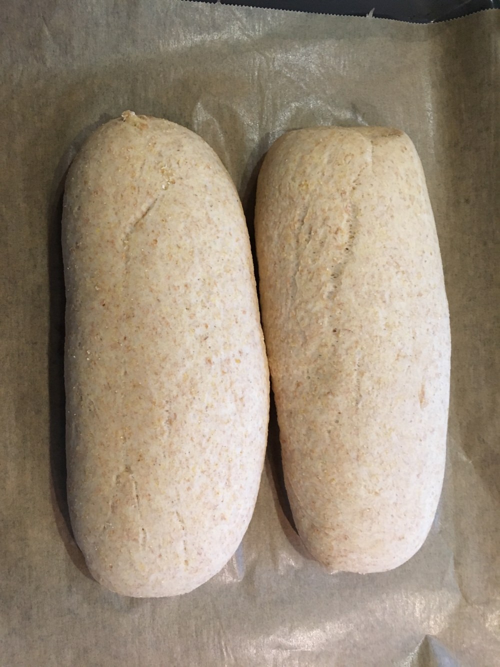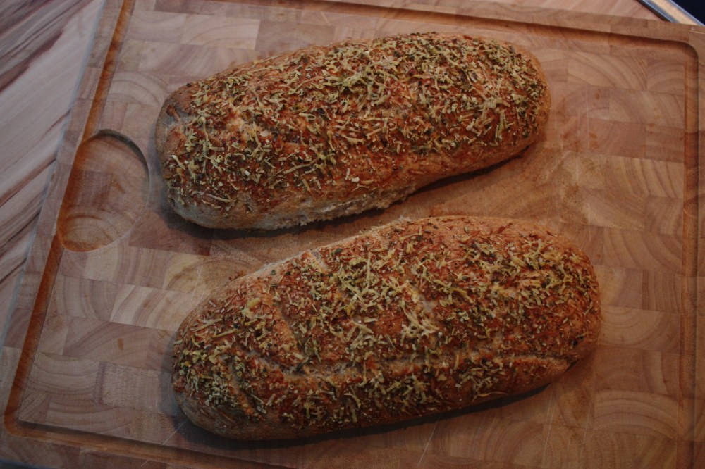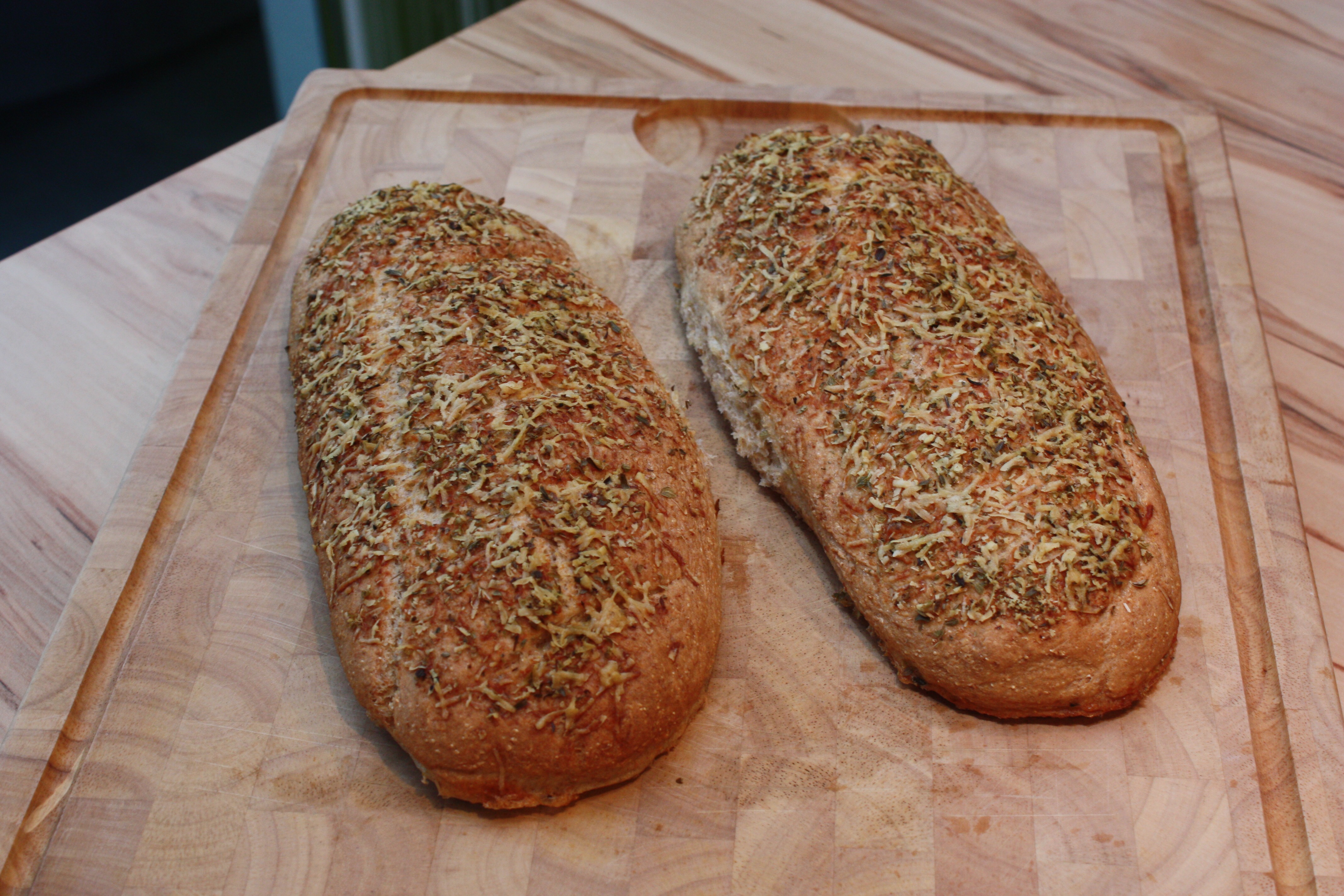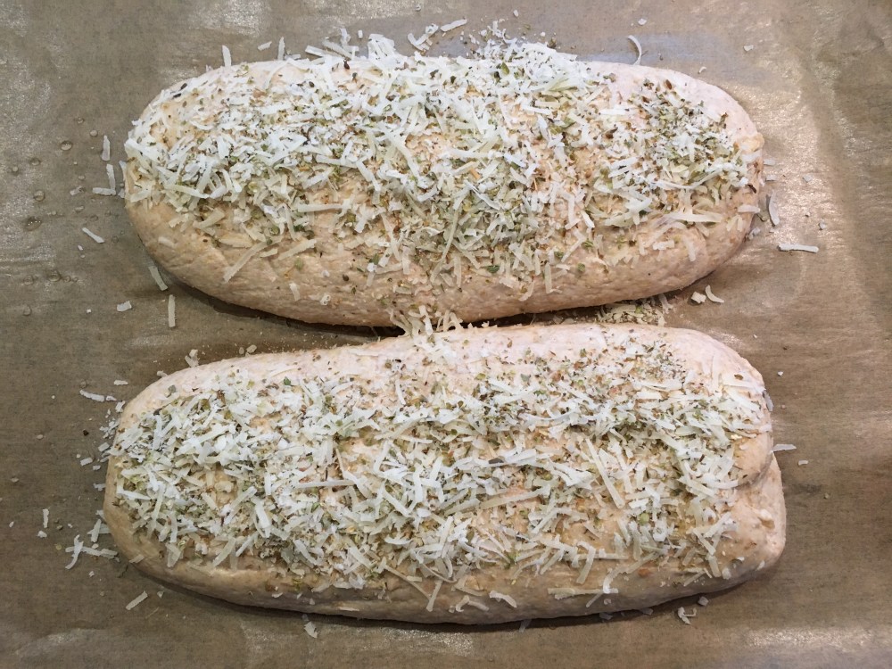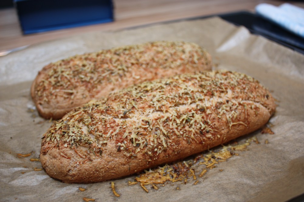 Alle Zutaten, bis auf den Parmesan und den Oregano, in einer Schüssel vermengen und 10 Minuten kneten. Abgedeckt kurz ruhen lassen und dann aus dem Teig zwei Baguettes rollen. Auf einem Backblech platzieren und an einem warmen Ort 20 Minuten gehen lassen. Teiglinge mit Wasser bepinseln, aus dem Parmesan und dem Oregano das Topping zubereiten und auf den Baguettes verteilen. Backofen auf 180 Grad vorheizen und eine feuerfeste Schale mit Wasser auf dem Ofenboden stellen. Baguettes ca.30 Minuten backen. Aus dem Ofen nehmen mit Wasser besprühen und mit einem Handtuch abgedeckt abkühlen lassen. So bleiben sie schön weich und fluffig.