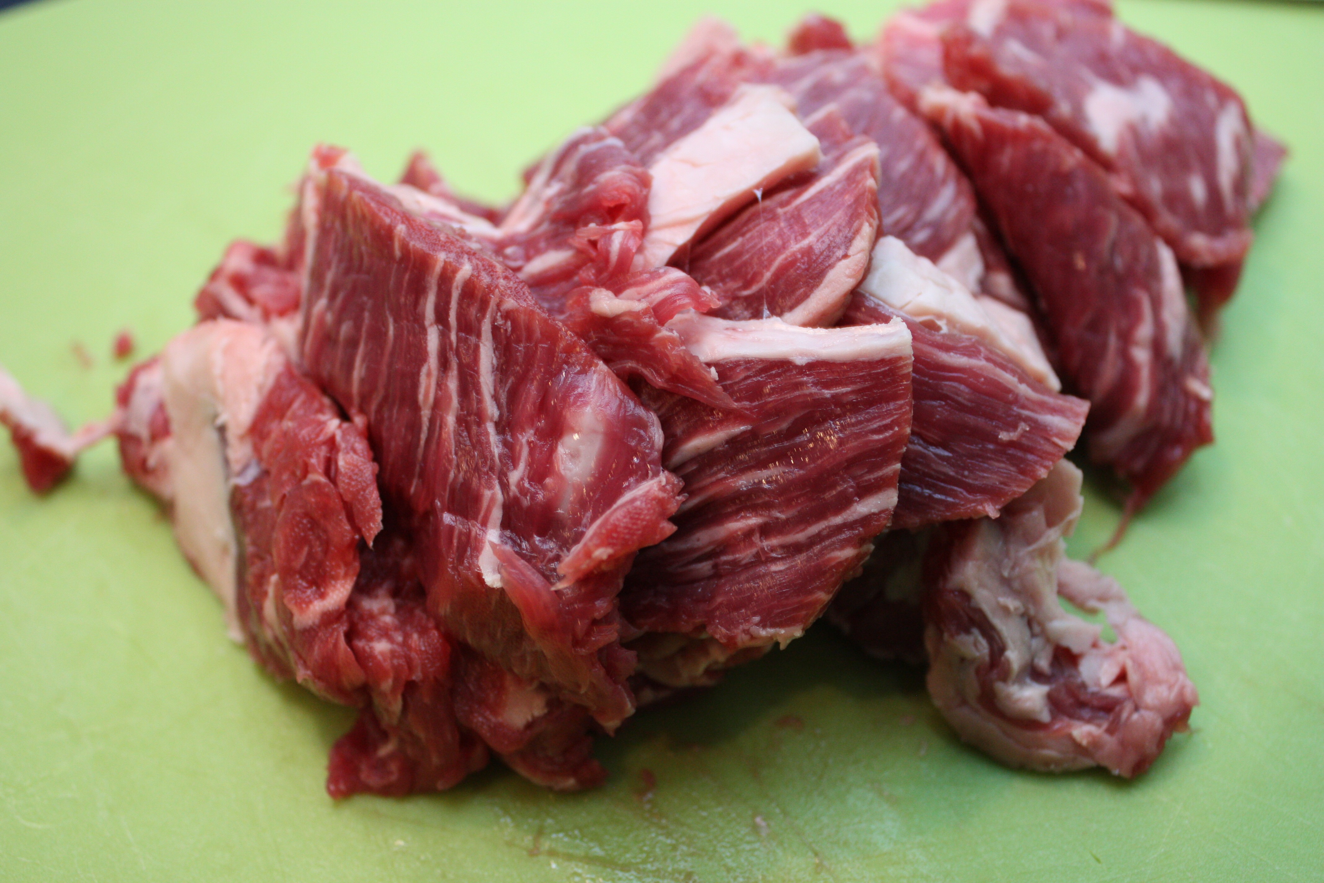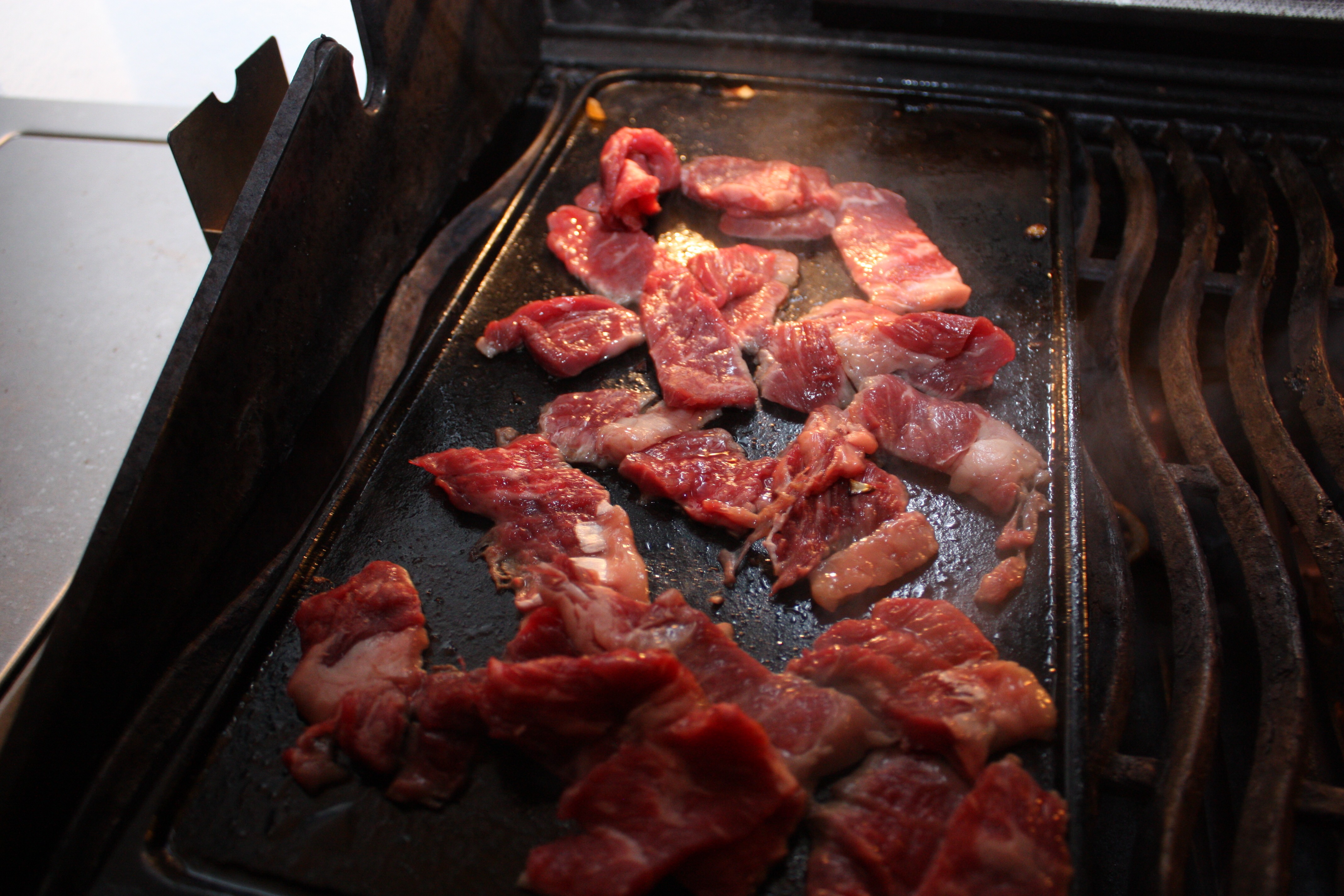 Anschließend wurde das Entrecôte in dünne Scheiben geschnitten, kurz auf der nun sehr heiß aufgeheizten Gussplatte angebraten und ebenfalls mit Salz und Pfeffer gewürzt.