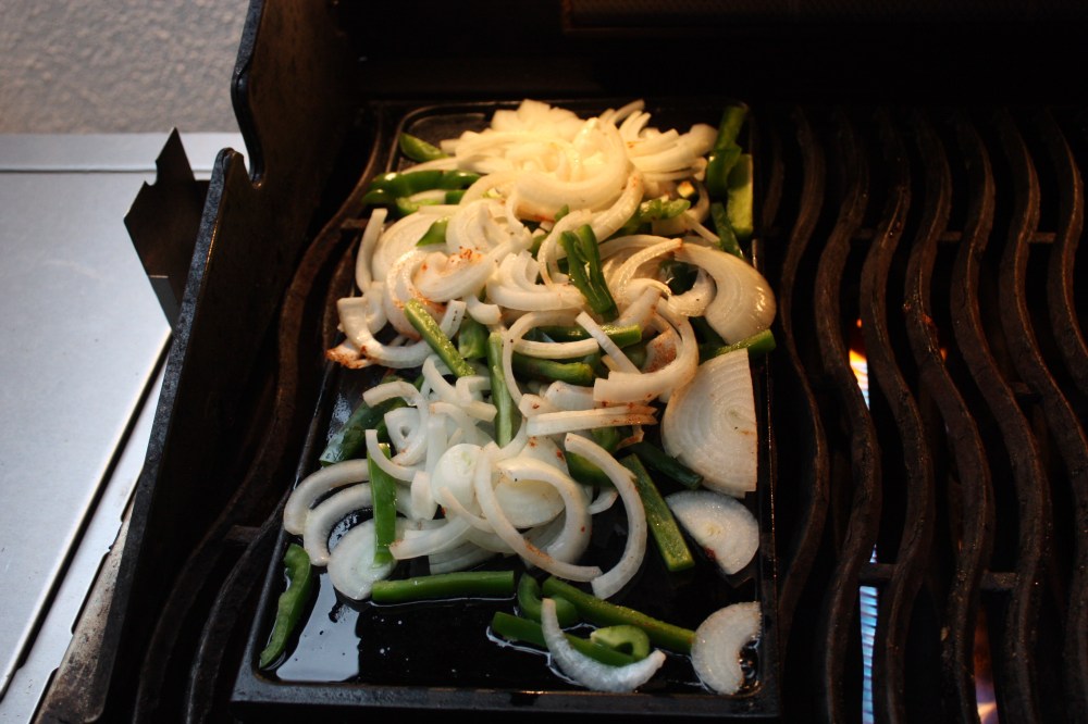 Die Zwiebel und die grüne Paprika wurde in Streifen geschnitten und auf einer Gussplatte im Grill bei niedriger Temperatur mit etwas Butter weich geschmort mit Pfeffer und Salz gewürzt und in einer Schüssel bei Seite gestellt.