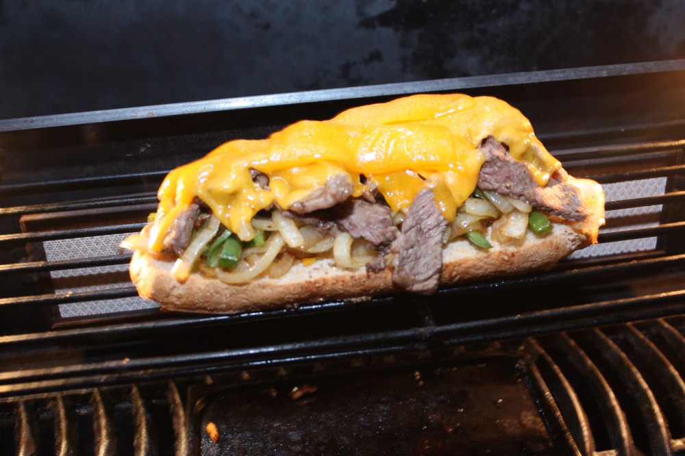 Zusammen mit den Zwiebeln und der Paprika wurde das Steak auf einem Parmesan-Oregano Baguette (Rezept hier..) plaziert mit Cheddarkäse belegt und im Grill in der indirekten Zone überbacken.