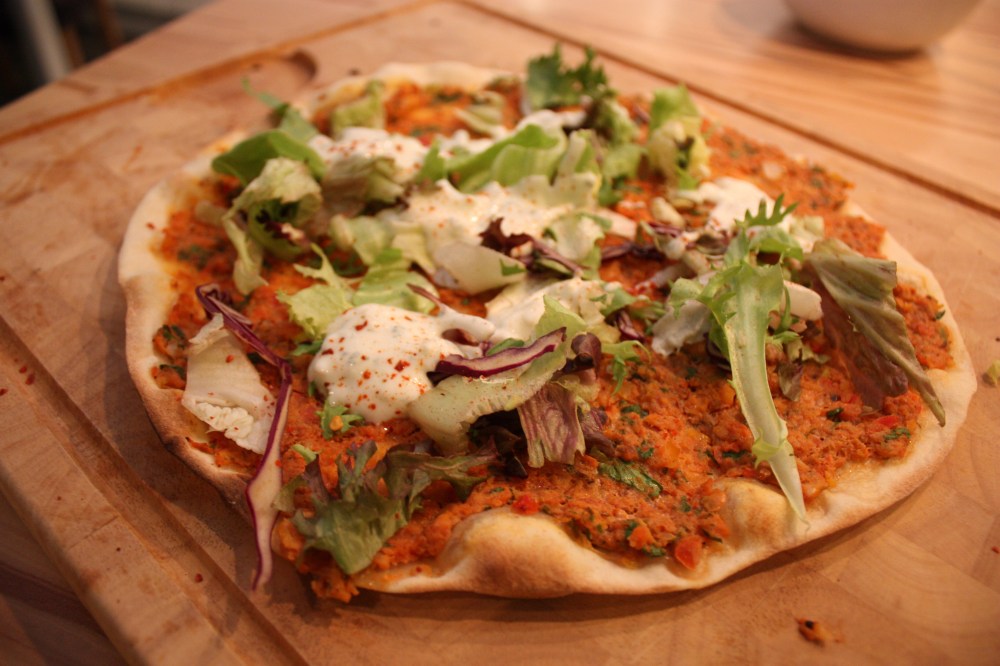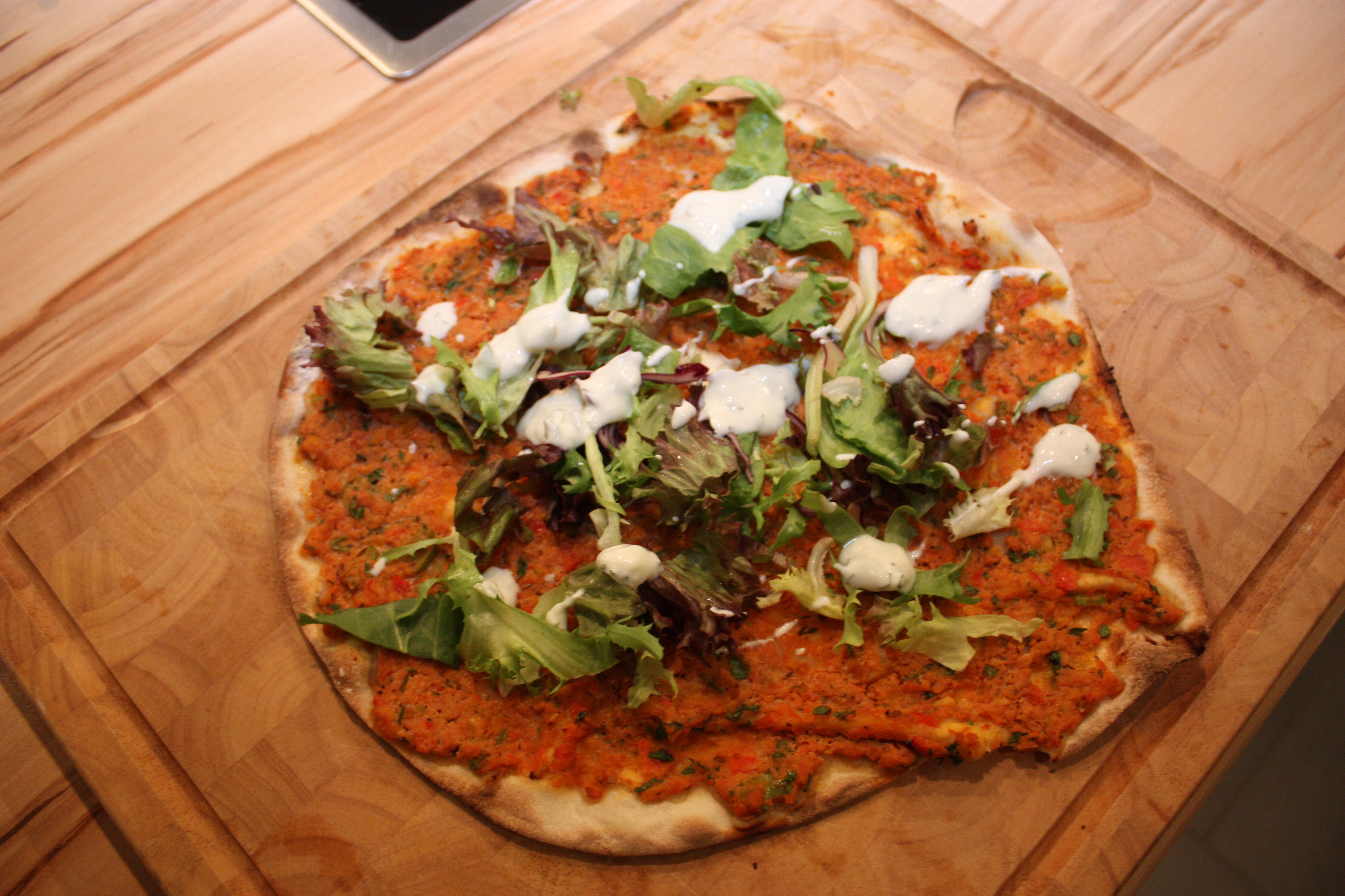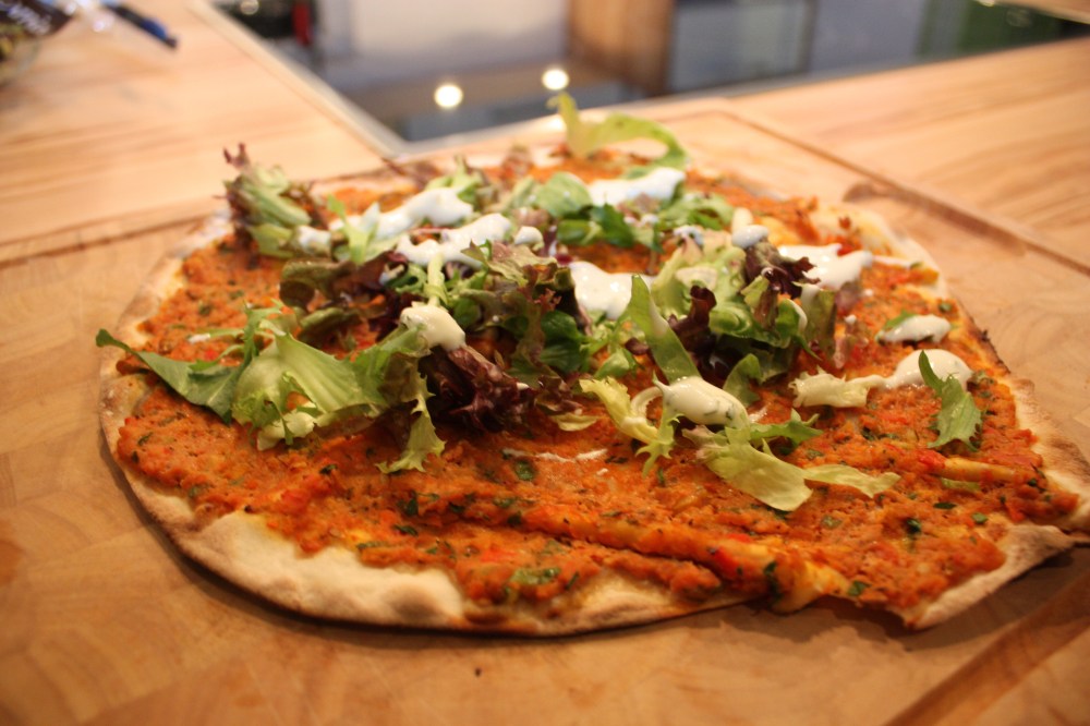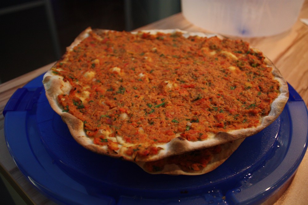 Lahmacun, auch türkische Pizza genannt, ist ein Fladenbrot aus Hefeteig, das vor dem Backen dünn mit einem würzigen Belag aus Hackfleisch, Zwiebeln, Tomaten und Paprika bestrichen wird. Lahmacun ist ein traditioneller Imbiss, der meist direkt heiß aus dem Backofen gegessen wird. Bei uns in Deutschland wird Lahmacun oft aufgerollt mit Salat und Knoblauchjoghurtsauce gefüllt serviert. Die Bezeichnung Lahmacun leitet sich ab vom aramäischen „lahm am dschun“, was so viel bedeutet wie „Teig mit Fleisch“.