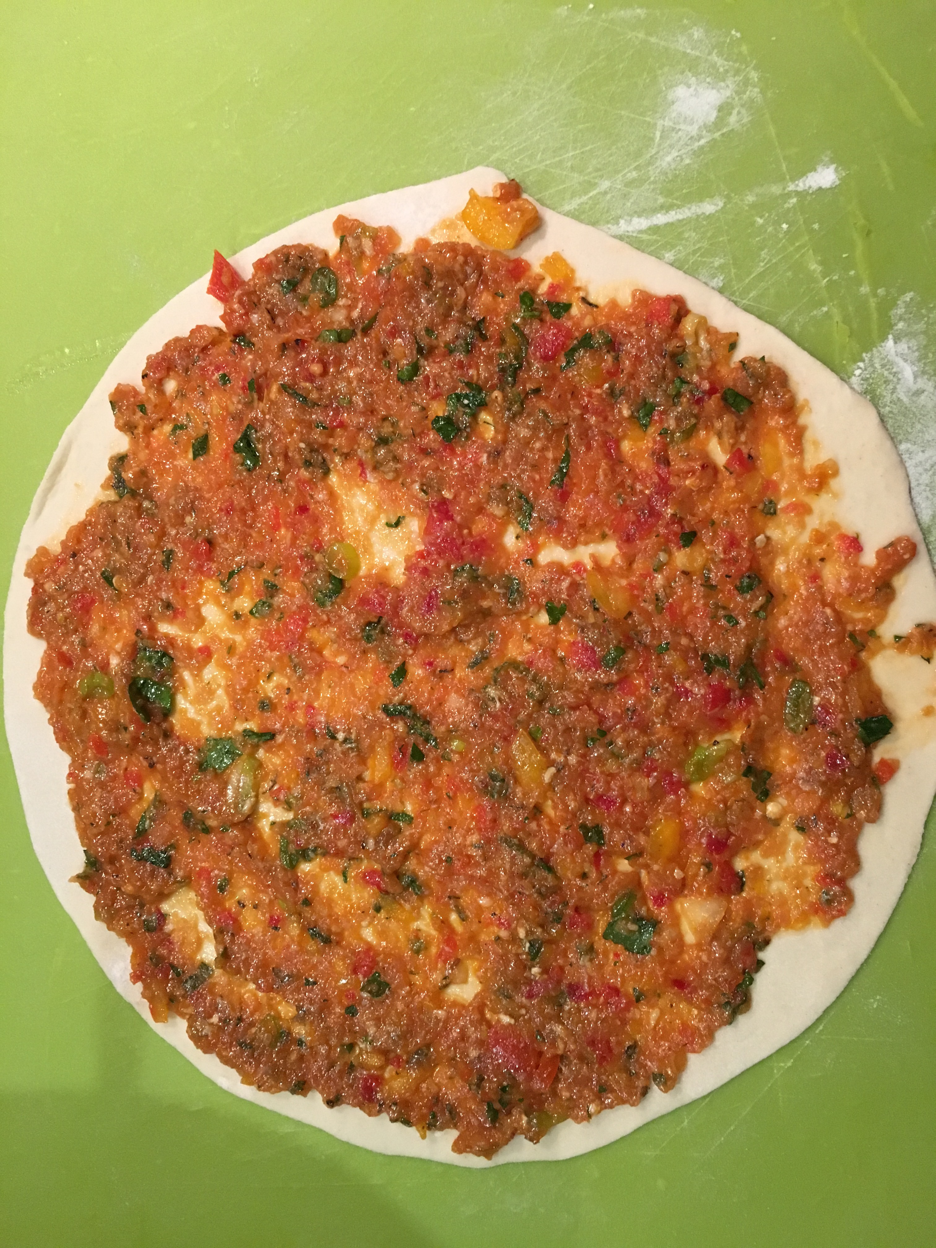 In der Zwischenzeit das Gemüse für den Belag mit einer Küchenmaschine sehr fein zekleinern und mit dem Hackfleisch, den Gewürzen, der gehackten Petersilie und restlichen Zutaten gut vermischen und abgeschmecken. Nun die gut bemehlten Teigkugeln mit einer Teigrolle sehr dünn zu runden Fladen ausrollen. Die Belagmasse gleichmäßig, wie bei einer Pizza, mit einem Esslöffel bis an den Rand verstreichen.