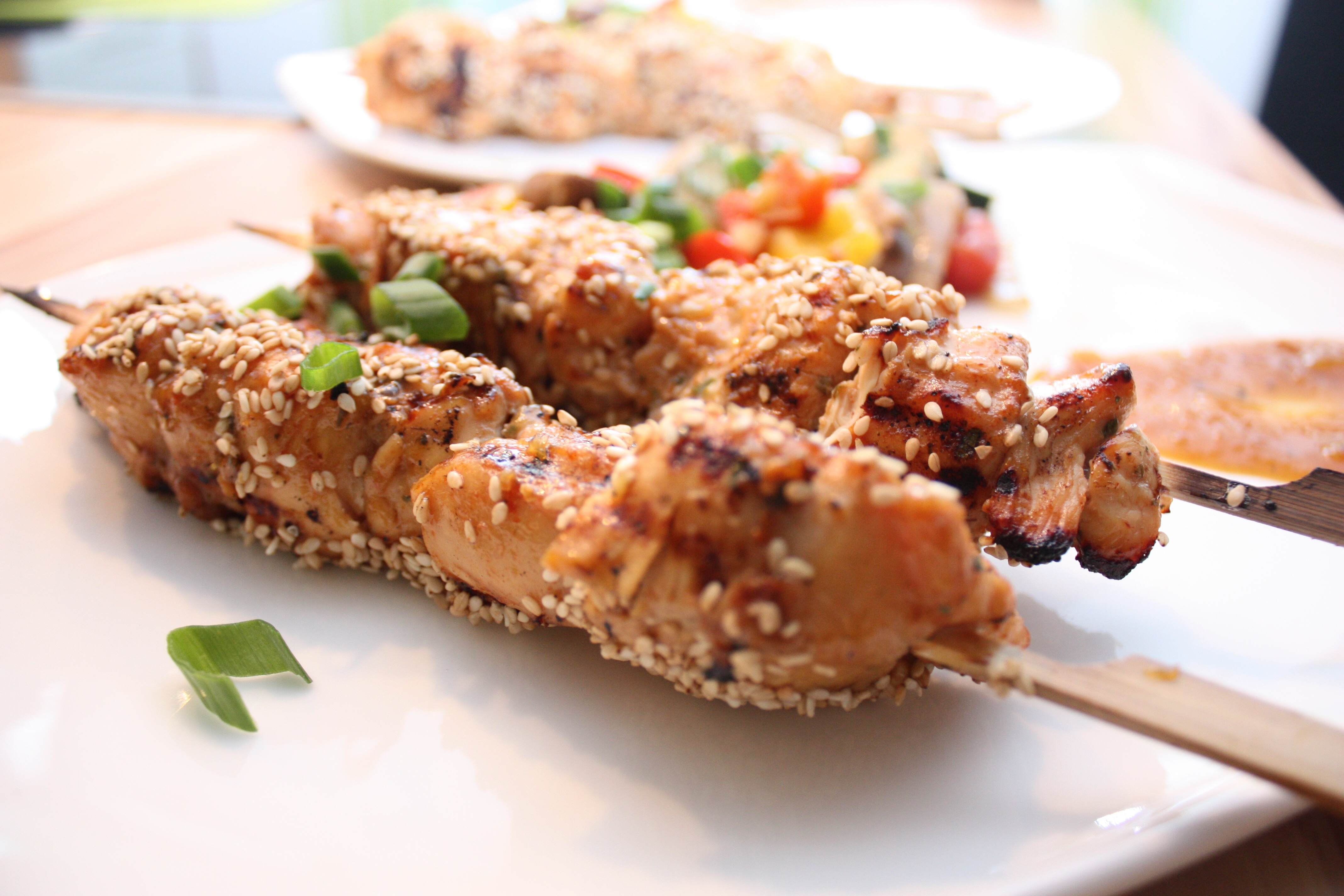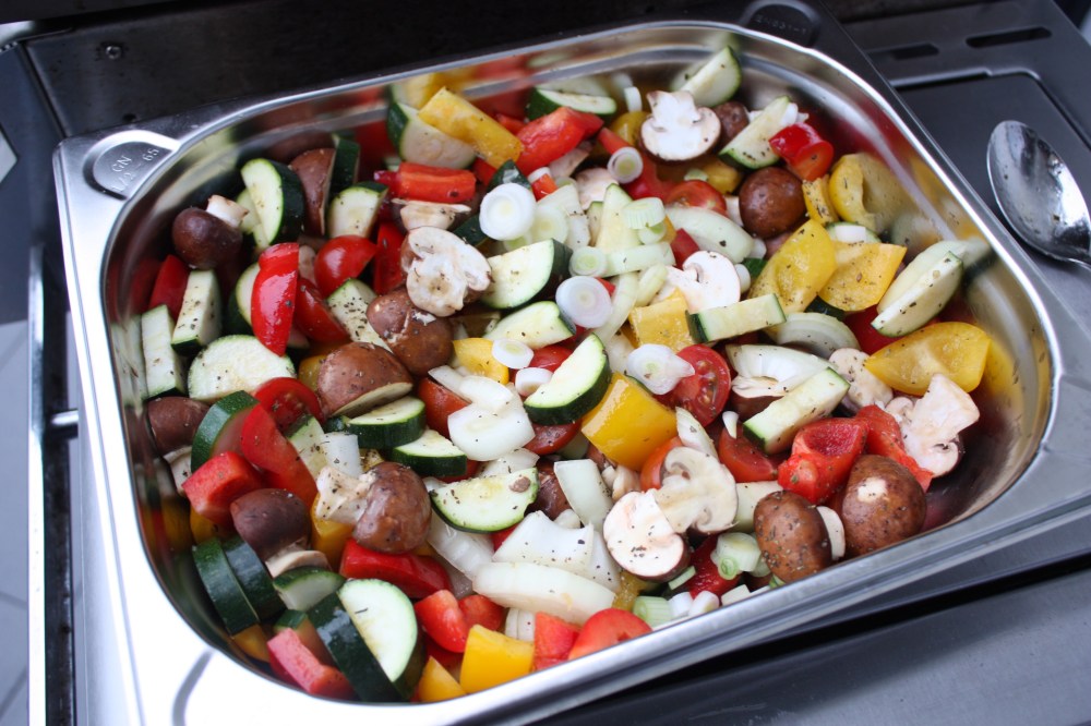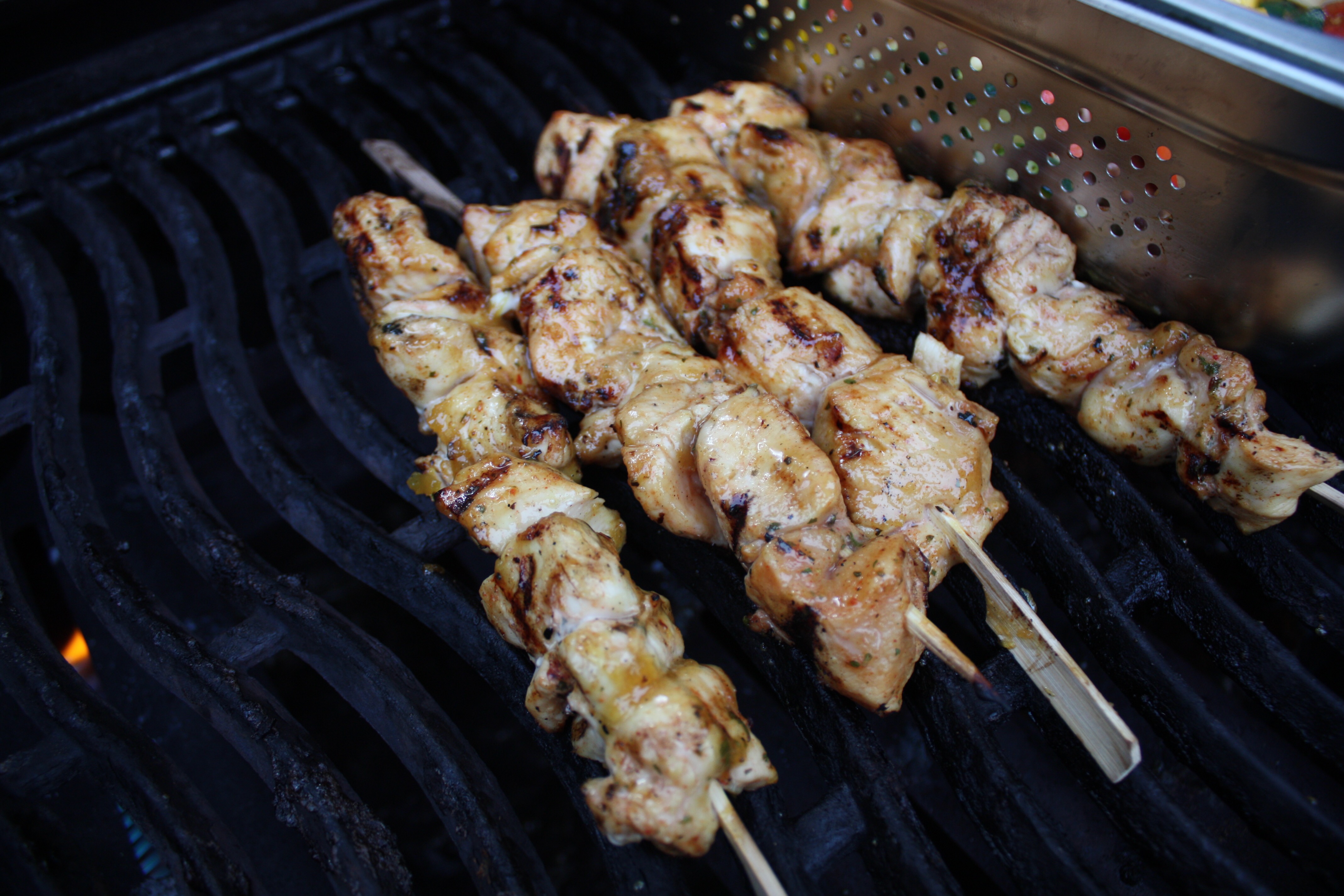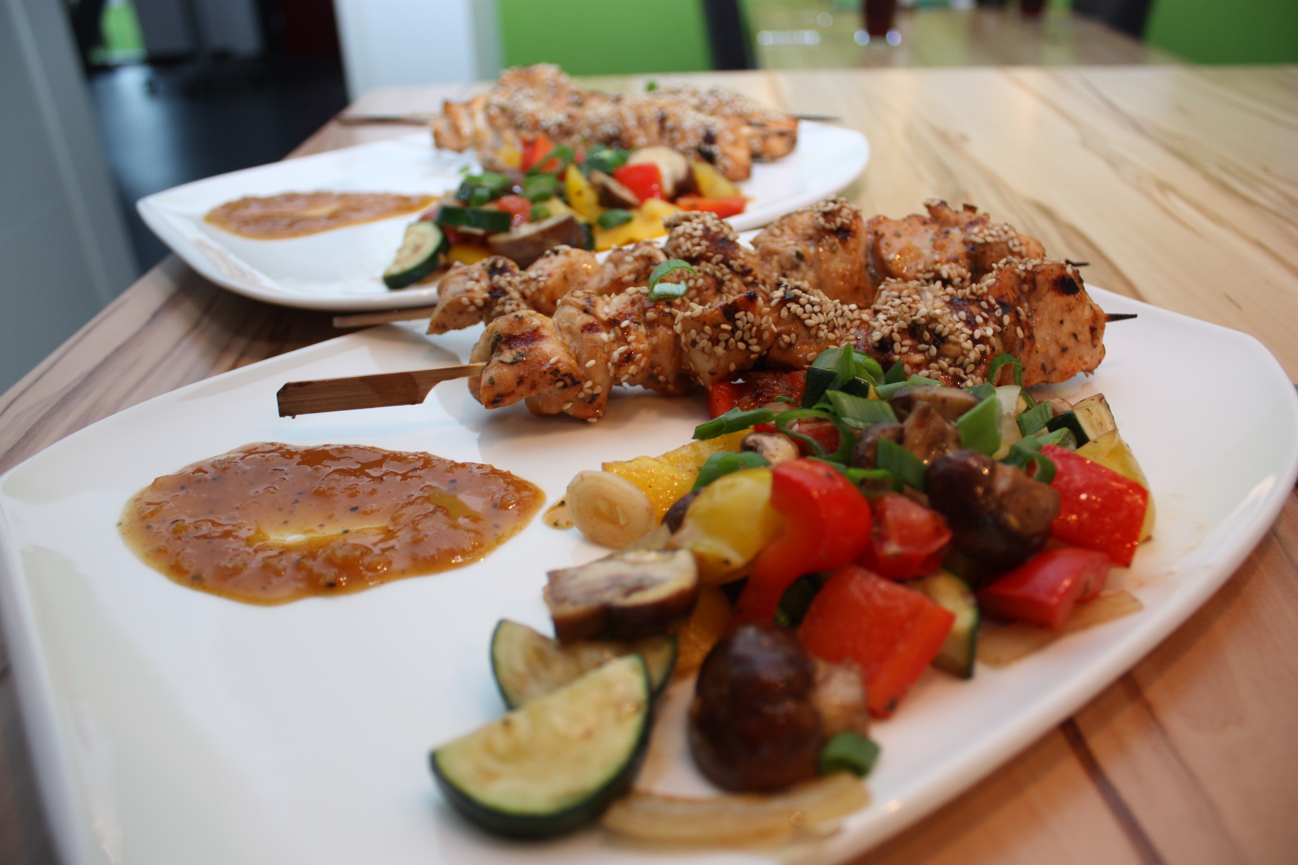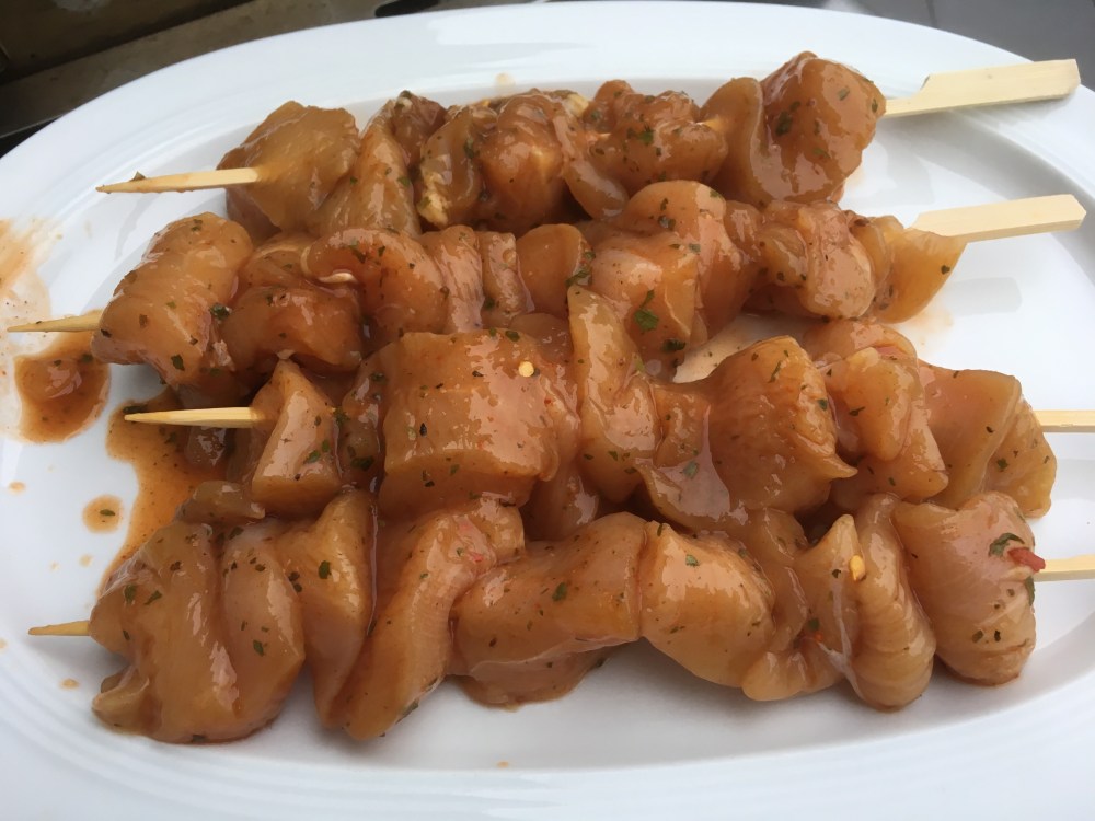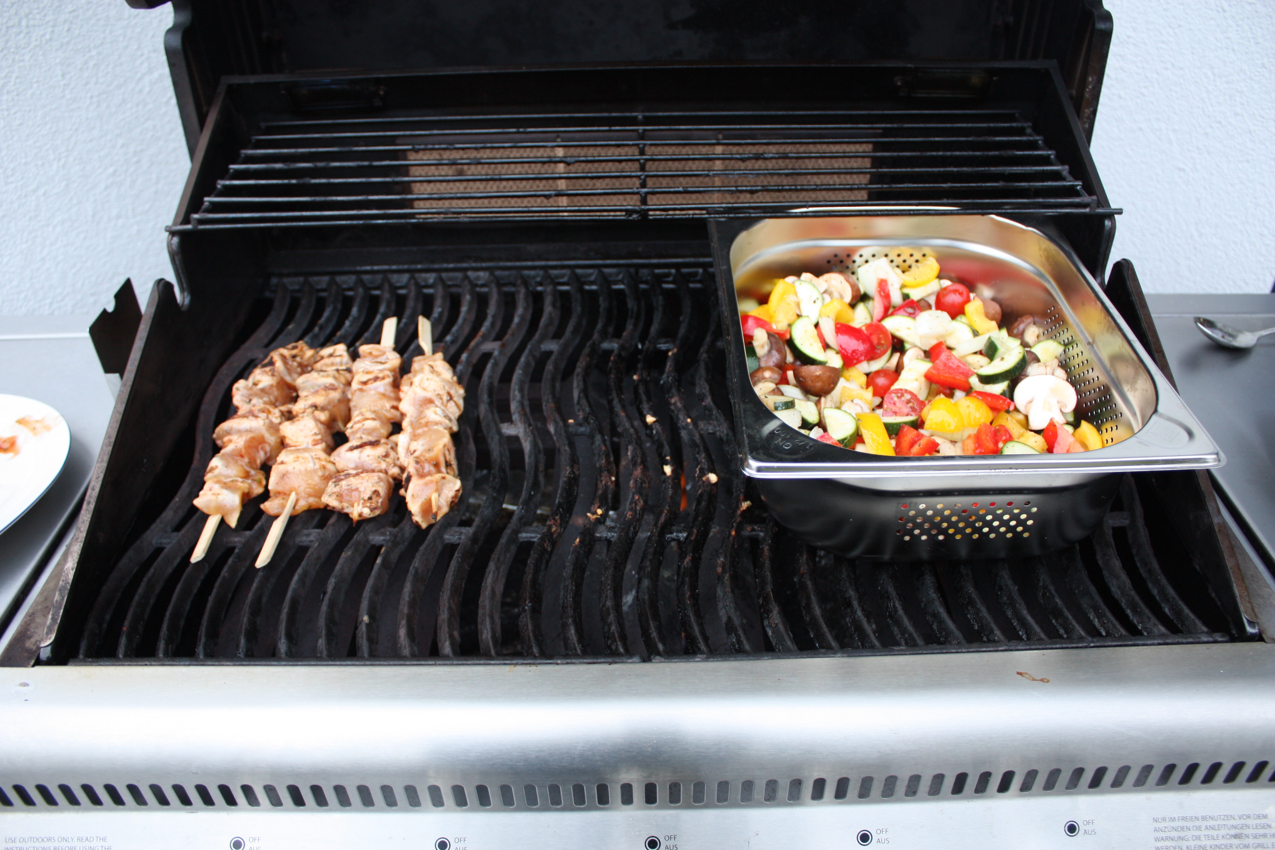 Dazu habe ich am Vortag 2 Kikok Hähnchenbrustfilets in kleine Würfel geschnitten und in einer Marinade aus Sojasauce, Teriyakisauce, Ahornsirup, süßsauer Sauce und etwas Hähnchengewürz zum Marinieren eingelegt. Nach 24 Stunden wurde das Fleisch aus der Marinade genommen, auf Holzspieße gesteckt und auf dem Napoleon Gasgrill kurz direkt angegrillt und dann in der indirekten Zone weitergegart. Zum Schluss habe ich die Spieße noch mit der Stonewall Kitchen Sauce „Garlic-Rosemary-Citrus Sauce“ glasiert und vor dem Anrichten in Sesam gewälzt. Dazu gab es knackiges Grillgemüse, das klein gewürfelt mit etwas Olivenöl, Salz und Don Marcos Wondergreen in einer gelochten GN Schale über direkter Hitze auf dem Gasgrill knackig gegart wurde.
