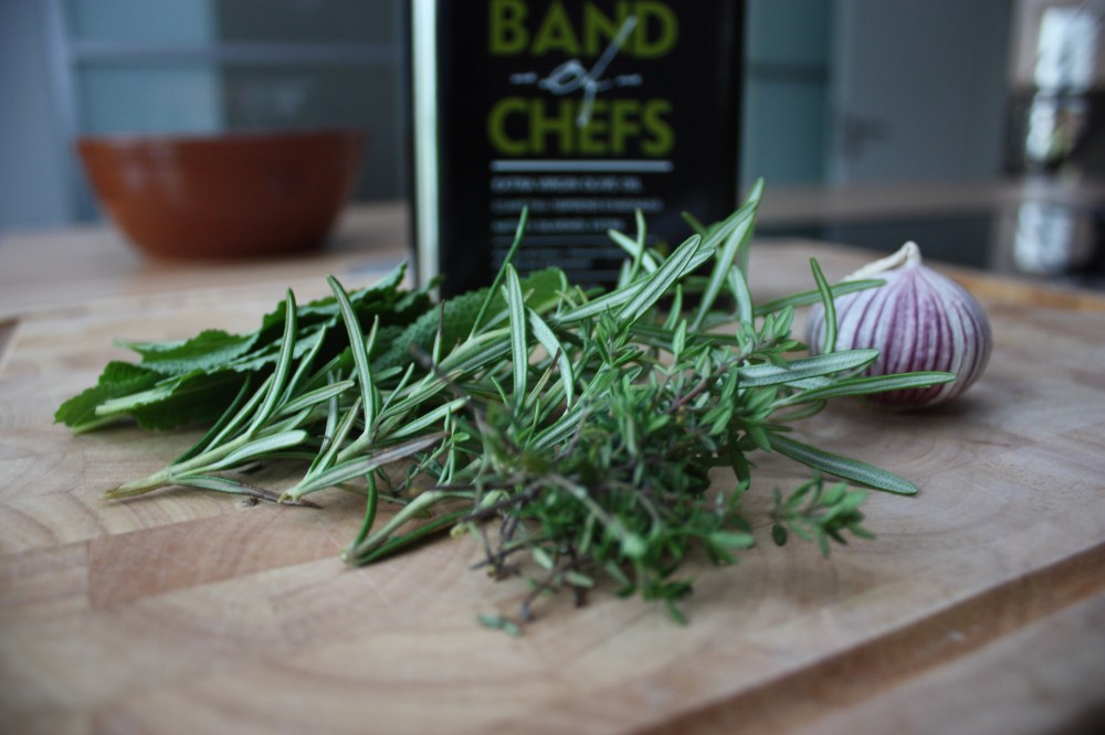Olivenöl, Knoblauch, Salbei, Rosmarin und Thymian für die Marinade.