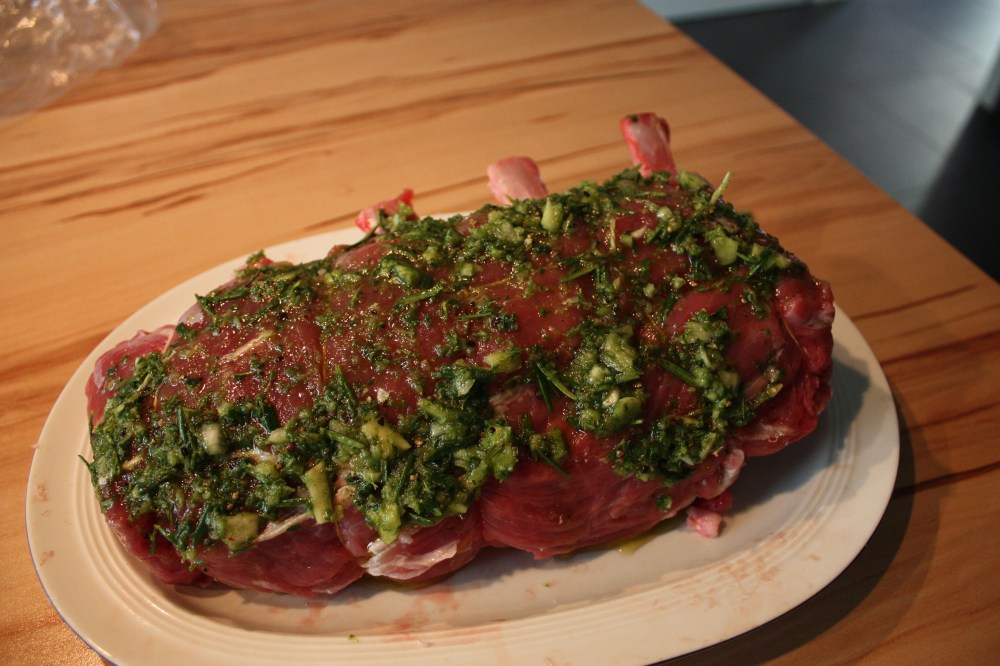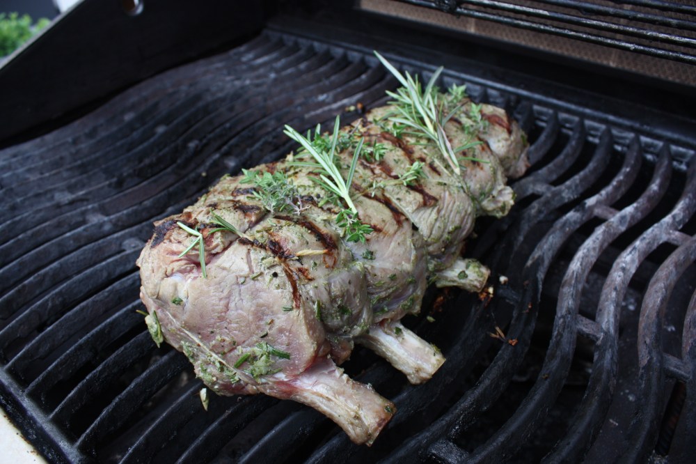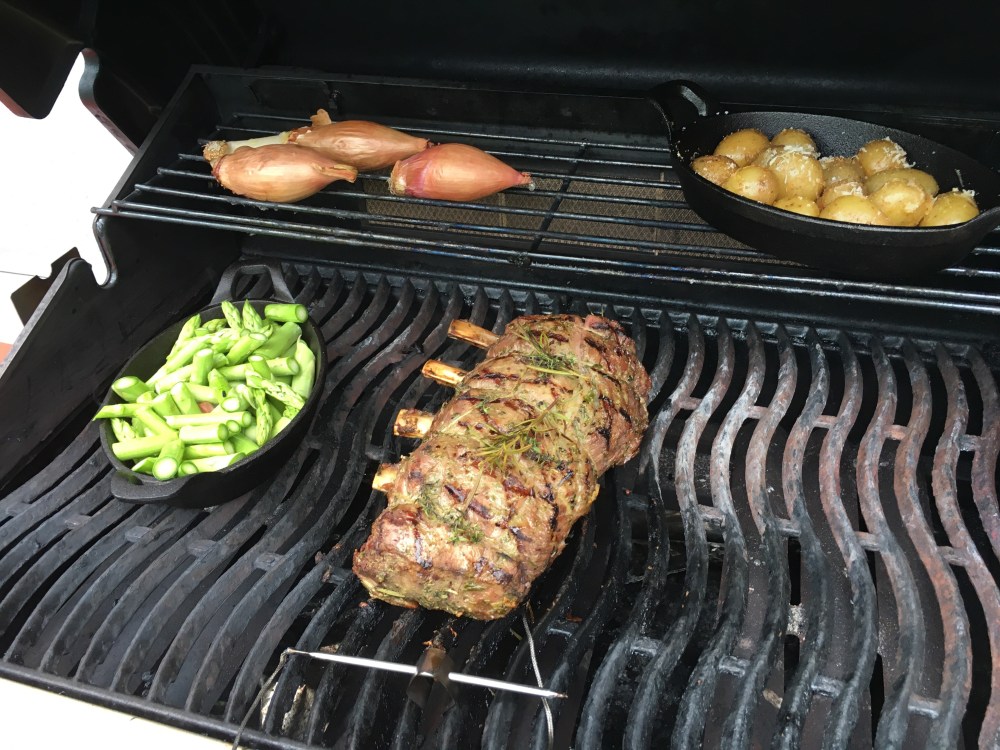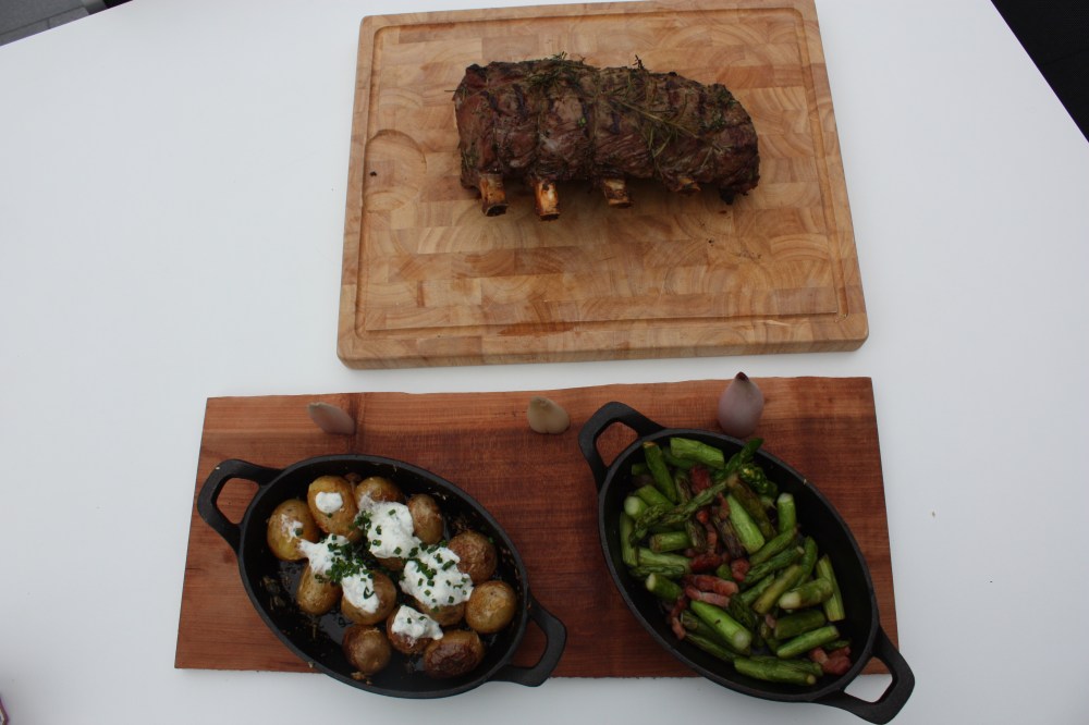 Das Karree von Silberhäuten und Sehnen befreien. Zusätzlich auf der Rückseite zwischen den Knochen die Knorpel entfernen. Die Kräuter von den Stielen zupfen und zusammen mit dem groben Meersalz, dem Pfeffer und dem gewürfelten Knoblauch mörsern, bis man eine Paste erhält. Nun etwas Limettenschalenabrieb, sowie den Saft einer halben Limette und das Olivenöl hinzugeben und gut durchrühen. 10 Minuten durchziehen lassen. Das Karree mit der Paste einreiben und in einem Plastikbeutel im Kühlschrank mindestens 12 Stunden marinieren. Zwei Stunden vor dem Grillen aus dem Kühlschrank nehmen und anschließend bei großer Hitze von allen Seiten direkt angrillen. Nach ca. 10 Minuten in den indirekten Bereich legen und bei 120 Grad bis zu einer Kerntemperatur von 62 Grad ziehen. Dieses dauert ca. 2 Stunden. Vor dem Anschnitt 5 Minuten ruhen lassen.  Dazu habe ich leckere Parmesankartoffeln mit Kräuterquark und Baconspargel aus der Gussform serviert.