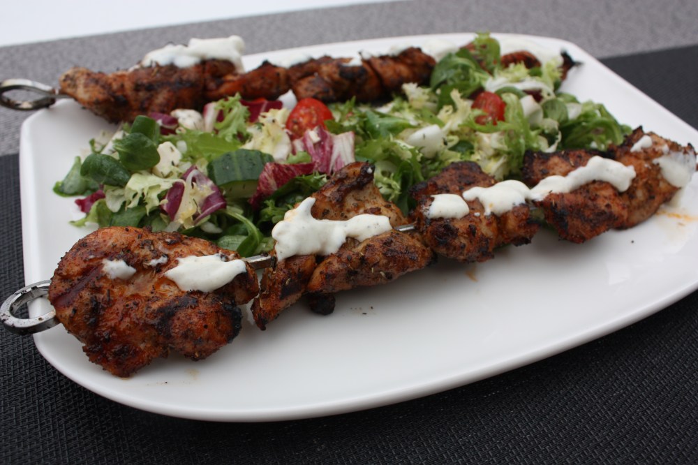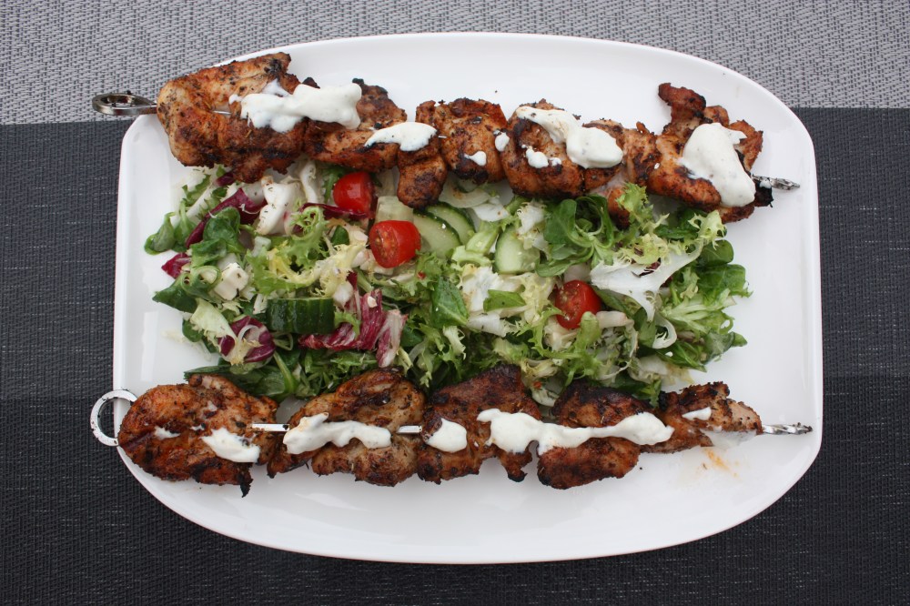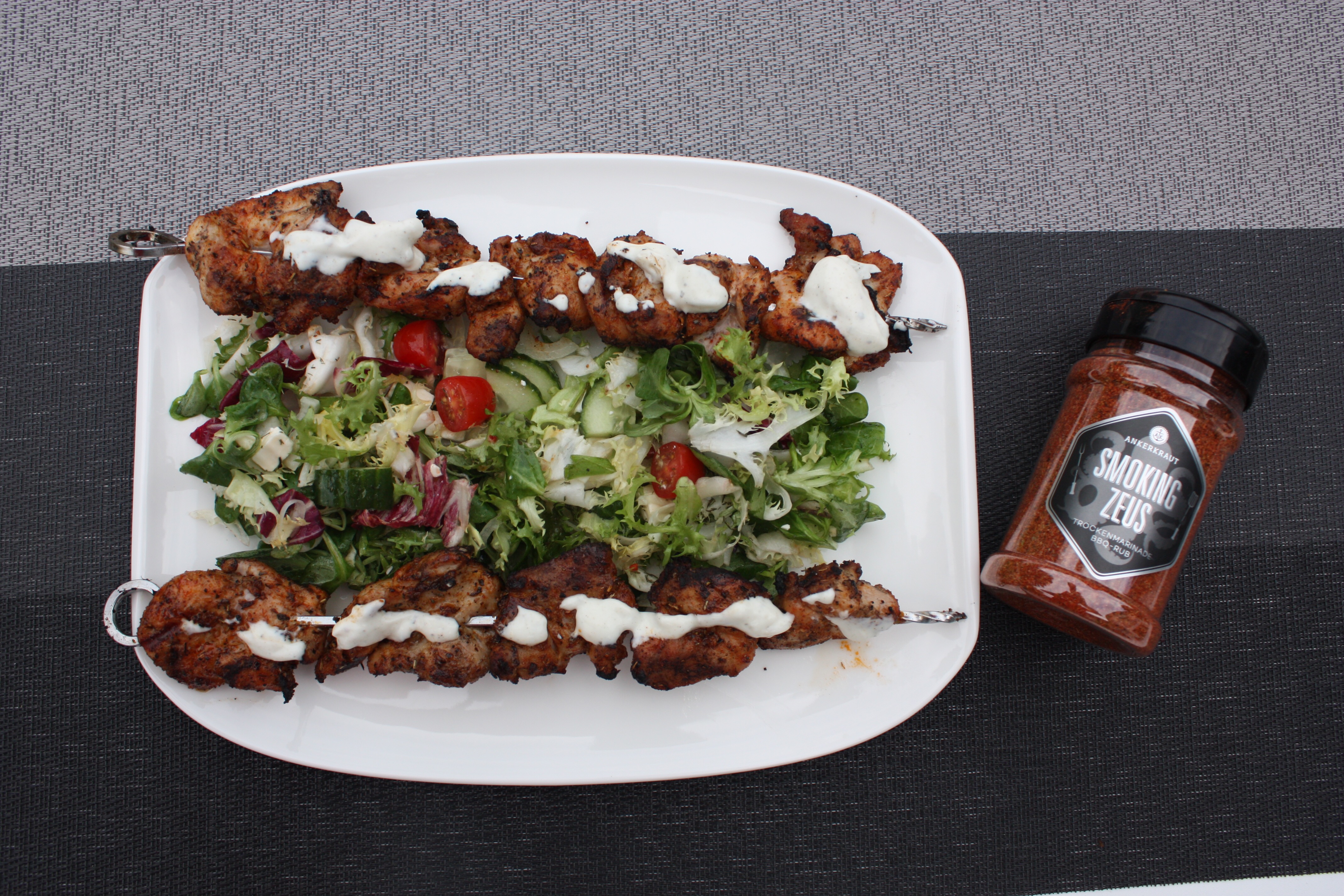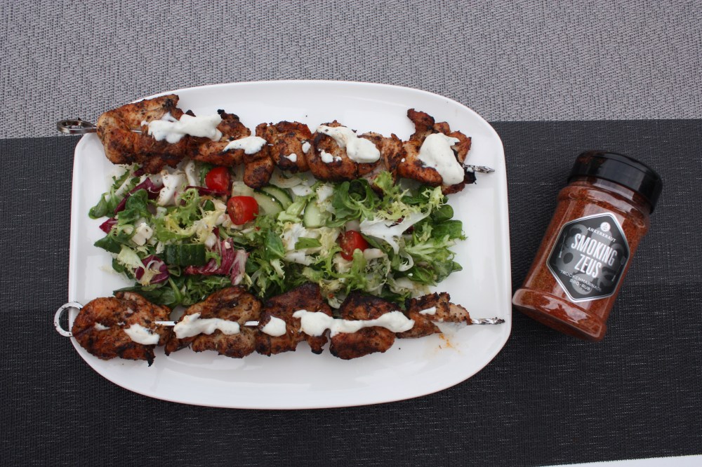 Dazu habe ich das Fleisch in kleine ca. 3 x 3 Zentimeter große Stücke geschnitten, mit etwas Olivenöl eingerieben und mit dem „Smoking Zeus“ Rub von Ankerkraut gewürzt. Anschließend durfte das Fleisch eine Stunde marinieren. Auf Spieße gesteckt habe ich sie kurz auf der Sizzle Zone angegrillt und im Grill bei mittlerer indirekter Hitze 10 Minuten gar ziehen lassen. Serviert wurden die leckeren Spieße auf einem griechischen Bauernsalat und mit etwas Tzatziki.