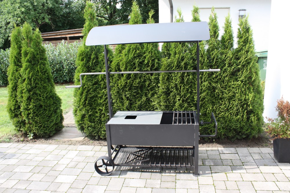 Hier sieht man das montierte „Galgengestänge“ Dieses dient als Grundgerüst für das optionale Dach und die Spießvorrichtung. Auch Töpfe, Pfanne, und Grillbesteck lassen sich hier praktisch und dekorativ aufhängen. Zu sehen ist hier auch der montierte schwenkbare Pfannenhalter.