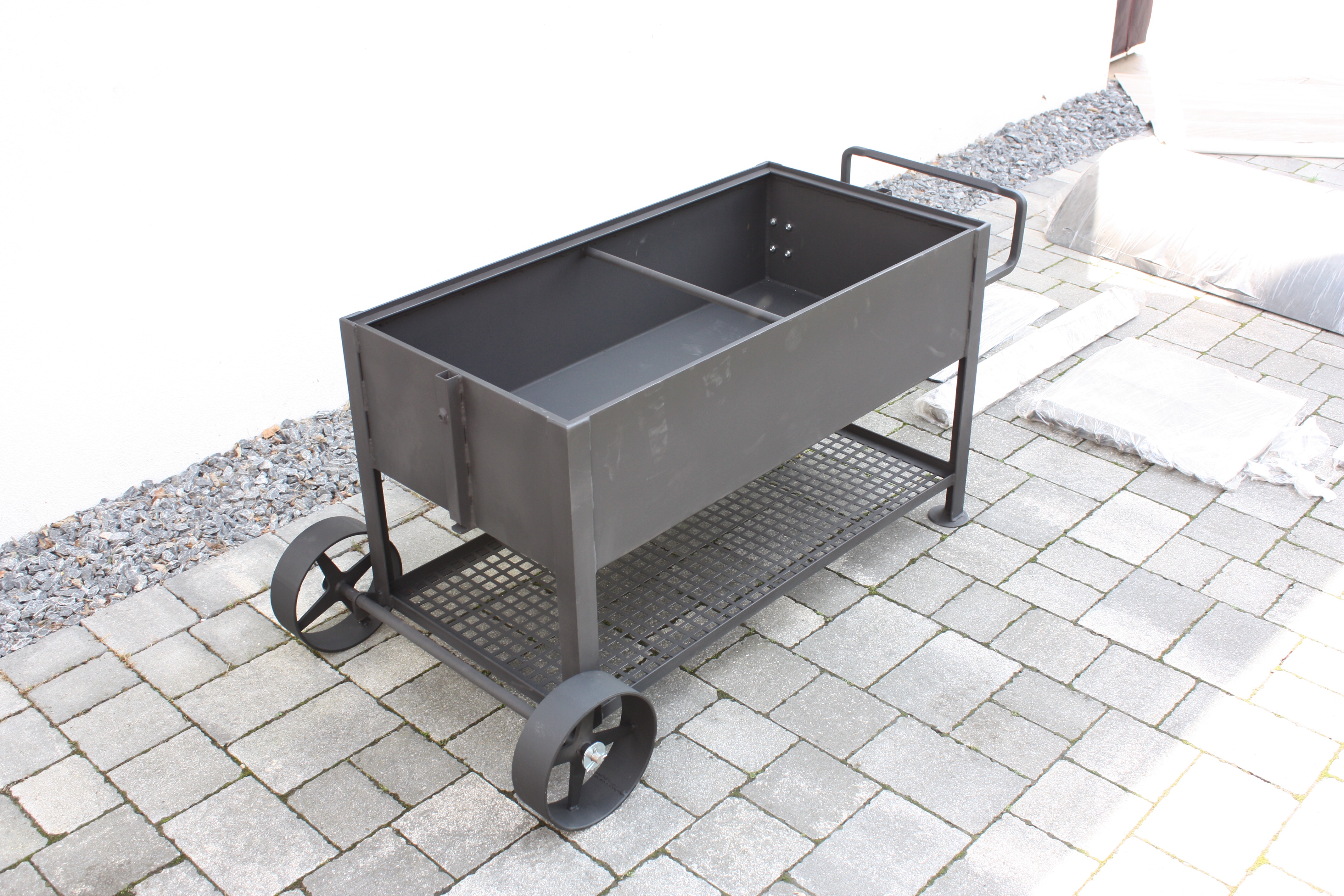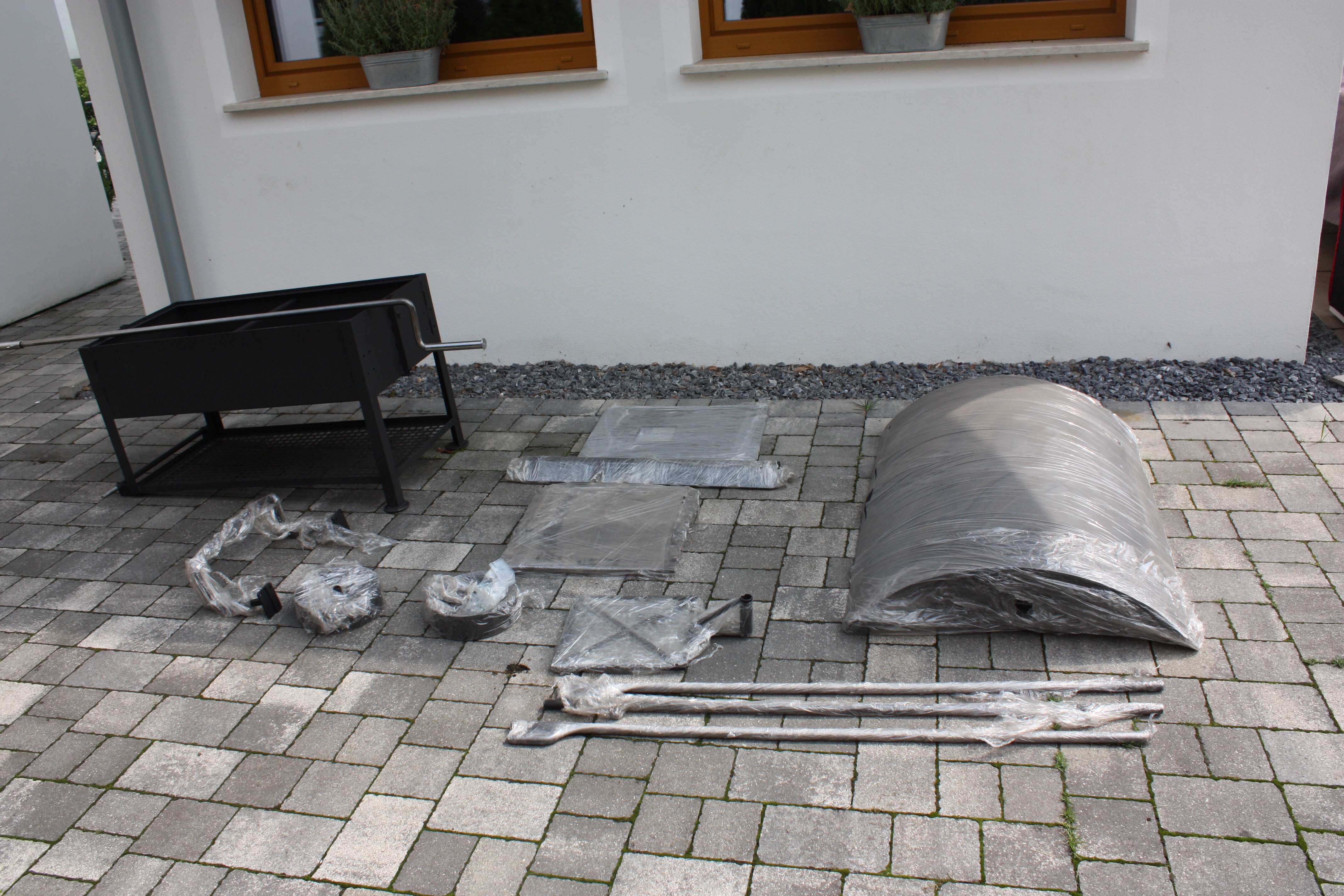Auf dem Bild seht ihr alle Teile die die zur Montage des Grundgerätes gehören und ein paar Extras wie die Spießadaption, den höhenverstellbaren Schwenkarm für Töpfe und Pfannen, die Grillplatte und das Dach. Alles super mit Ofenfarbe mattscharz lackiert und mit Stretchfolie umwickelt.