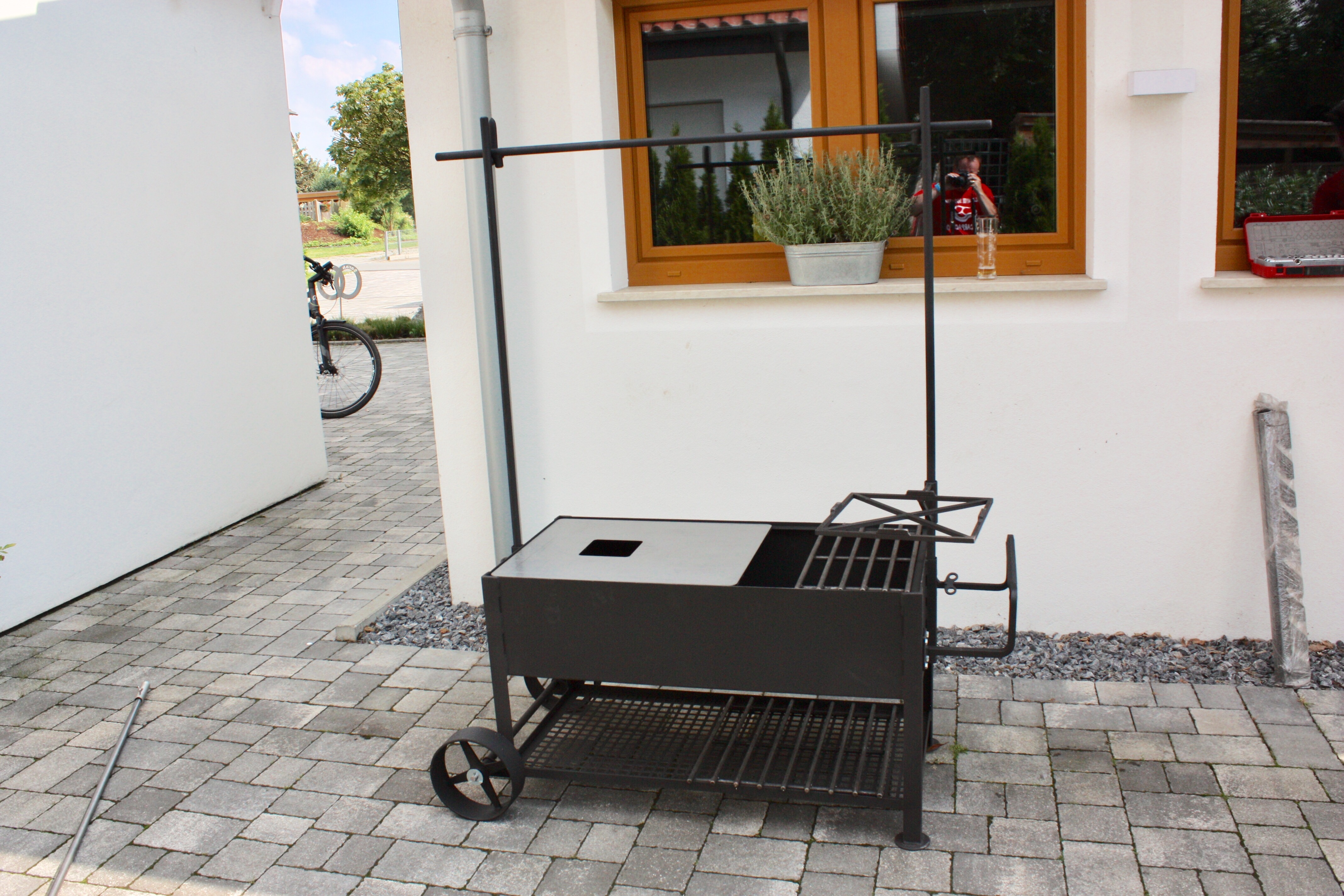 Hier sieht man das montierte „Galgengestänge“ Dieses dient als Grundgerüst für das optionale Dach und die Spießvorrichtung. Auch Töpfe, Pfanne, und Grillbesteck lassen sich hier praktisch und dekorativ aufhängen. Zu sehen ist hier auch der montierte schwenkbare Pfannenhalter.