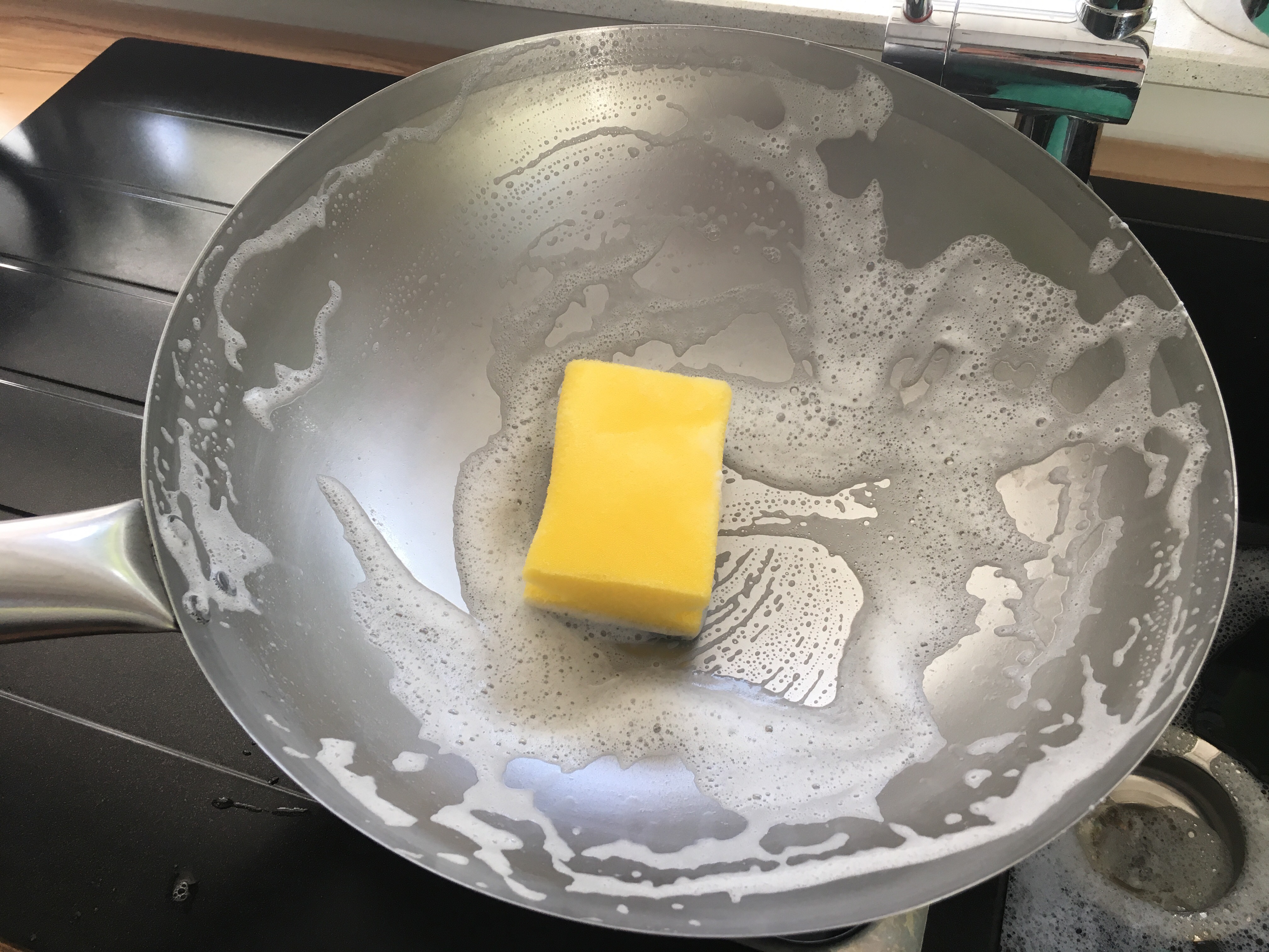 Als erstes wird der Wok gründlich von innen mit einem Topfschwamm gereinigt und gut abgetrocknet.