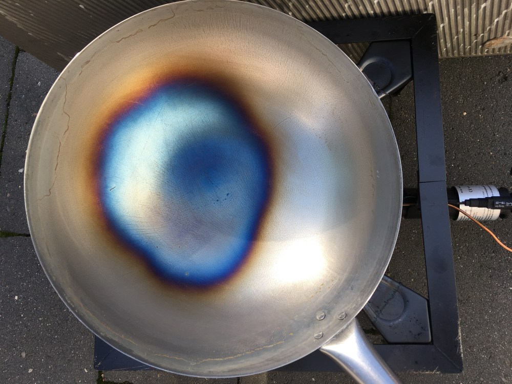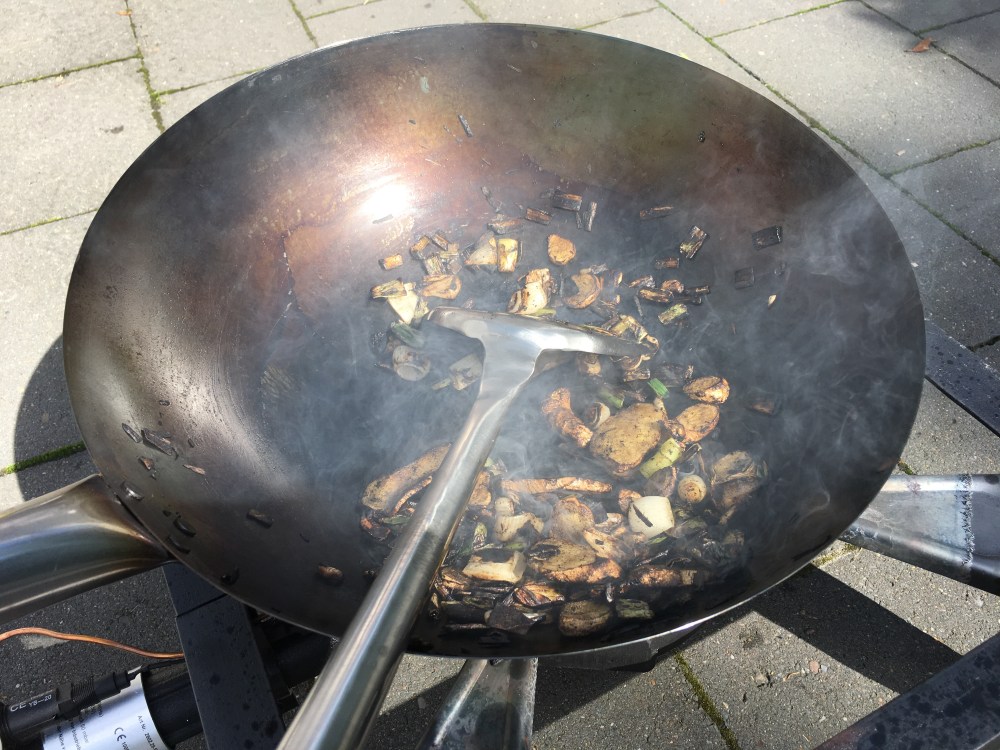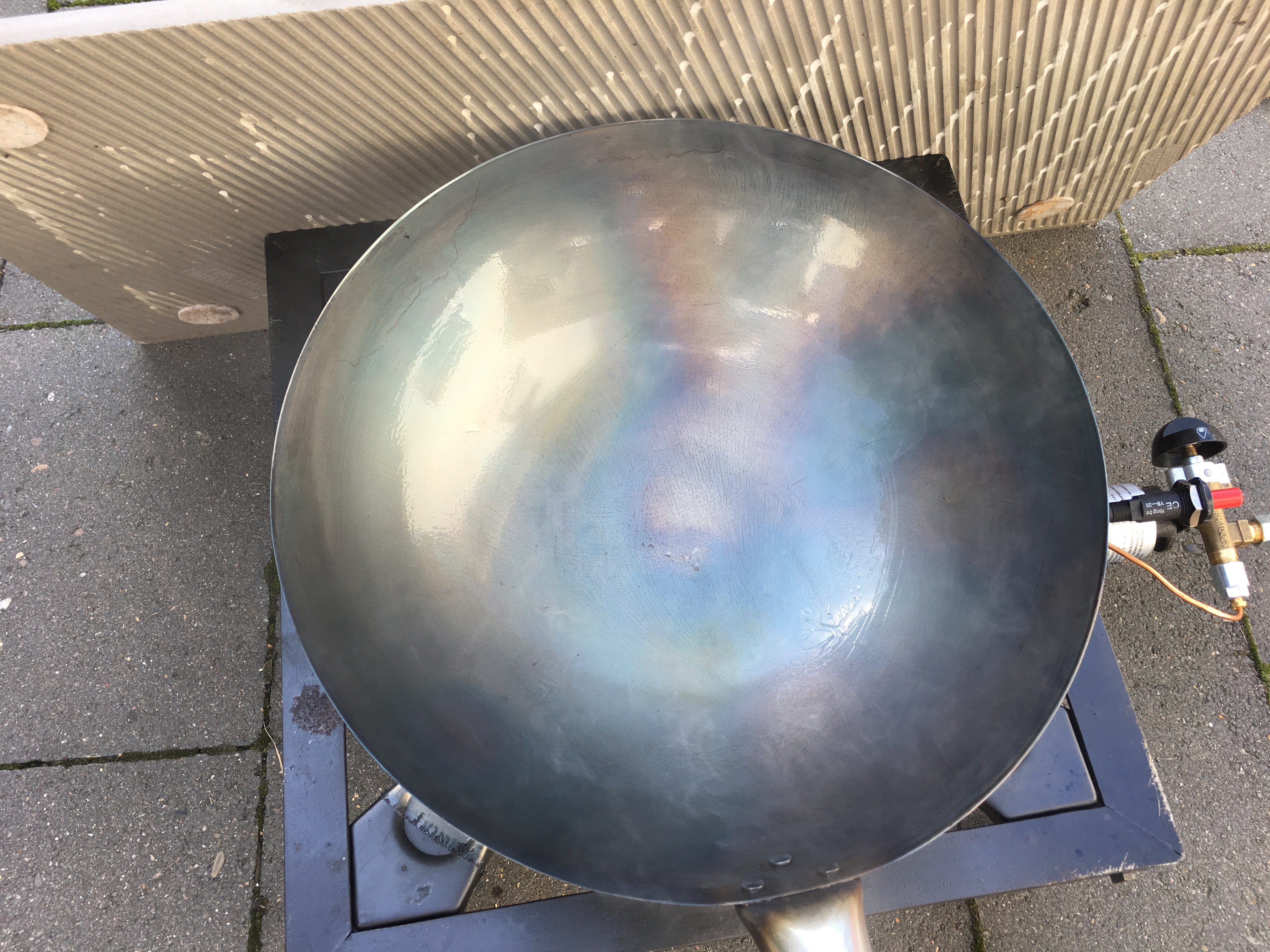 Dann wird der Wok auf großer Flamme so lange erhitzt, bis er sich verfärbt.