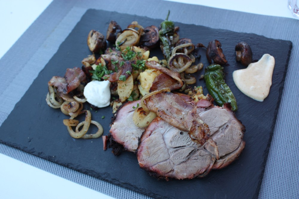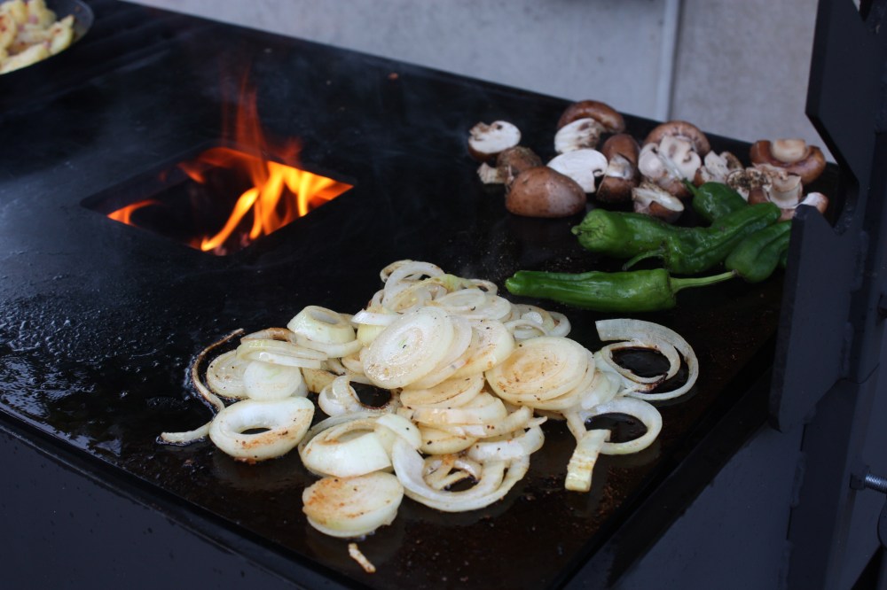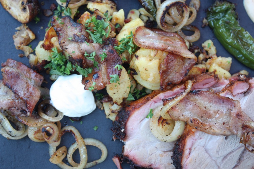 In einer Eisenpfanne habe ich deftige Röstkartoffeln mit Speck gemacht. Auf der Eisenplatte wurden Zwiebeln, Champions, Bratpaprika, Bacon und ein Spiegelei gebraten.