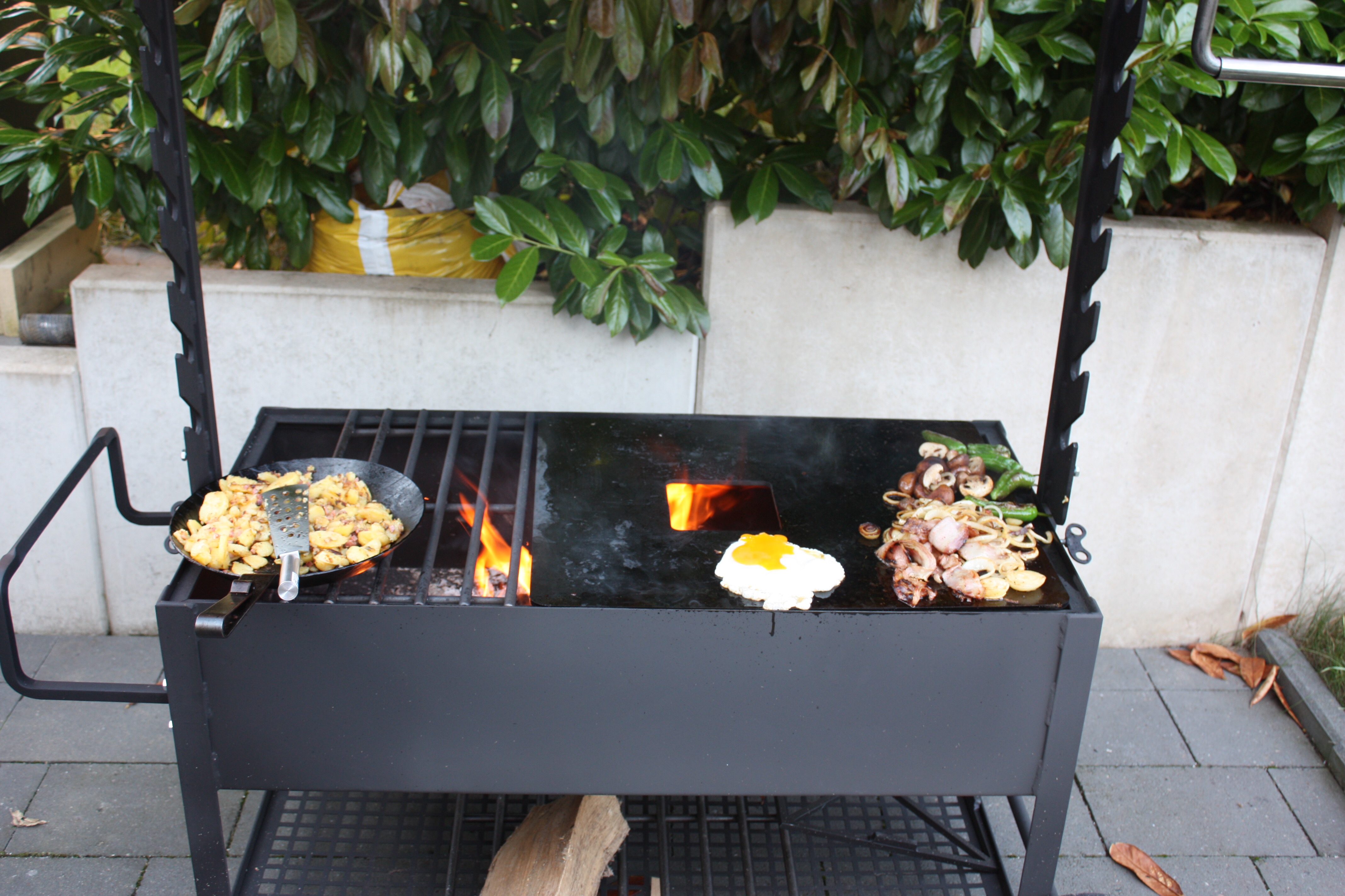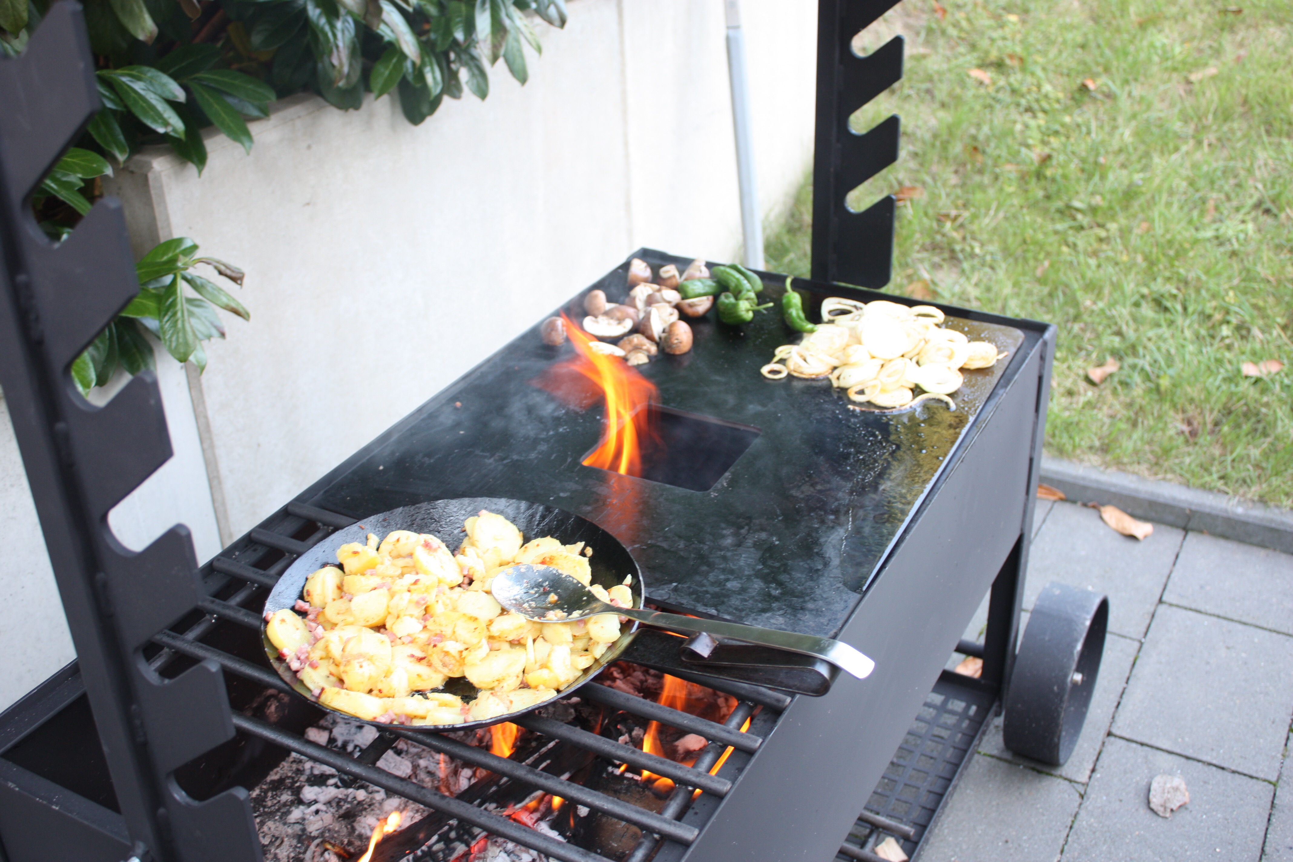Röst- oder Bratkartoffeln über offenem Feuer zu braten, ist schon etwas Feines. Auch die Eisenplatte ist super. Schmorgemüse und Spiegelei sowie krosser Bacon sind ohne Probleme zuzubereiten. So macht Kochen Spaß! Ich freue mich schon auf die ersten Burger von der Platte!