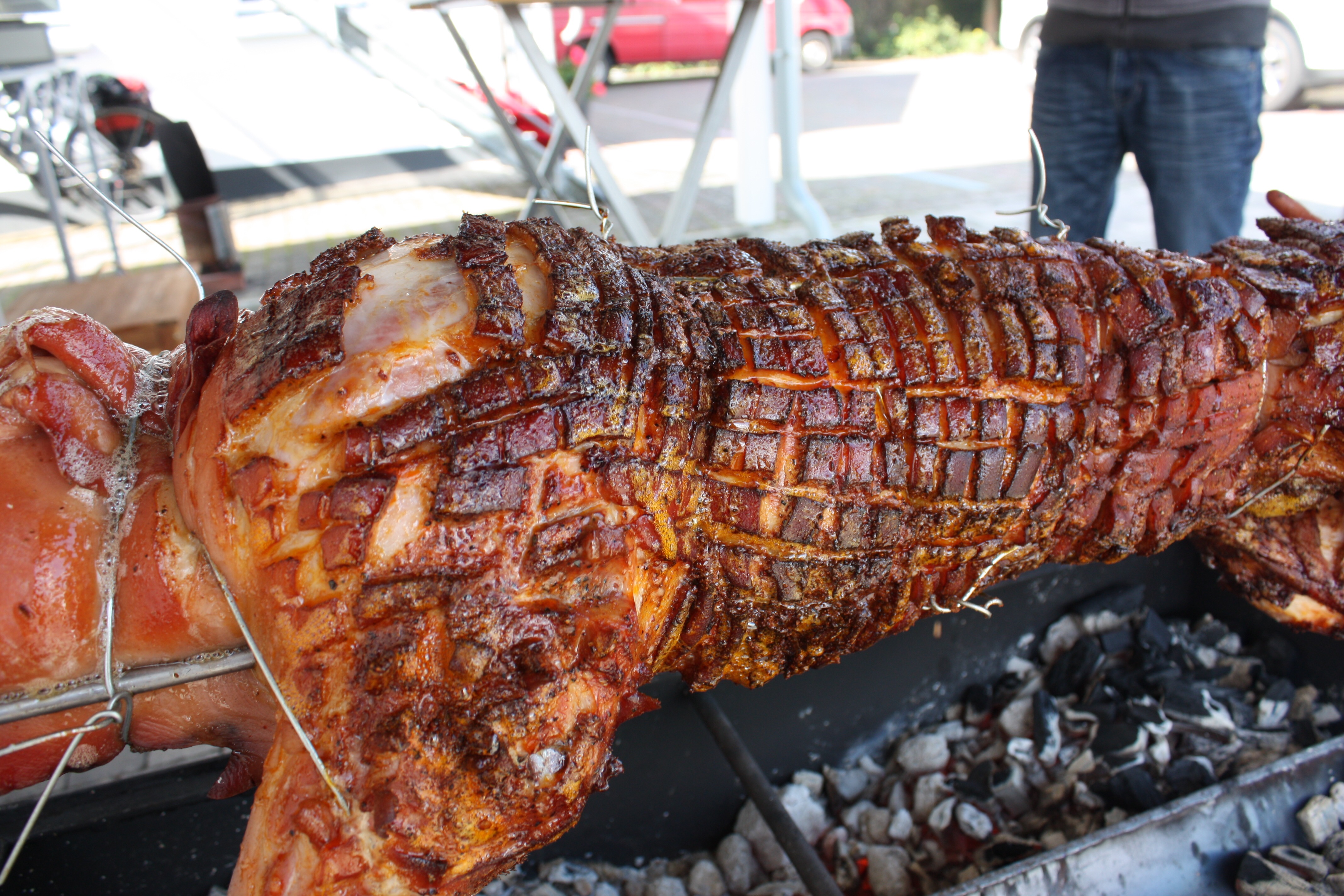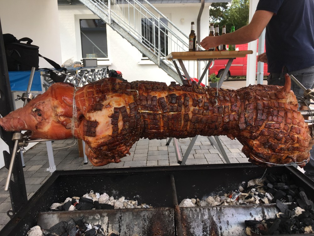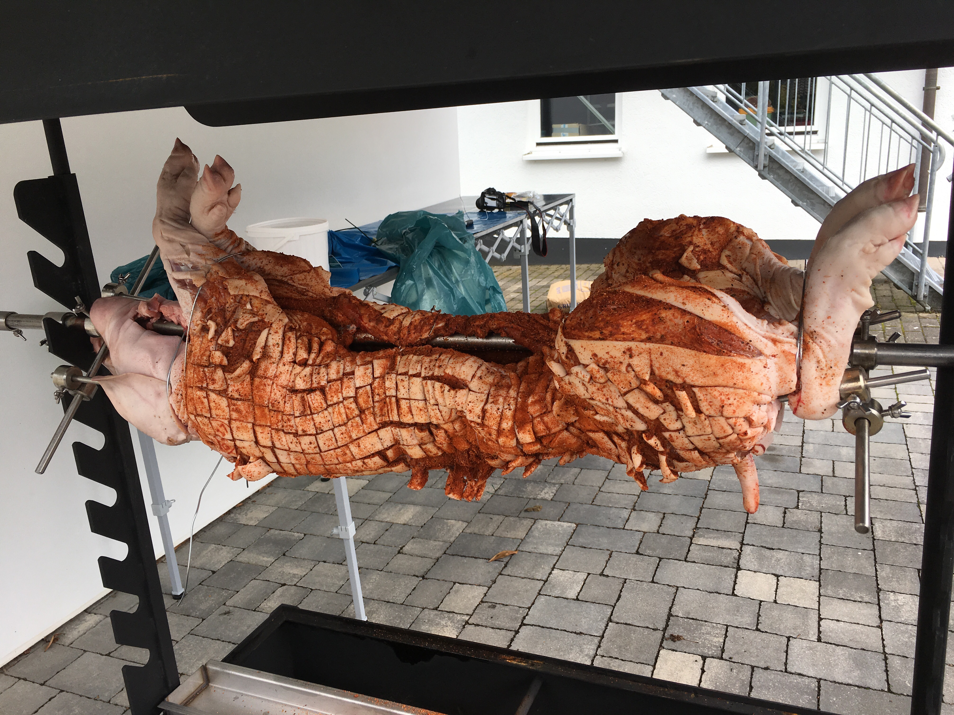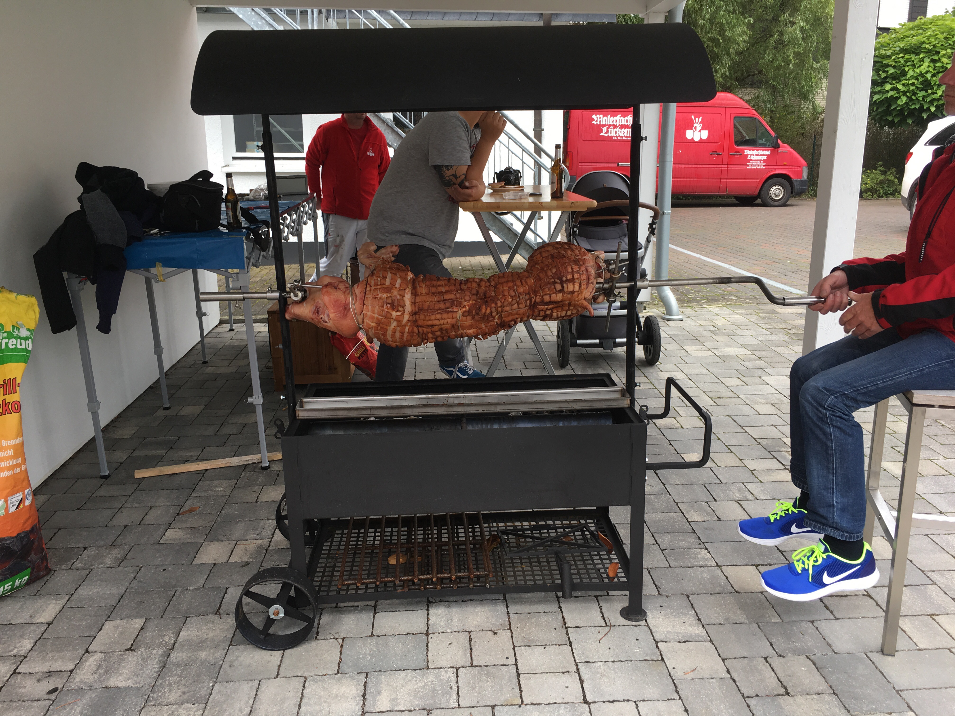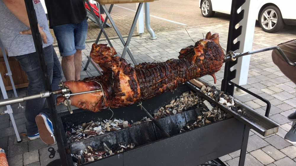 Zum Bundesligaauftakt haben wir eine 20kg Grillsau auf „Toms Westernküche“ von der Firma Ramster zubereitet. Die Sau haben wir von unserem Partner und Metzger unseres Vertrauens Thorsten Schlacke bezogen. Die Sau wurde von ihm mit Salzlacke gespritzt und die Schwarte eingeritzt. Zusätzlich wurde sie nach dem Platzieren auf dem Spieß von uns mit „Pull that Piggy“ von Ankerkraut gewürzt. Das Schwein wurde ca. 6 Stunden über einem Holzkohlebett auf der Westernküche gegrillt. Der Spieß wurde von Hand gedreht. Das Ergebnis war ein Knaller! Hier ein paar Bilder von der Aktion…