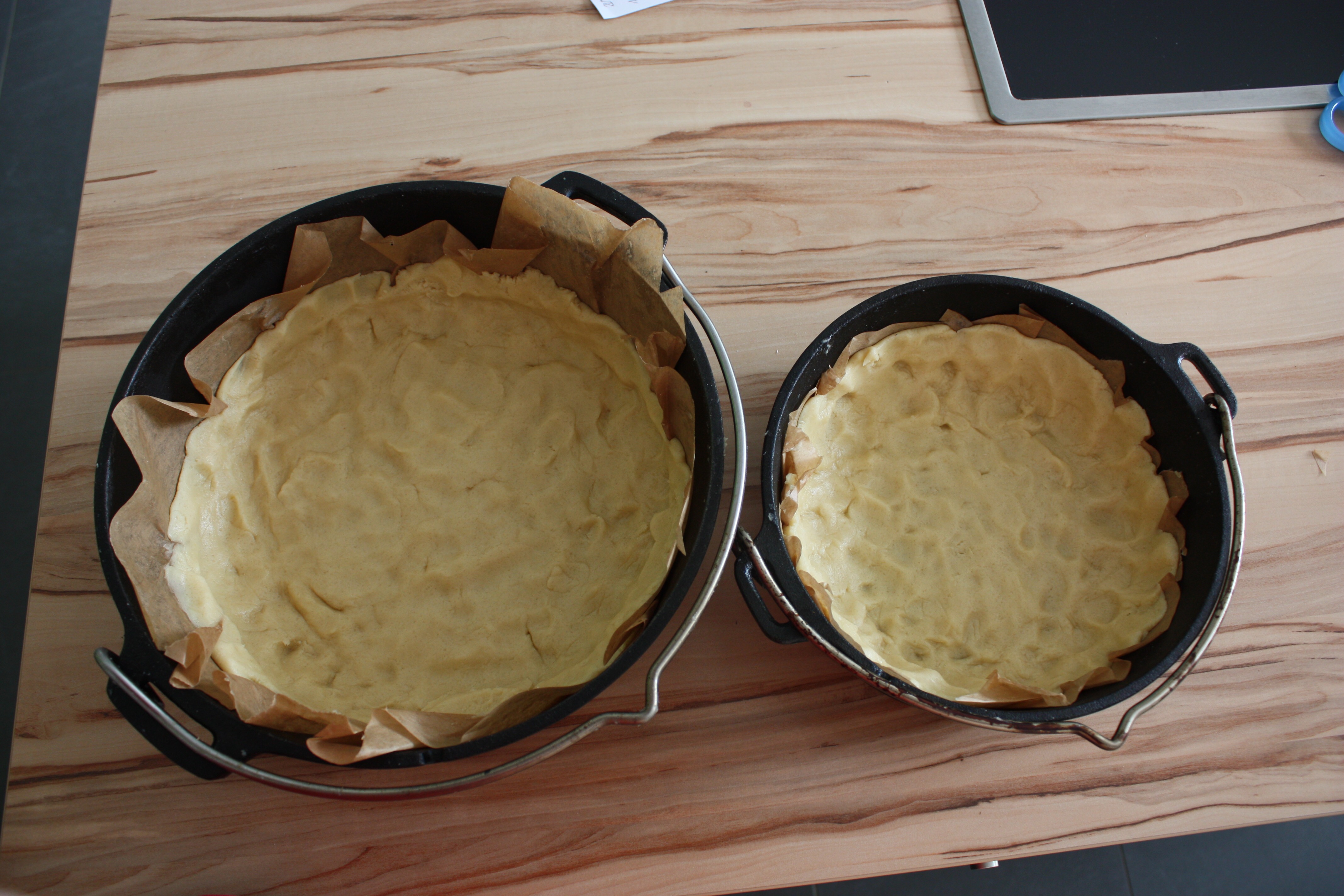Die Mengenangaben beziehen sich auf eine ganz normale Springform für den Backofen. Ich habe 1 1/2 Rezepte gemacht und den Teig auf einen Petromax ft 3 und einen ft 4,5 aufgeteilt.