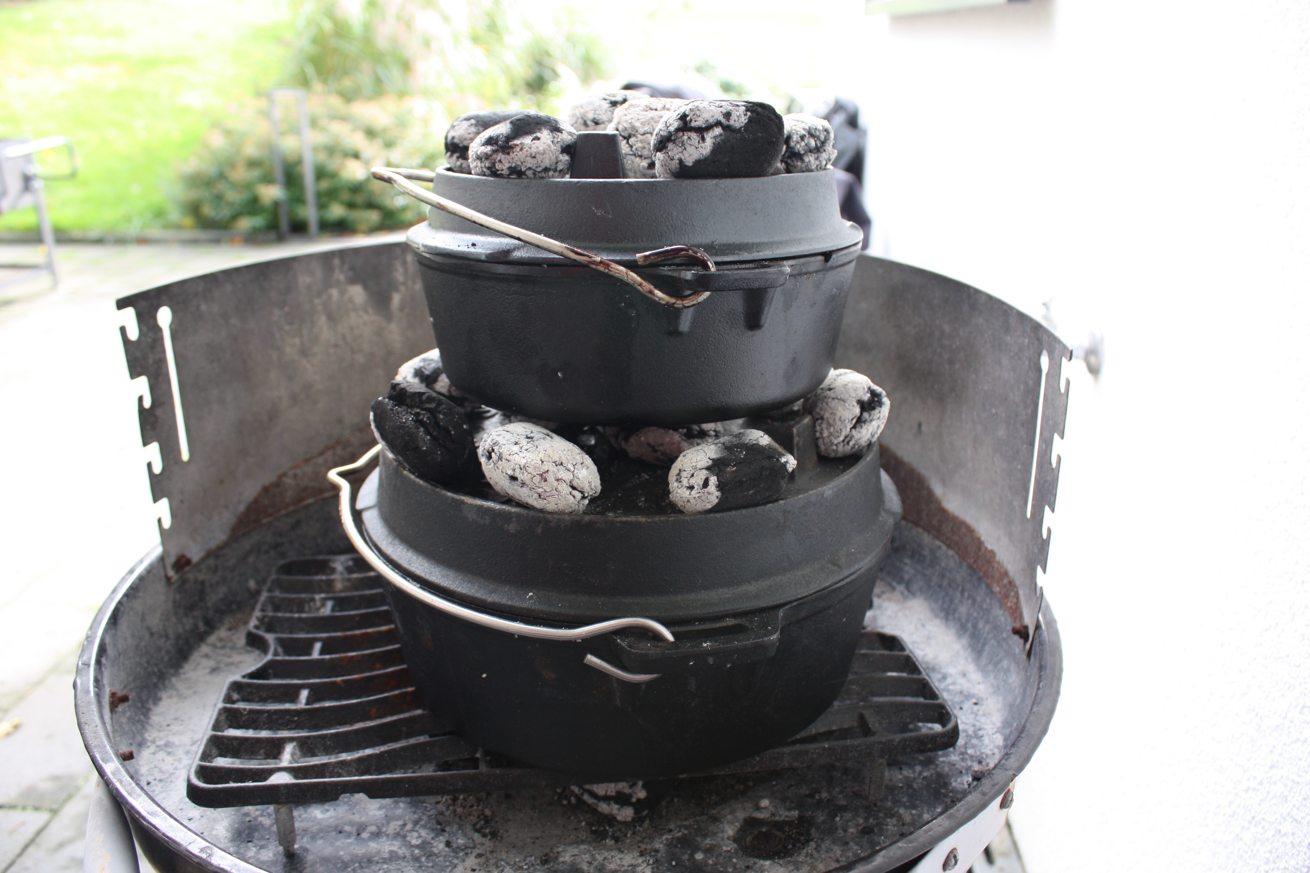 7. Ich habe beide Duchoven übereinander gestellt. Beim ft 4,5 wurden unten 5 und oben 12 Briketts plaziert. Der kleine hatte somit 3 unten (die Briketts in der Mitte) und 8 oben, was sich als etwas zuviel herausgestellt hat. Der kleine Kuchen war nach 40 Minuten schon recht dunkel. Er hat wohl doch etwas zuviel Unterhitze abbekommen. Für einen einfachen Ft6 würde ich unten 5 und oben 13 Kohlen empfehlen. Schaut nach 40 Minuten einmal nach….Alternativ in einer Backspringform bei 175 Grad ca. 40 min. im Backofen, aber das macht ja keinen Spaß…