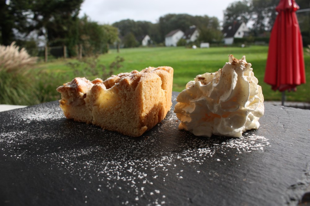 Zum Apfelkuchen schmeckt am besten frische Schlagsahne und/oder eine Kugel Vanilleeis.