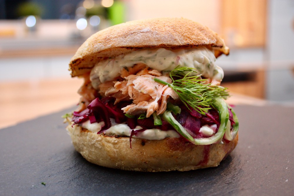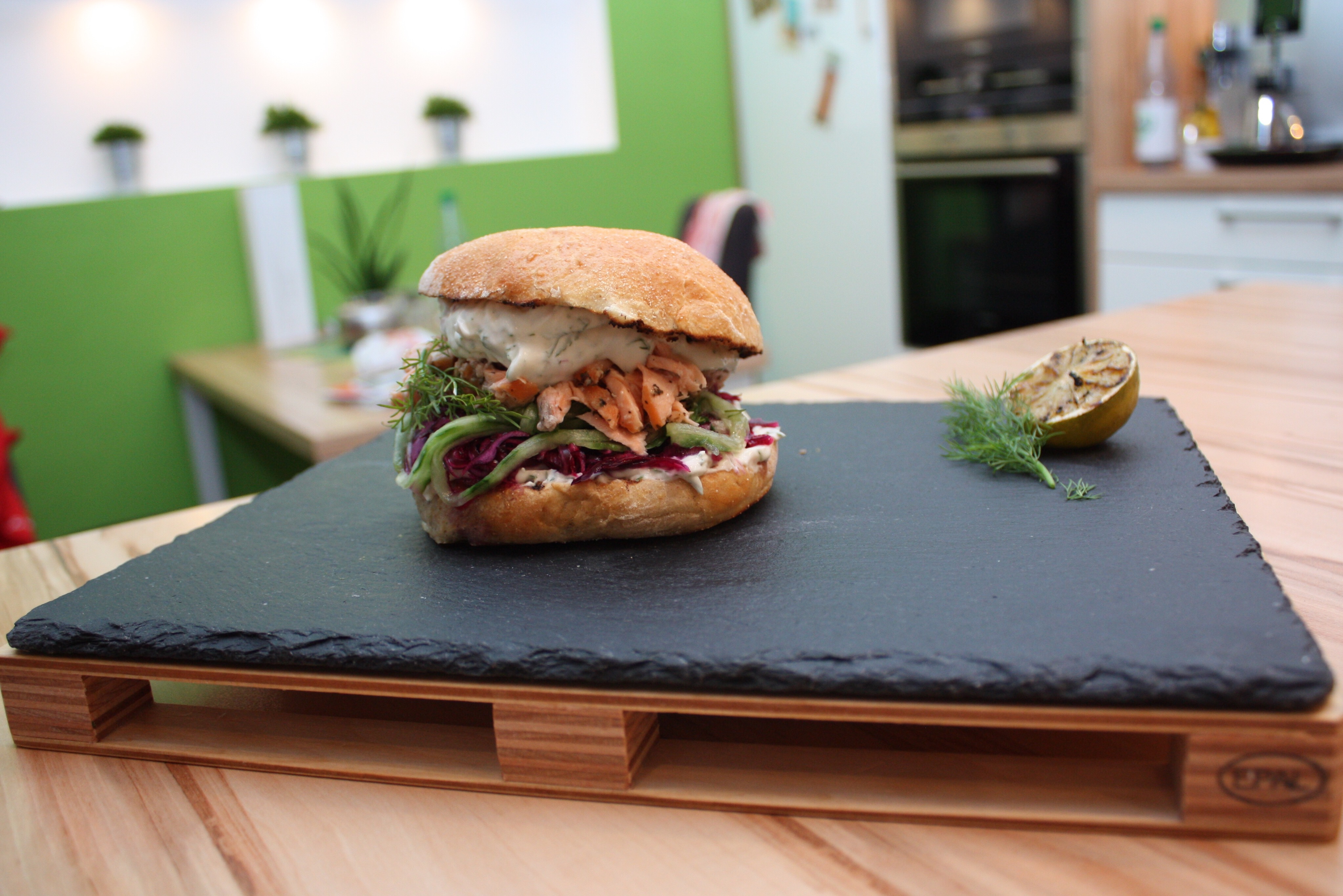 Mögt ihr gerne Lachs von der Planke und saftige Burger? Dann ist das hier genau das Richtige für euch: Pulled Lachs Burger!
