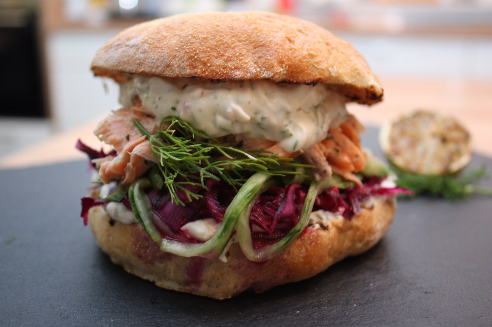 Während der Lachs im Grill gart, können die anderen Zutaten für den Burger zubereitet werden. Das geht schnell und ist kein Hexenwerk. Der Sauerrahm wird mit einer Handvoll kleingehacktem Dill, einer halben gewürfelten roten Zwiebel und etwas Limettensaft verrührt und mit Pfeffer, Salz und einer Prise Zucker abgeschmeckt.