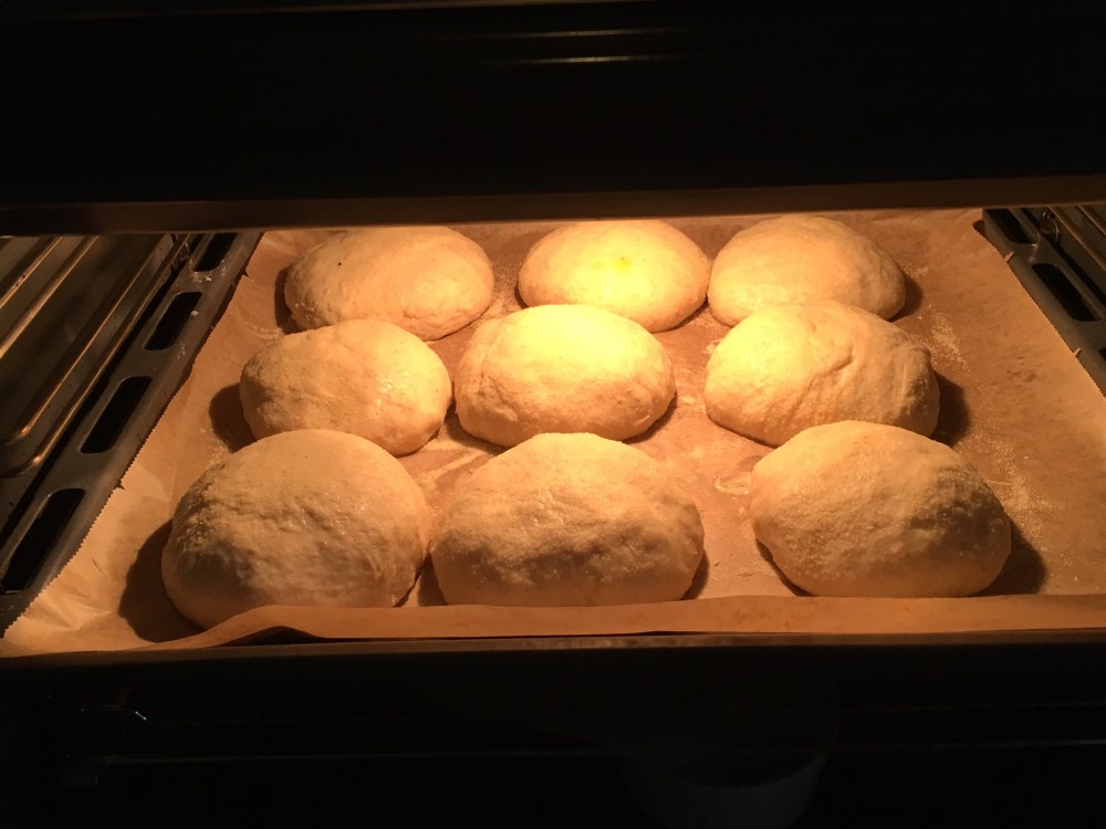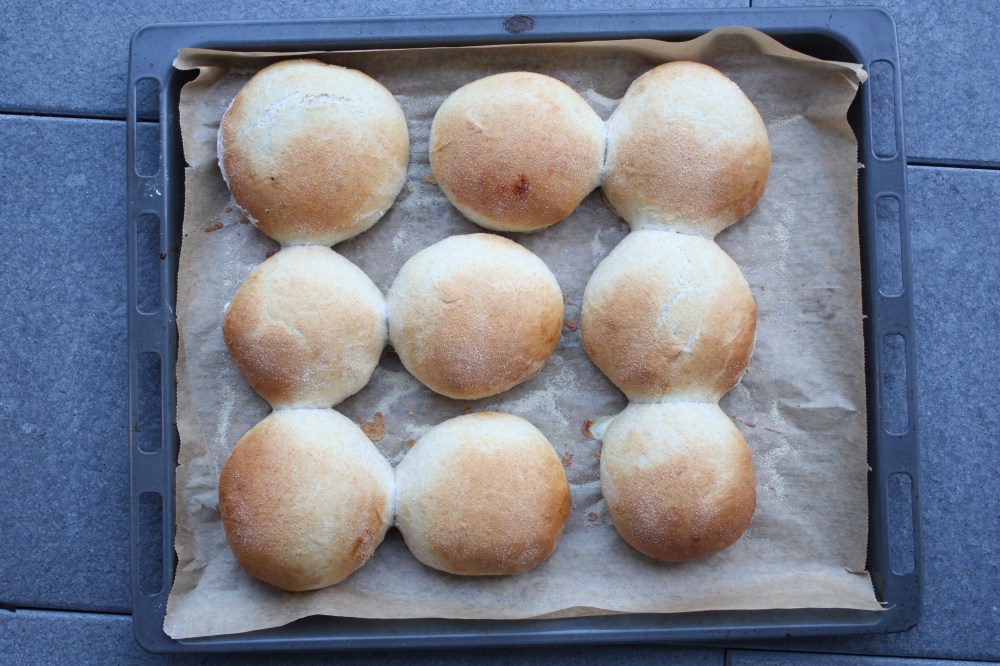 Den Teig 45 Minuten abgedeckt gehen lassen. Nach dieser Zeit den Teig noch einmal auf einer bemehlten Fläche durchkneten und daraus ca. 9 schöne Buns formen. Dabei immer den Teig nach unten umschlagen, damit sie eine Oberflächenspannung gekommen. Abgedeckt 1 Stunde gehen lassen.
