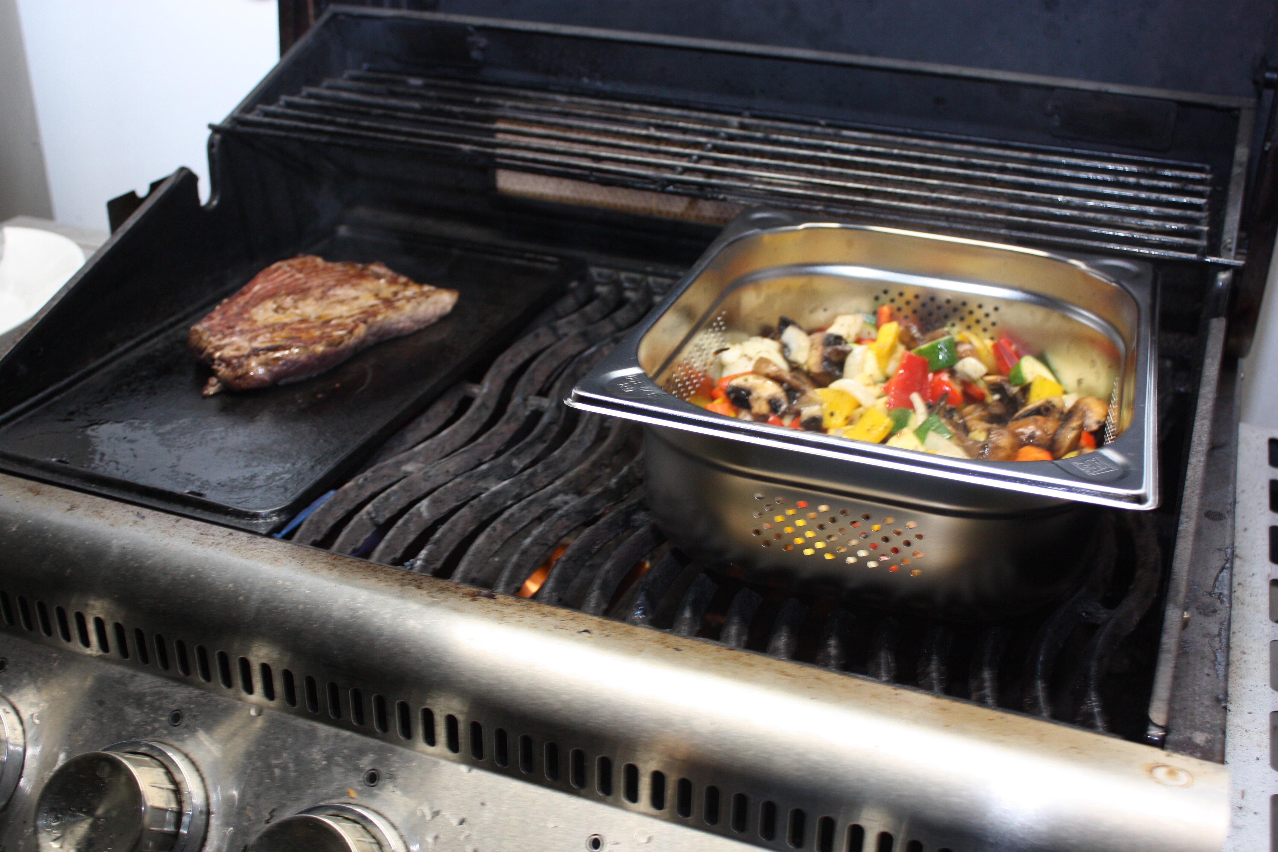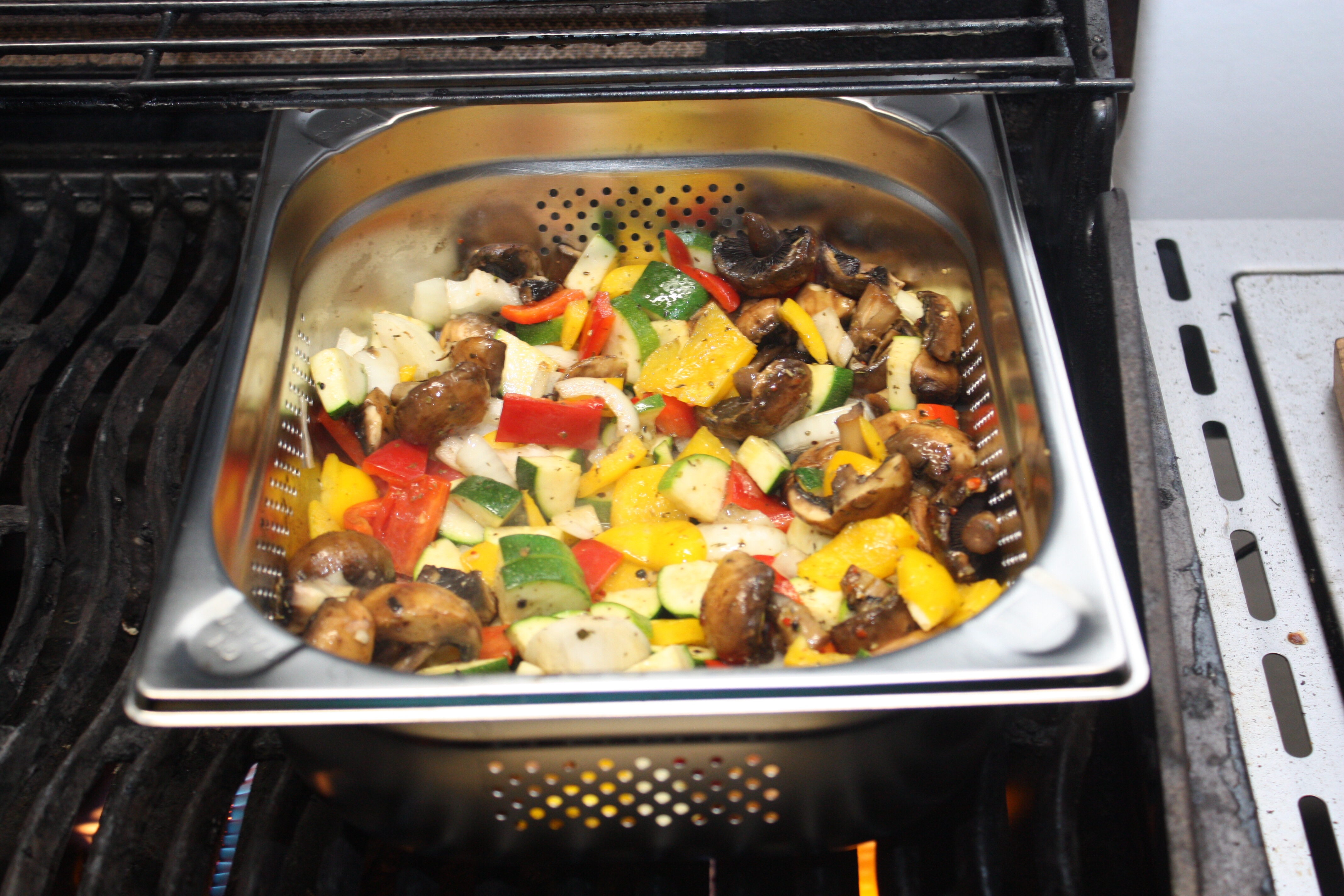 Für das Grillgemüse wurden Champignons, Paprika, Zucchini und Zwiebeln gewürfelt, mit Olivenöl, Salz und Don Marcos „Wondergreen“ gewürzt. In einer gelochten GN Schale wurde das Gemüse anschließend knackig gegart.