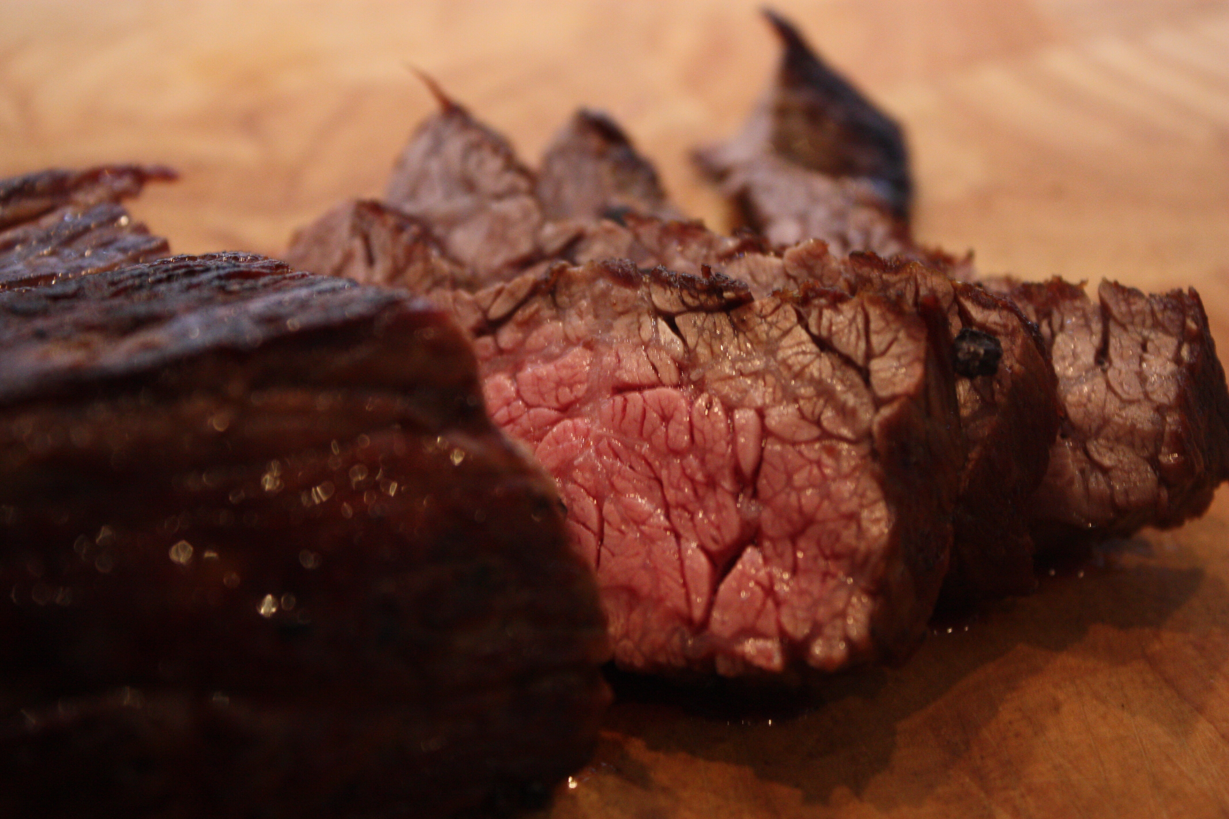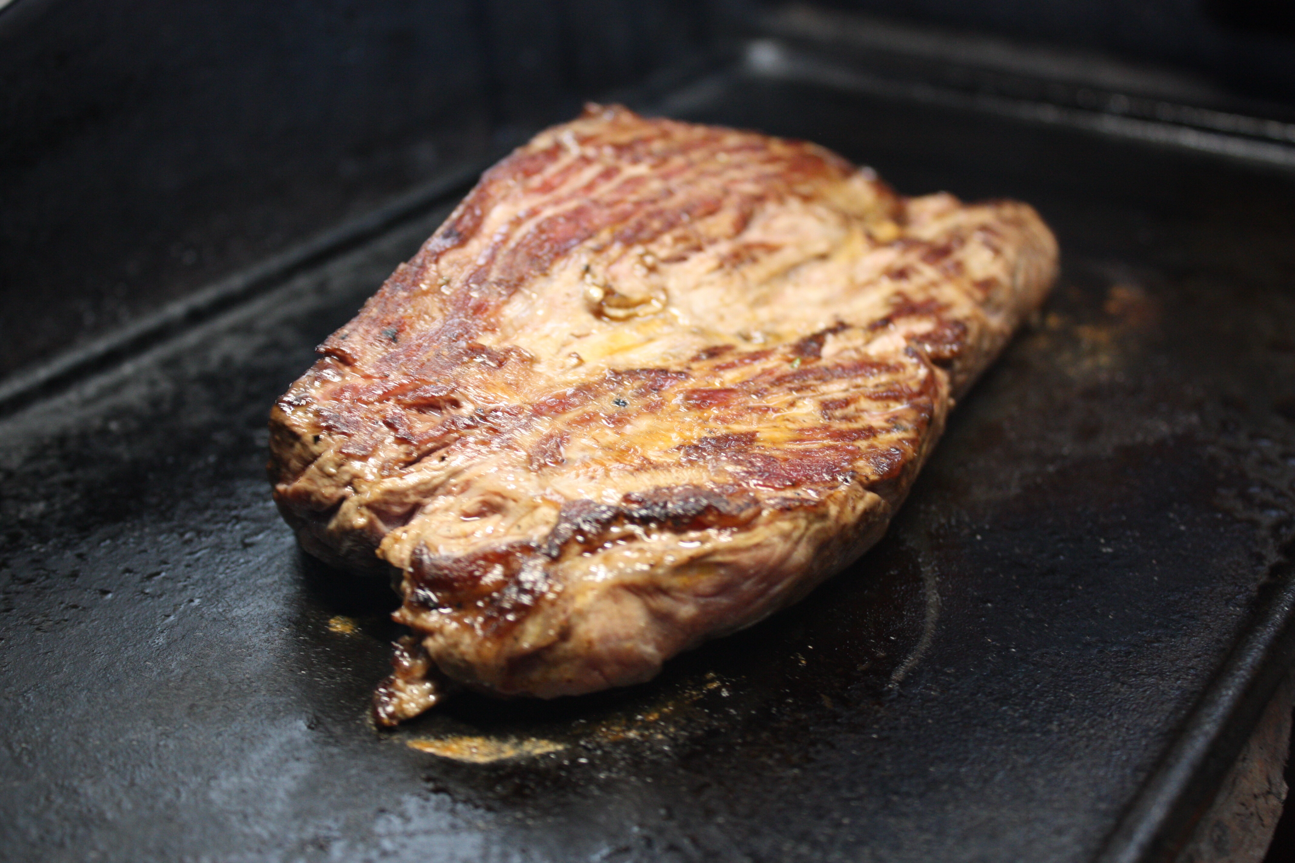 Auf der sehr heißen Gusspatte wurde das Flapsteak angebraten.