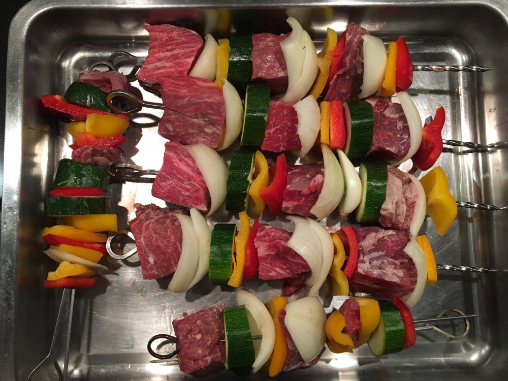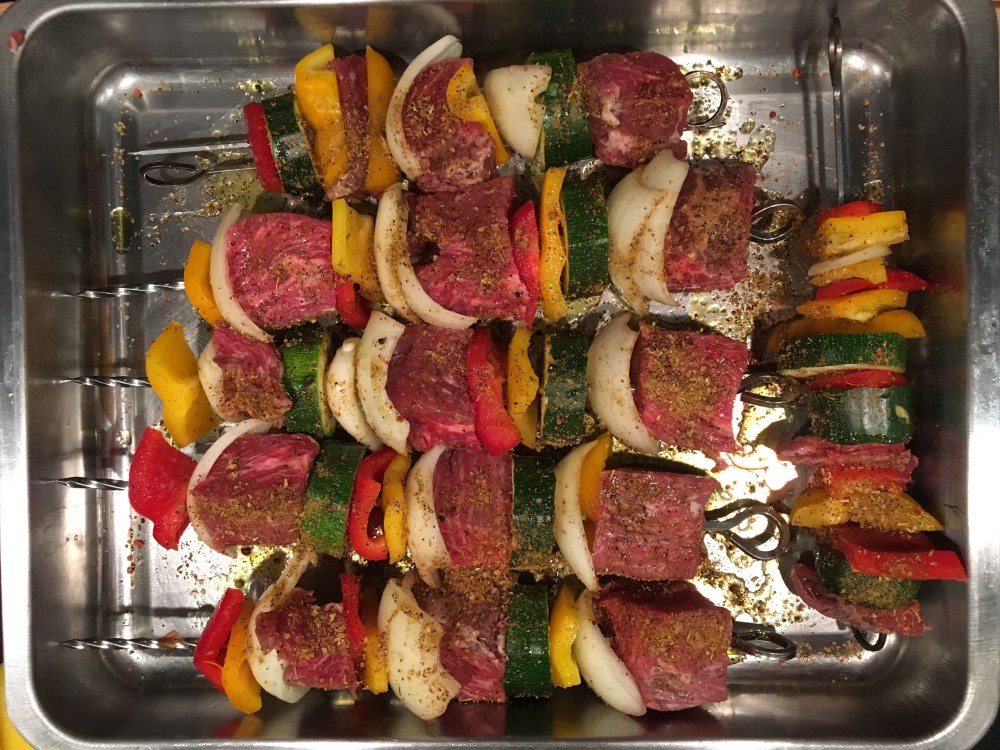 Das Fleisch würfeln und das Gemüse in passende Stücke schneiden und abwechselnd auf die Spieße stecken. Kartoffeln vierteln und ca. 20 Minuten vorkochen.