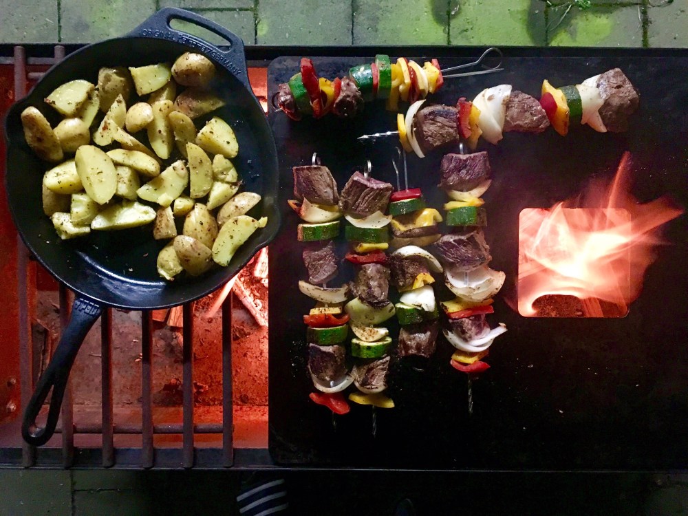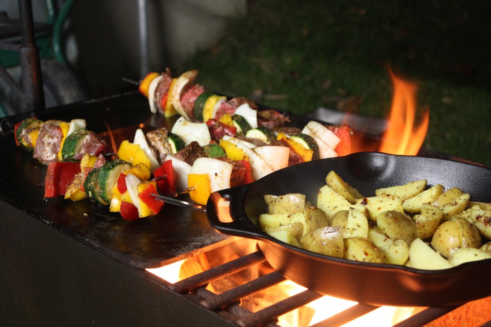 .Jetzt geht es raus an die Westernküche. Ein ordentliches Feuer wird entfacht, und die Grillplatte auf der einen, und der Rost aus der anderen Seite aufgelegt. Die Grillplatte wird etwas eingeölt und die Spieße werden aufgelegt. Die Pfanne wird auf den Rost gestellt und die Kartoffeln knusprig angeröstet. Nach mehrmaligem Wenden sind die Spieße nach ca. 15 Minuten fertig. Das Fleisch sollte in der Mitte noch rosa sein und das Gemüse noch etwas Biss haben. Kurz vor Ende der Garzeit die Spieße mit etwas geriebenem Parmesan bestreuen.