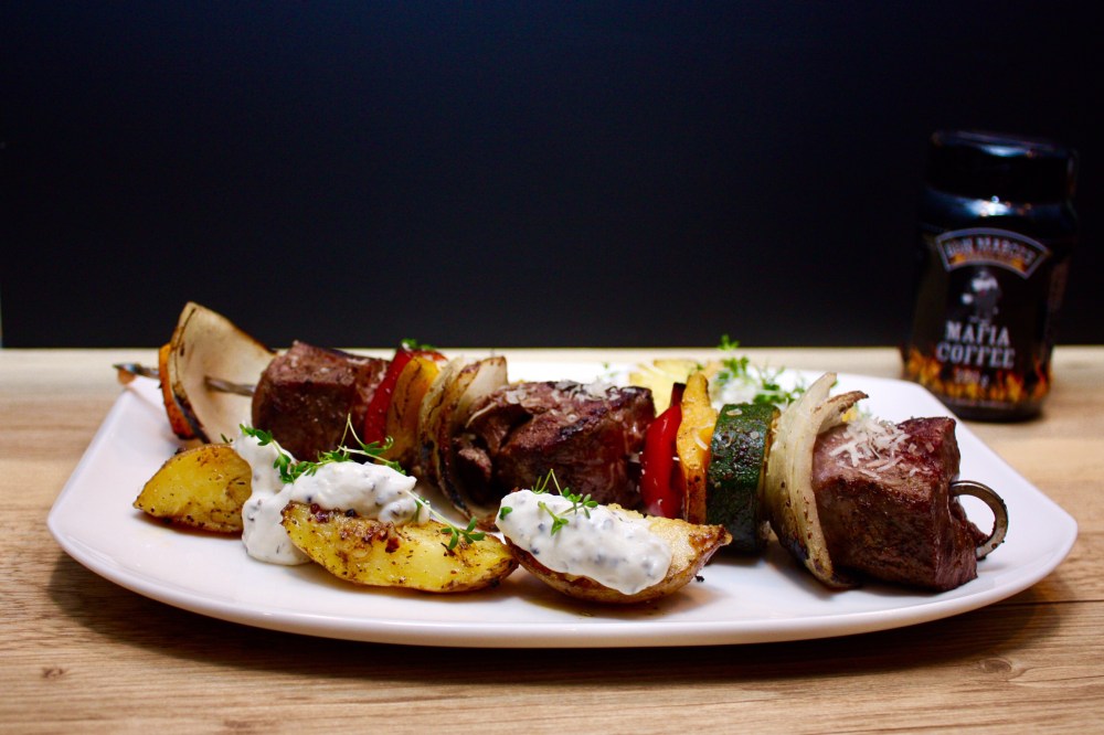 Die Spieße mit etwas Olivenöl beträufeln und mit „Don Marcos Maffia Coffe Rub“ würzen. Die gekochten Kartoffeln ebenfalls mit etwas Olivenöl beträufeln und würzen. Ich habe dieses mal den Schafskäse Rub von Don Marco für die Kartoffeln ausprobiert. Passt super!