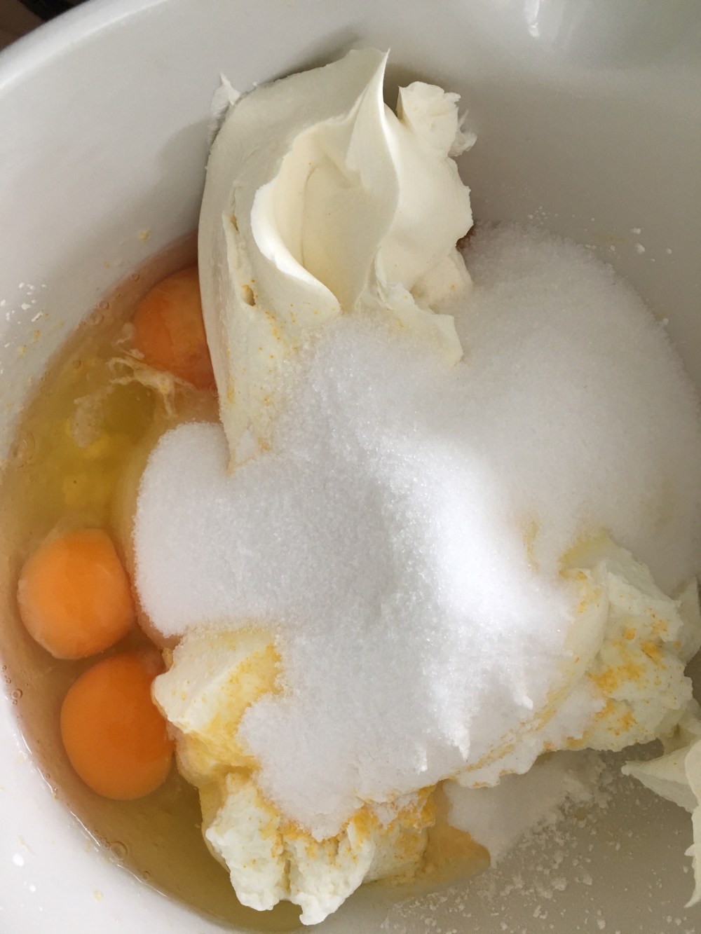 Die Kirschen abtropfen lassen. Den Quark, Frischkäse, 5 Eier, 150 g Zucker und Puddingpulver verrühren.