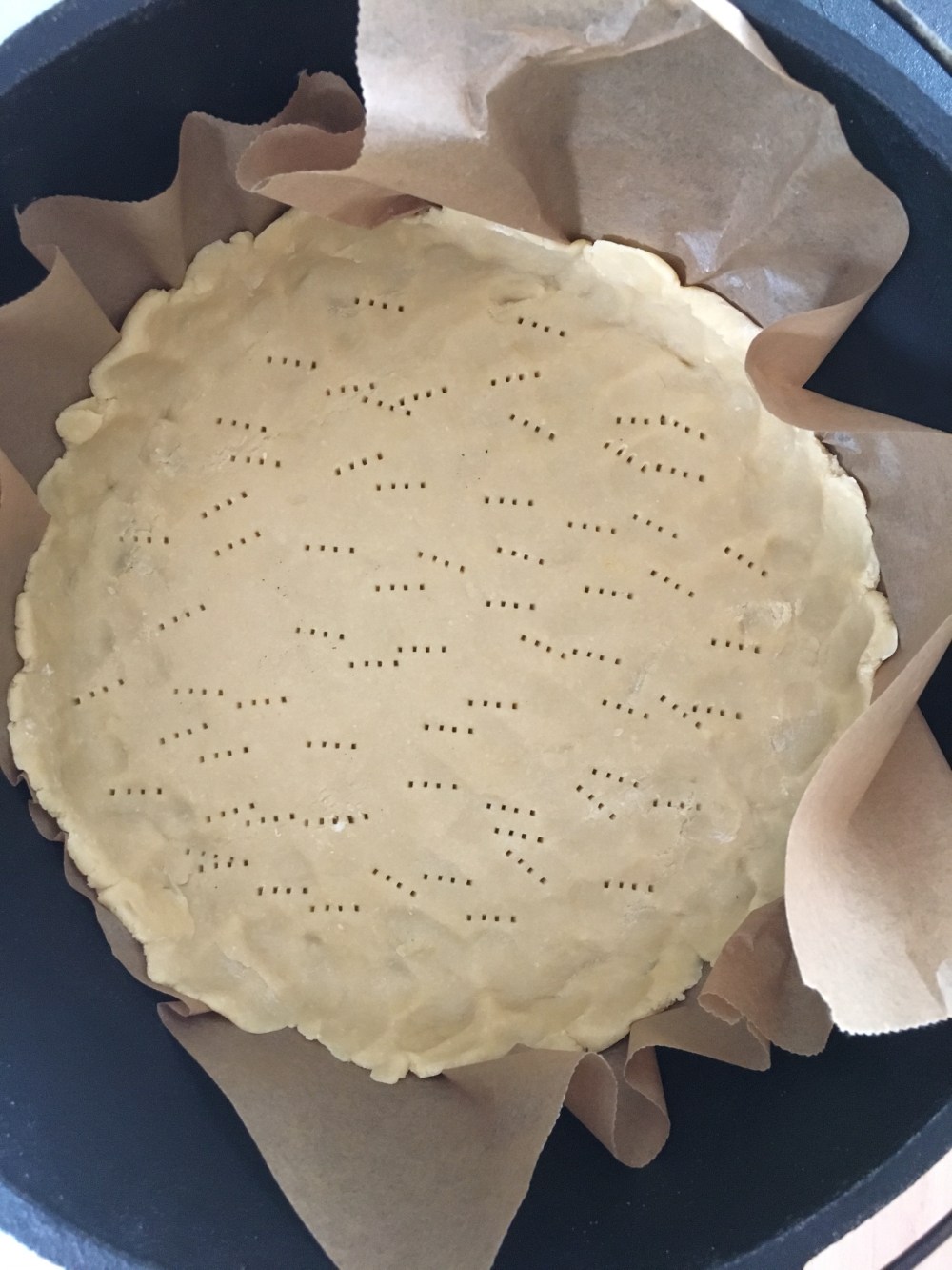 Dutchoven mit einem Bogen Backpapier auslegen. 250 g Mehl, Puderzucker, 1 Prise Salz, 1 Ei, 125 g Butter in Stückchen und evtl. 1 EL Wasser erst mit dem Handrührgerät, dann kurz mit den Händen glatt verkneten. Den Teig ca. 30 Minuten, in Frischaltefolie eingewickelt, kalt stellen.