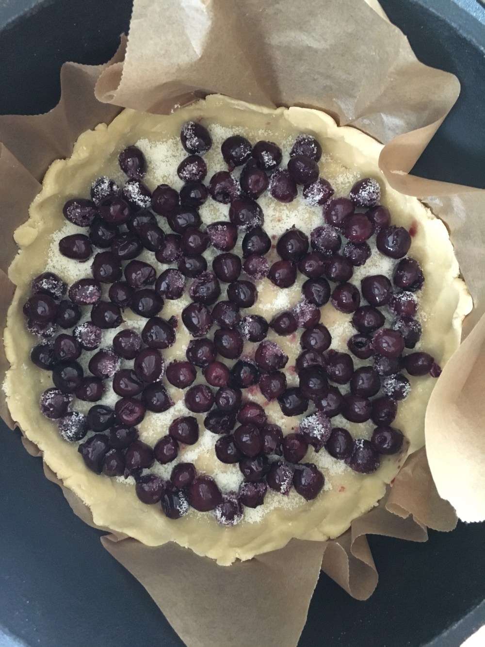 25 g Mandeln daraufstreuen und die Kirschen darüber verteilen.