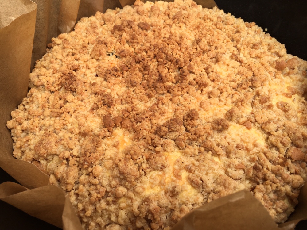 Amarettini grob zerbröseln. 100 g Mehl, 25g Mandeln, 50 g Zucker, 75 g Butter und 1 Eigelb erst mit dem Handrührgerät und dann kurz mit den Händen zu Streuseln verkneten. Amarettini daruntermischen. Streusel auf dem Kuchen verteilen, dabei zwischen den Fingern zerreiben.