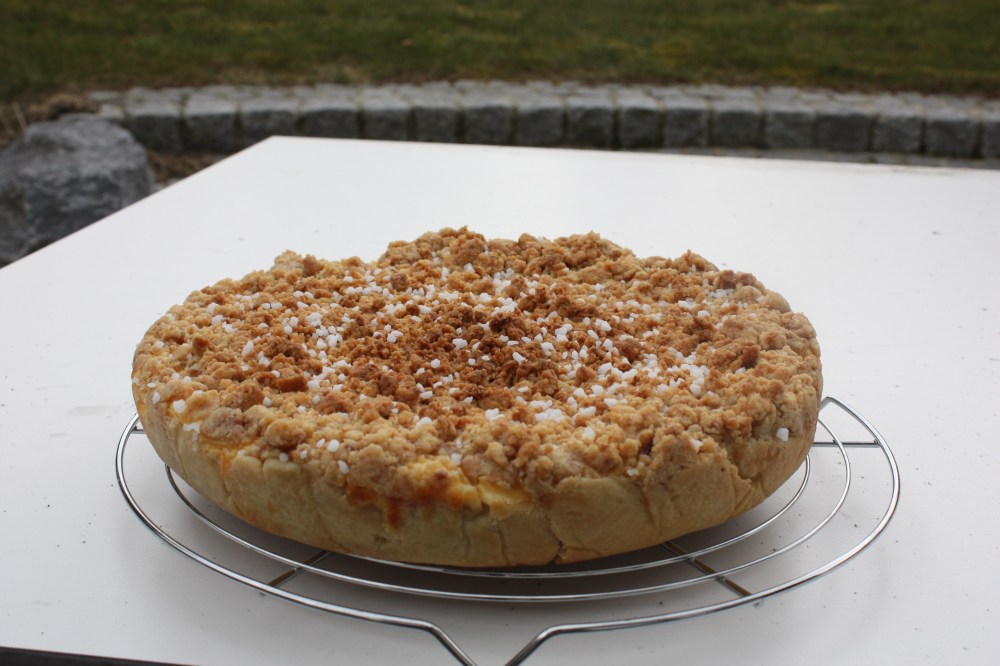 Quarkmasse darauf streichen. 20 Minuten mit 5 Briketts unten und 10 oben vorbacken.