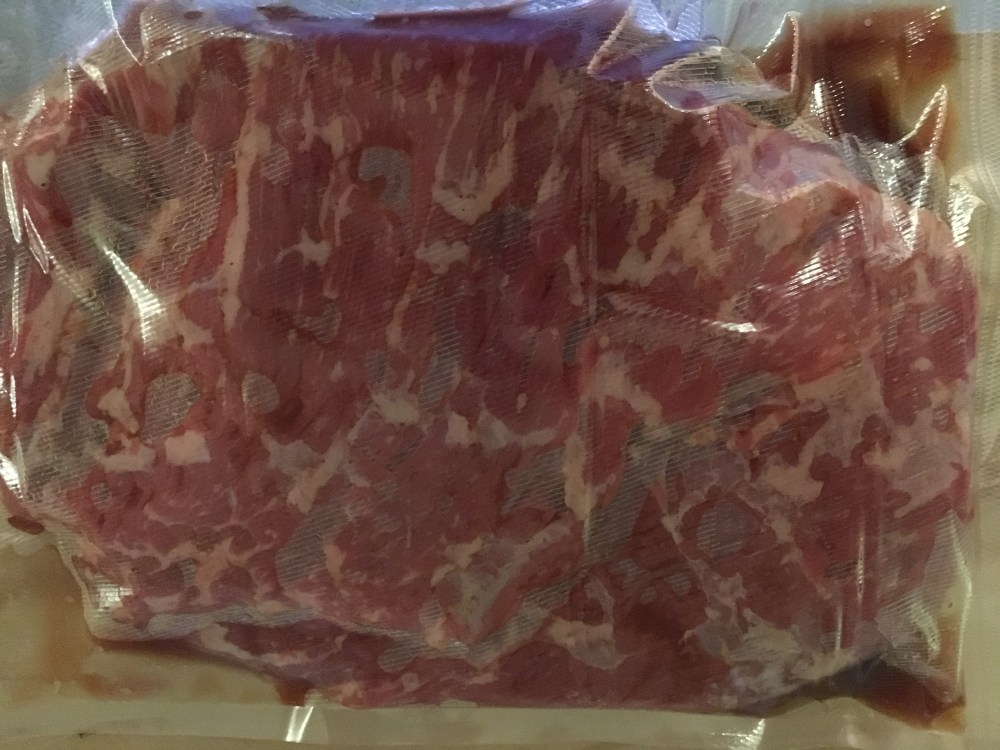 Anschließend wurde es mit einer Mischung aus Rinderfond, 2 El DonMarcos Texas Rub und 3 El Worchestersauce gespritzt und im Vakuum über Nacht mariniert.