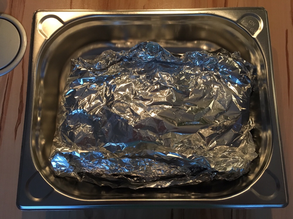 Nach 6 Stunden hatte das Brisket eine Kerntemperatur von 75 Grad erreicht. Das Fleisch wurde in eine Edelstahlschale gegeben, nochmals mit etwas Rub bestreut und ich habe einige Butterflocken auf das gute Stück gegeben. Zusätzlich wurden noch 300 ml Schweppes Ginger Ale und etwas Rinderfond angegossen, um die Brust im Dampf weiterzugaren. Dazu habe ich die Schale mit Alufolie dicht verschlossen. Der Smoker wurde auf 140 Grad eingestellt und die Schale zurück in den Smoker gegeben. Nach ca. 2 weiteren Stunden hatte das Brisket 94 Grad erreicht. Das Fleisch wurde aus der Schale befreit und dicht in Alufolie eingewickelt 1,5 Stunden in einer Styroporbox warmgehalten. (Leider habe ich dazu keine Fotos)